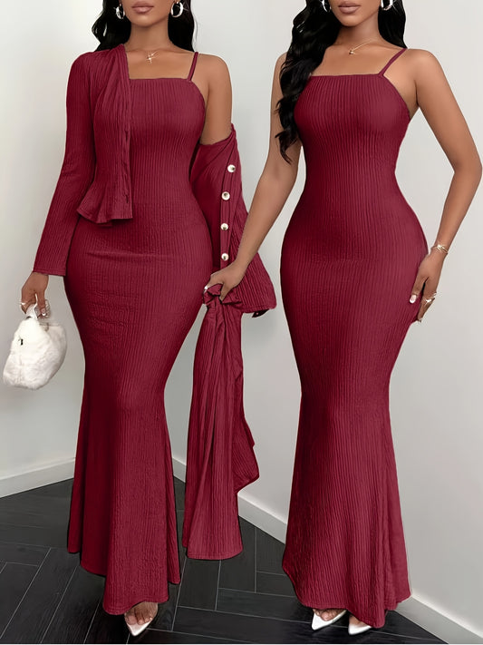 • 2pcs Elegant Red Satin Robe and Sleepwear Set for Women - Fall/Winter Collection, Sexy & Comfortable Loungewear with Pendant Neckline, Crew Neck, Two-Piece Se