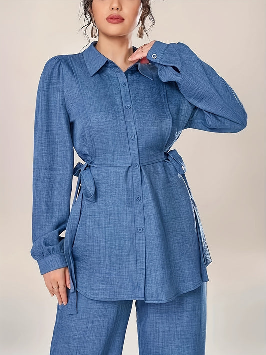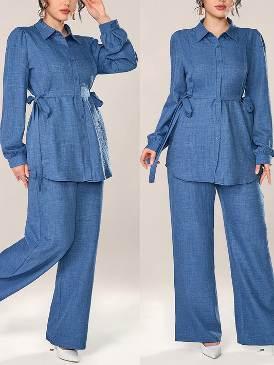 • Stylish and Elegant Casual Two-Piece Women's Outfit with Side Tie Single-Breasted Shirt and Wide-Leg Pants for Office Wear