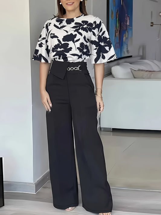 Women's Elegant Printed Short Sleeve Round Neck Shirt and Long Pants Set