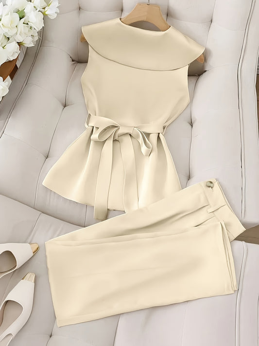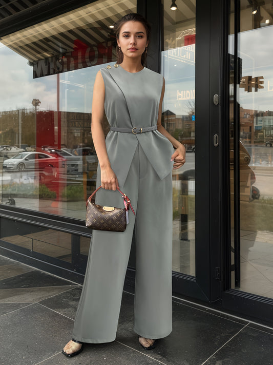 • Stylish Women'S Elegant Modern Two-Piece Set with Side-Waist Design, Solid Color Sleeveless Jacket and Pants for Spring/Summer