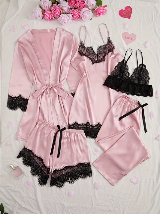 Women'S Elegant Mesh-Trimmed Long Sleeve & Pants Pajama Set - Soft Satin-Like Fabric, Deep V-Neck with Ruffled Cuffs, All-Season Comfort for Home & Relaxation, Relaxation Attire | Elegant Pajama Set | Satinlike Fabric