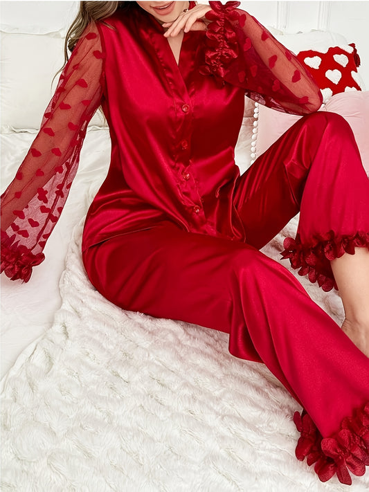 • Women'S Elegant Mesh-Trimmed Long Sleeve & Pants Pajama Set - Soft Satin-Like Fabric, Deep V-Neck with Ruffled Cuffs, All-Season Comfort for Home & Relaxation, Relaxation Attire | Elegant Pajama Set | Satinlike Fabric