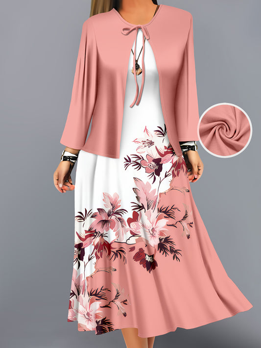 • Fashion Women's solid color small cardigan and floral print patchwork dress two-piece set