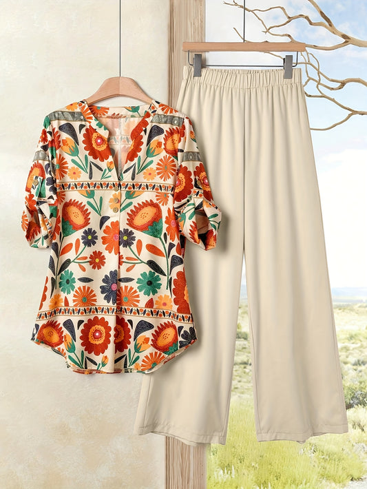 • Casual Country Print Pattern Loose Short Sleeve Top and Pants Two-Piece Set Summer Clothes, Elegant Summer Evening Mist