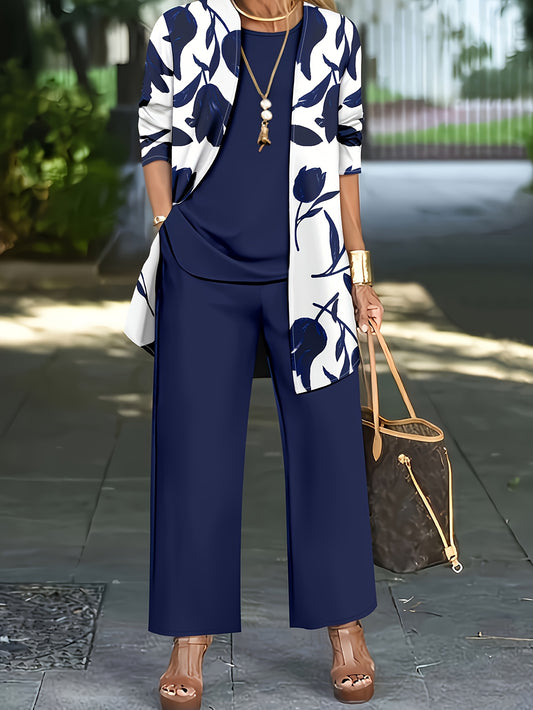 • Plus Size, A three-piece set of elegant and unique female plus-size floral printed top and solid-colored vest and trousers
