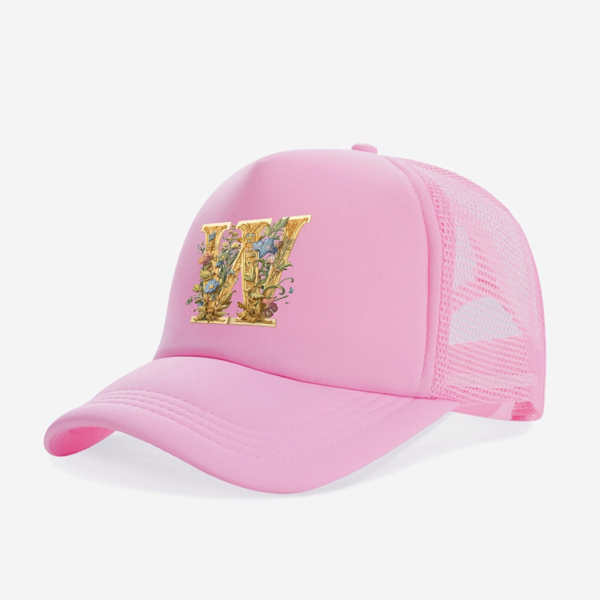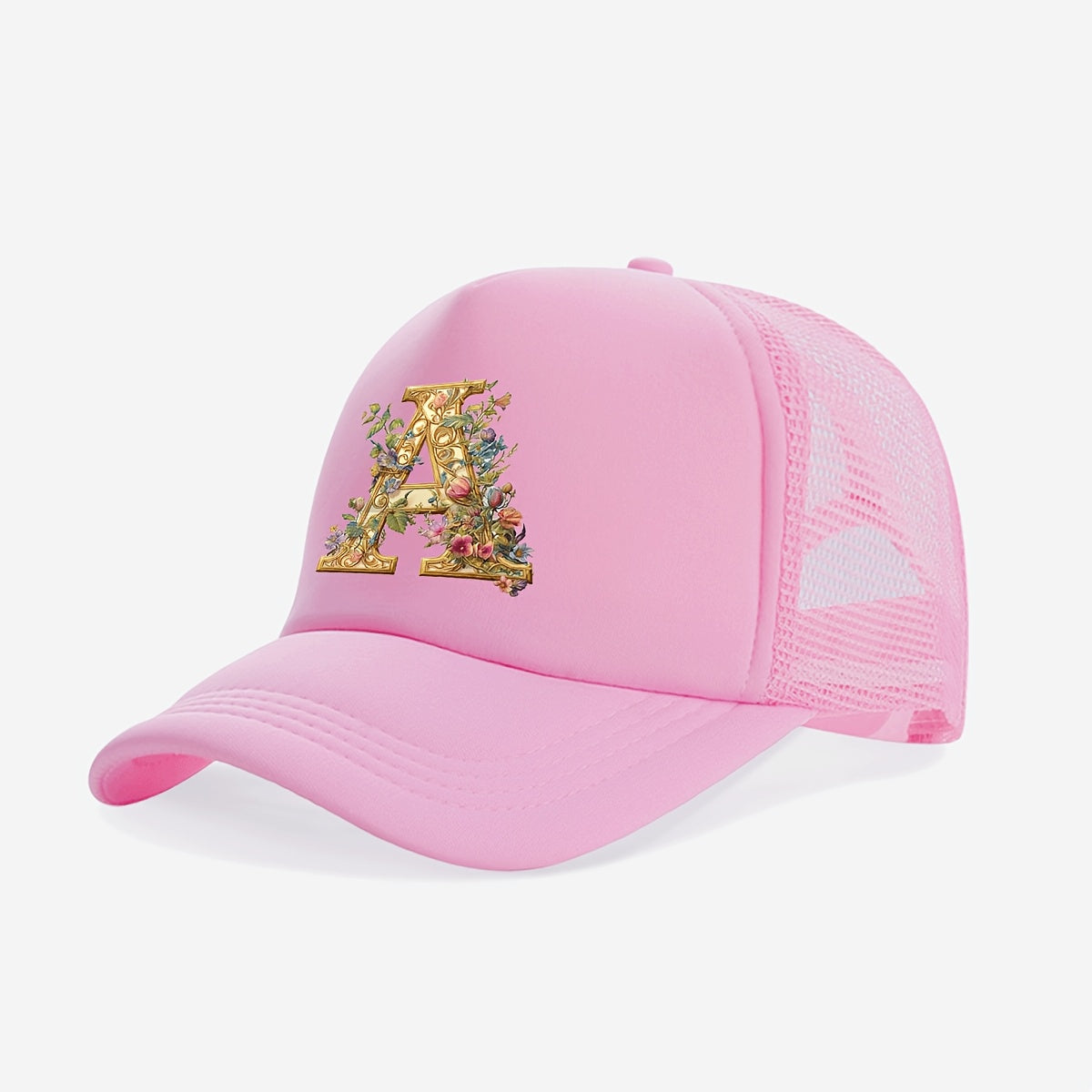 1-Pack Youngsters Trucker Hat with Golden Floral Letter A Design - Breathable Sun Protection, 100% Polyester, Adjustable Snap Closure, Pink for Spring/Summer Outdoor Play, Back to School, Thanksgiving, Teacher's Day (Ages 3-1