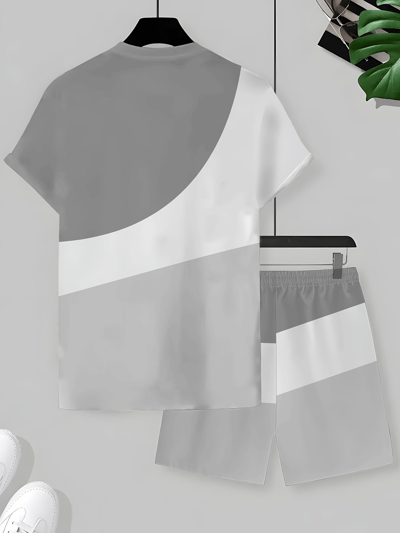 1 Set of 2pcs 3D Letter Print Fashion Tri-Color Men's Summer Fresh T-Shirt and Shorts Set, Slightly Stretchy Polyester Knit Fabric, Regular Fit, Suitable for Outdoor Activities and Family Gatherings