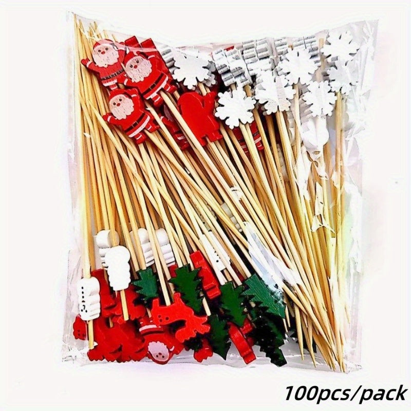 100pcs Festive Christmas Fruit Skewers with Santa, Reindeer, Snowflake & Tree Designs - Disposable Bamboo Picks for Parties, Desserts, Cocktails & Hamburgers, Christmas Dessert Decorations, Durable Fruit Skewers
