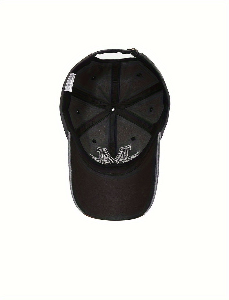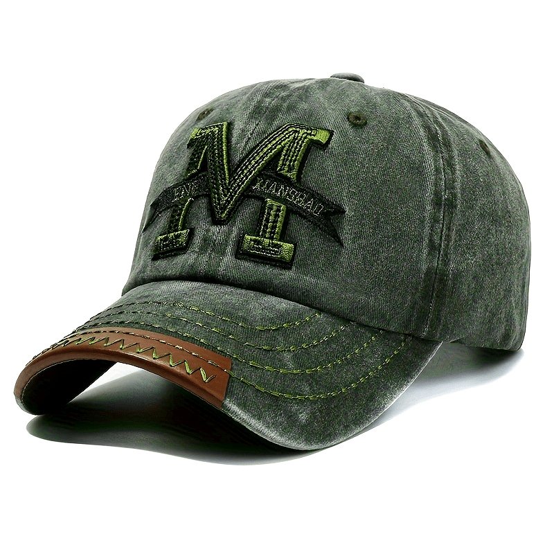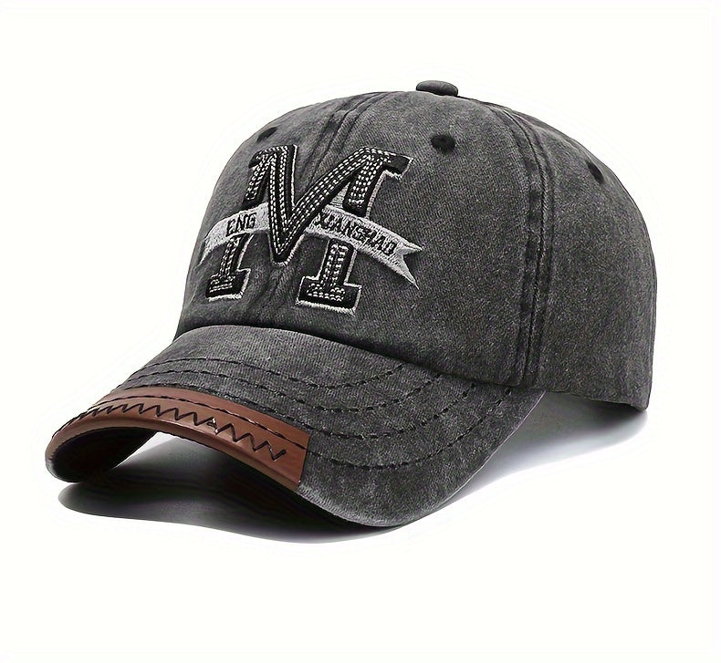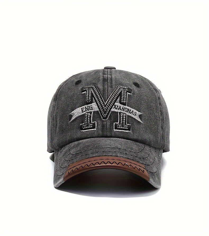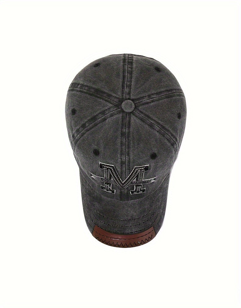 1pc Vintage Washed Cotton Baseball Cap with Embroidered Letter "M" - Adjustable Snapback, Lightweight Sun Hat for Men & Women, Black with Brown Band, Adjustable Baseball Cap