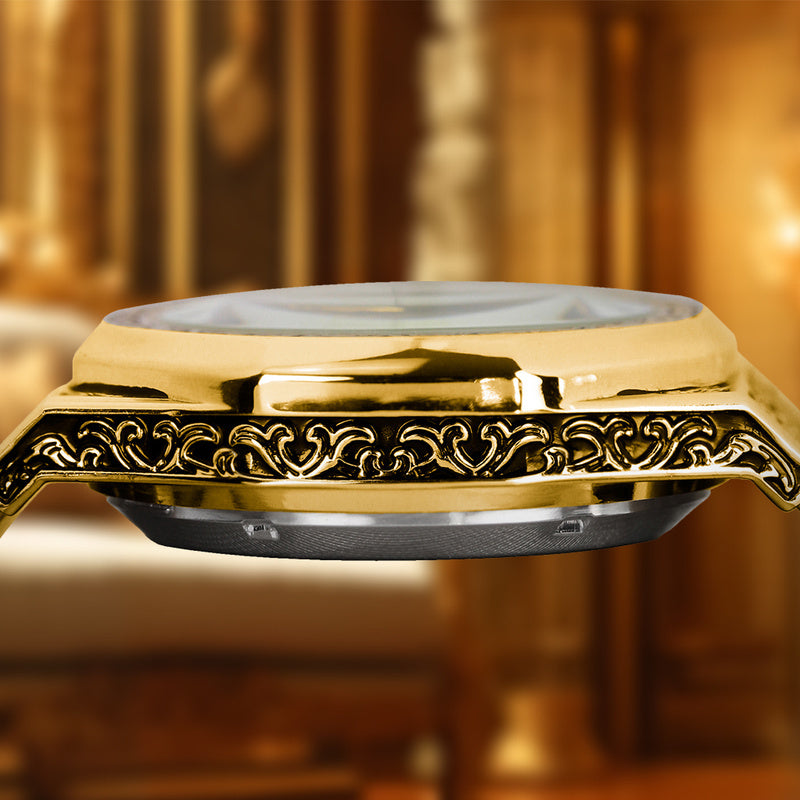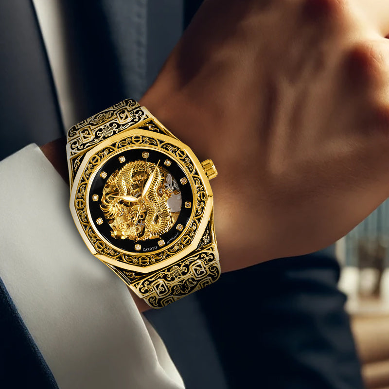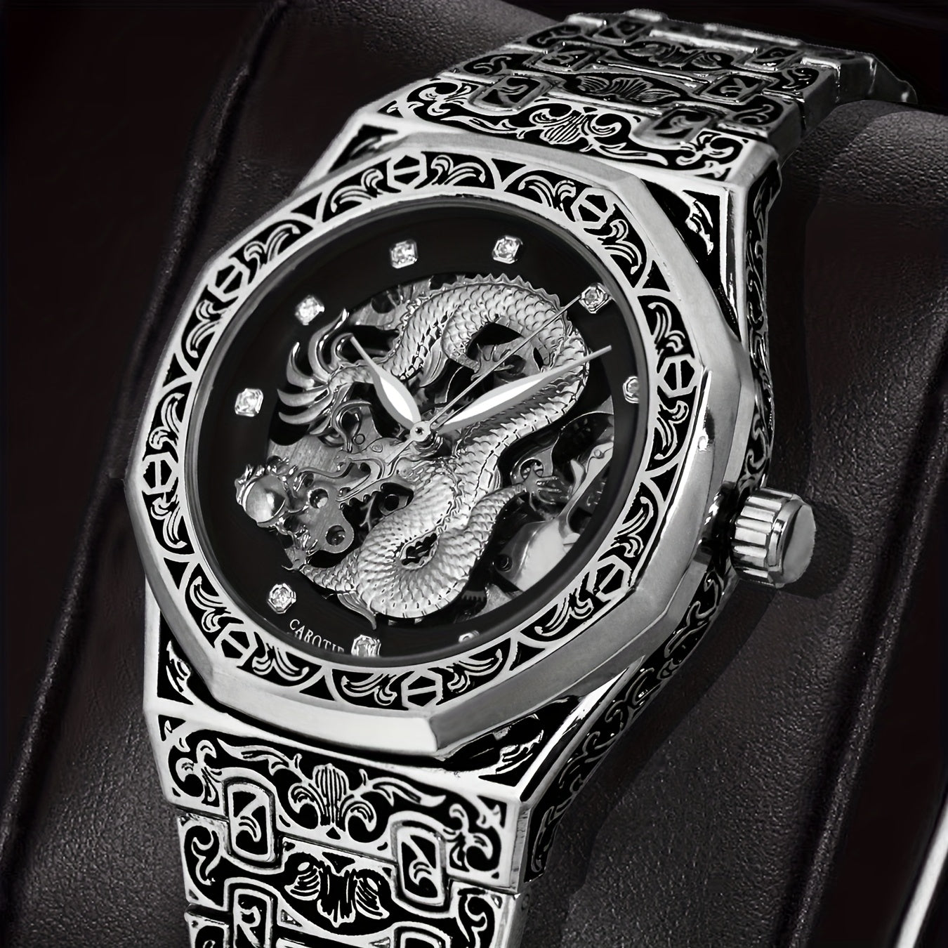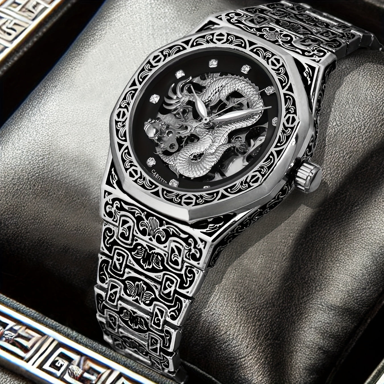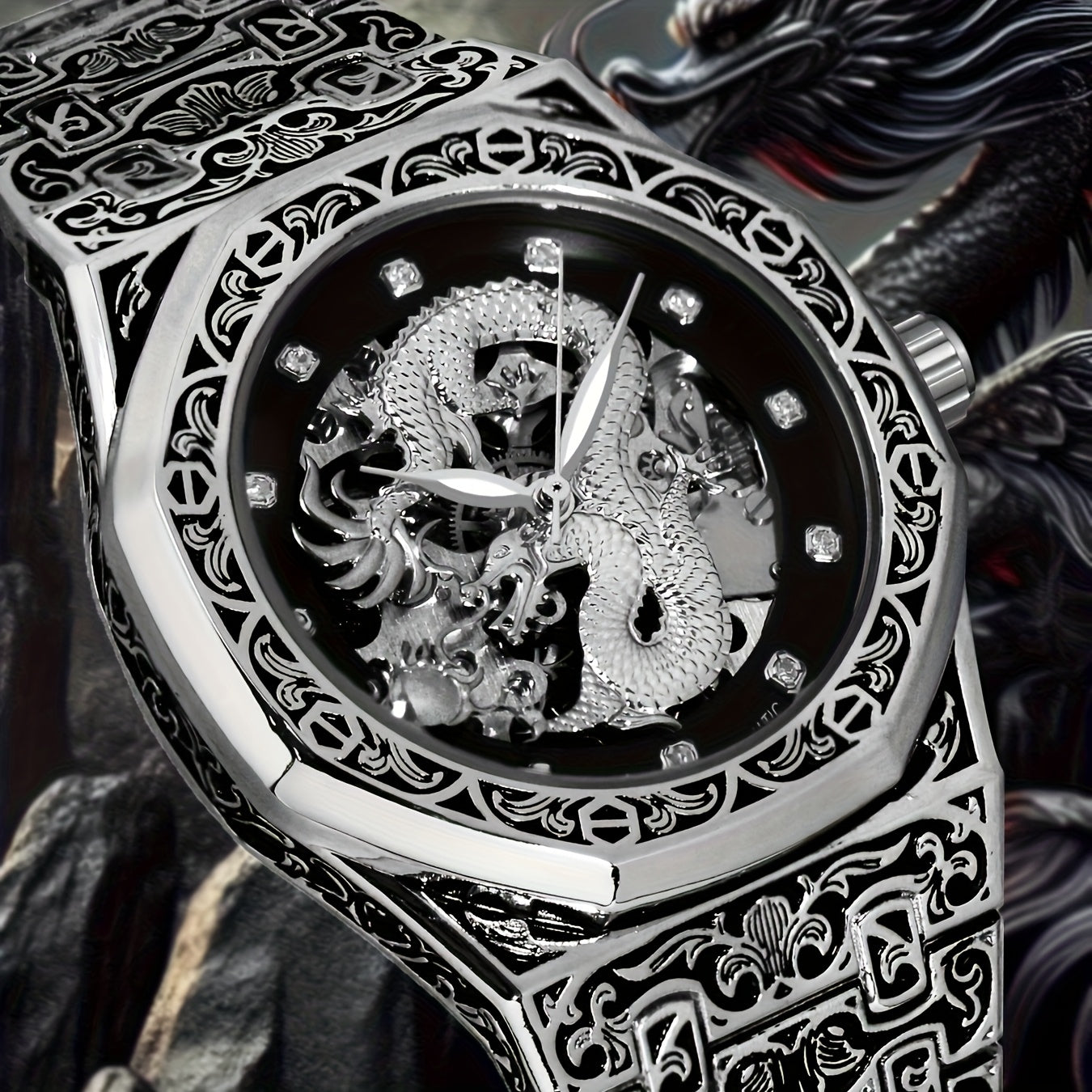 1pc Youth Men's Yellow Steel Strap Business Style Elegant Glow-in-the-Dark Carved Dragon Mechanical Watch