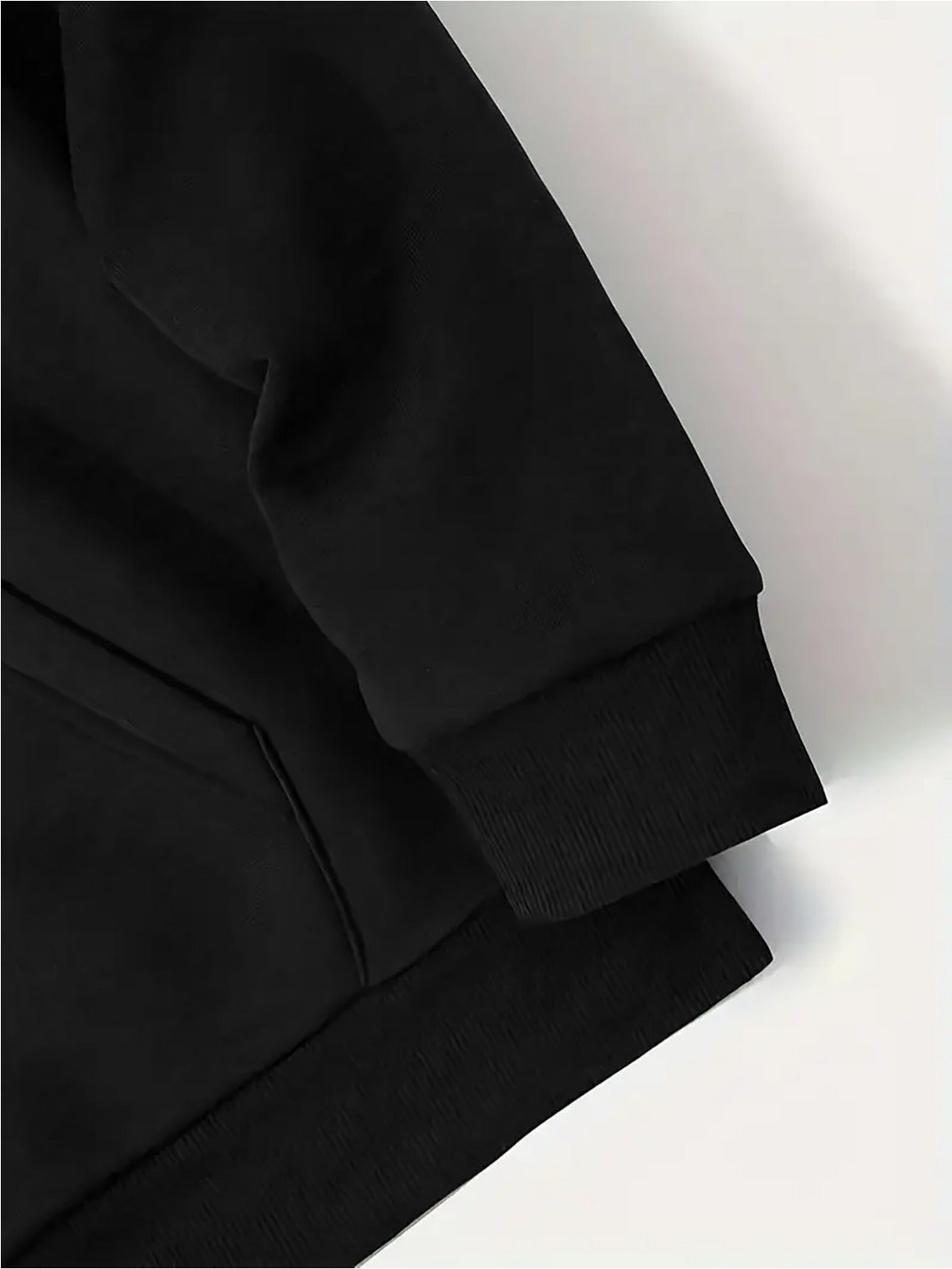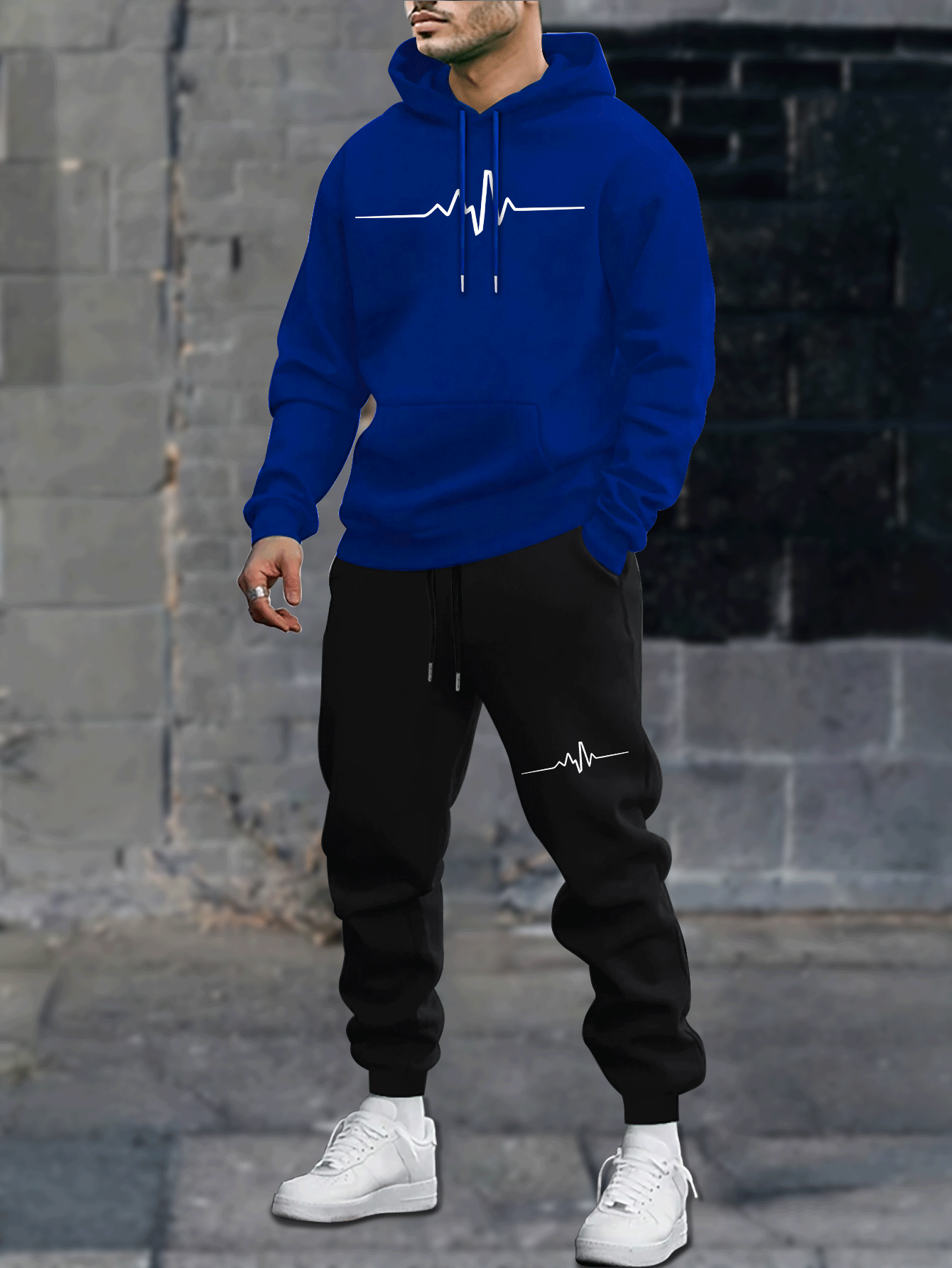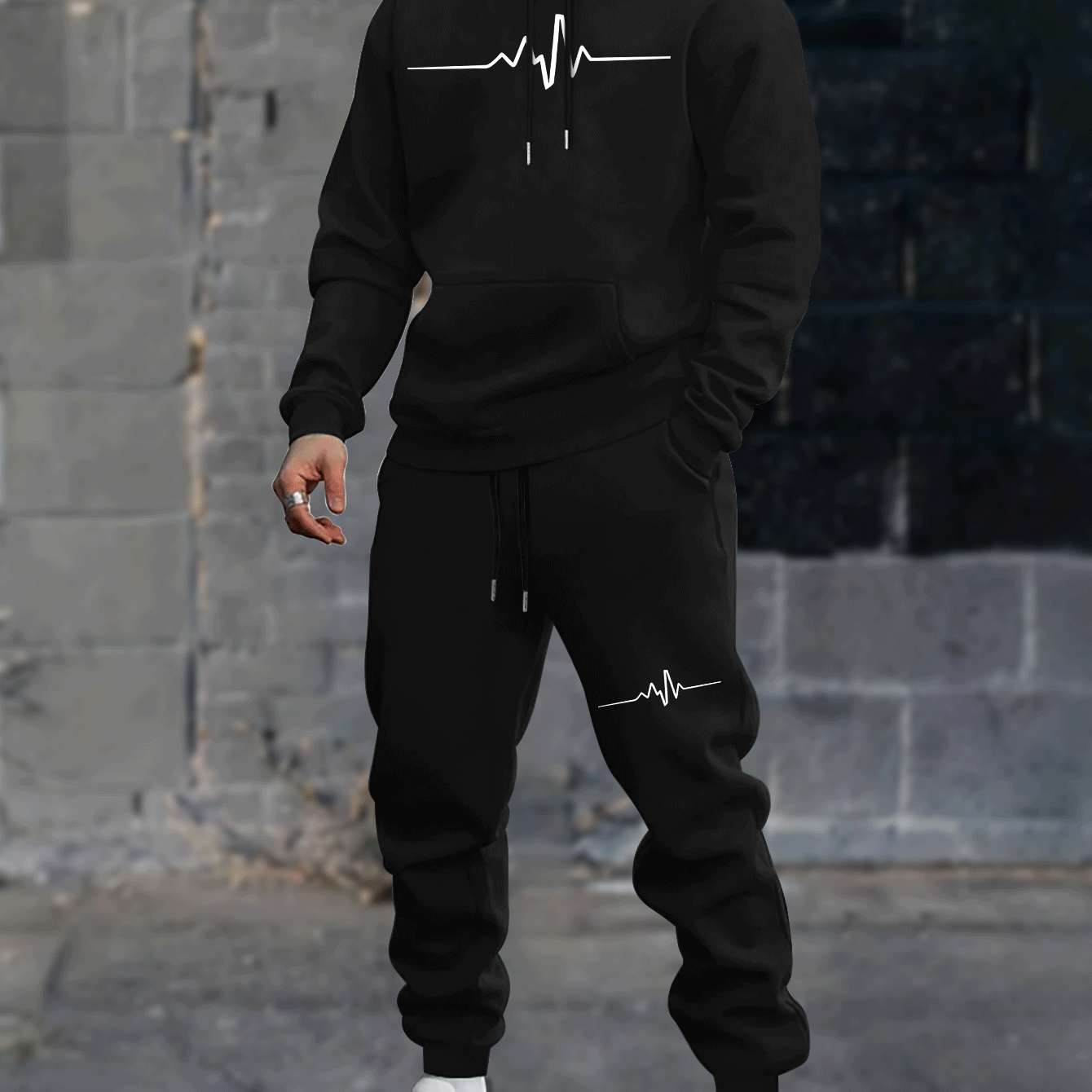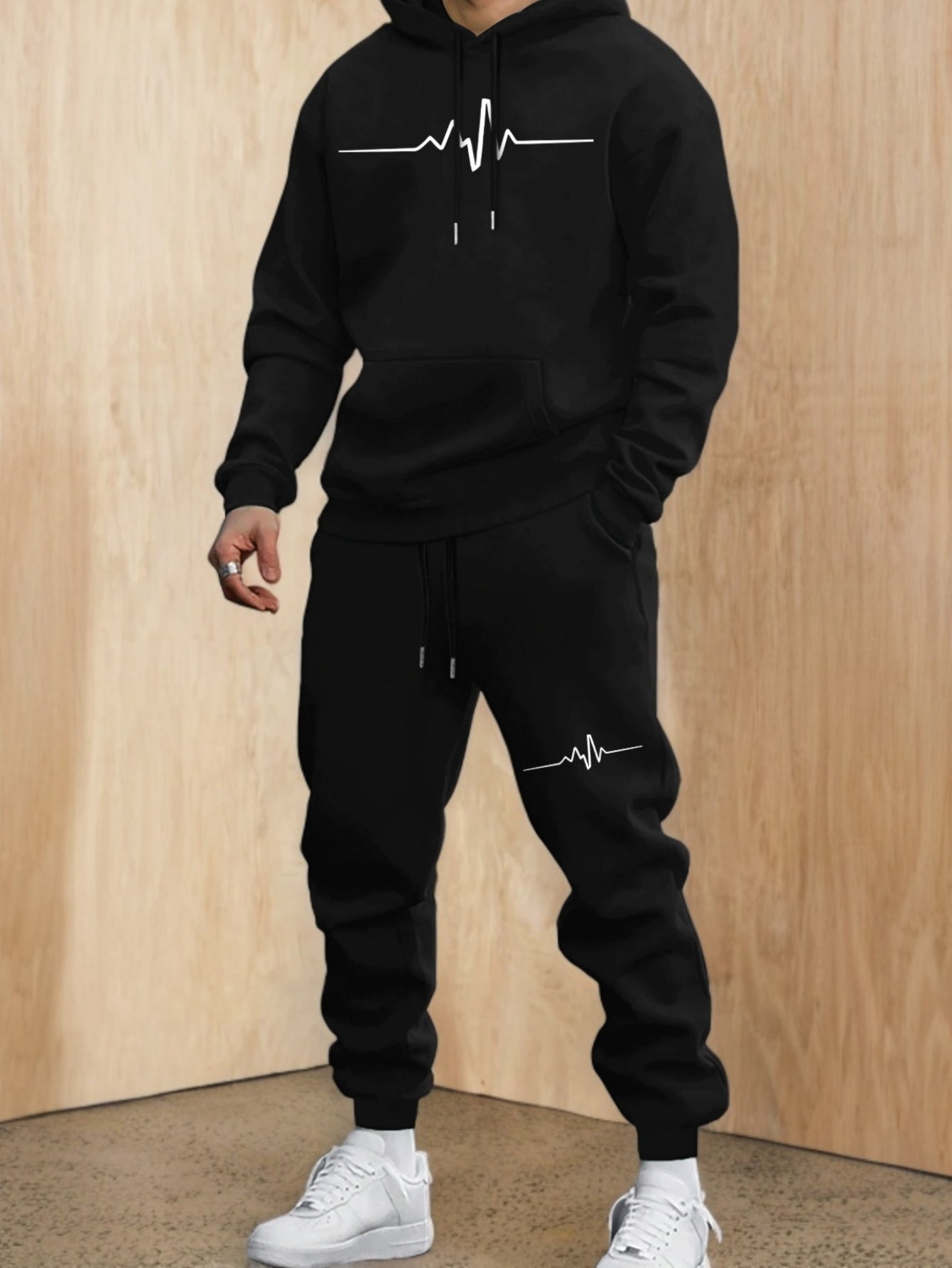 1set Men'S Casual Geometric Heartbeat Pattern Hoodie and Sweatpants Set, Polyester and Spandex Blend, Loose Fit, Hooded Pullover for Autumn/Winter