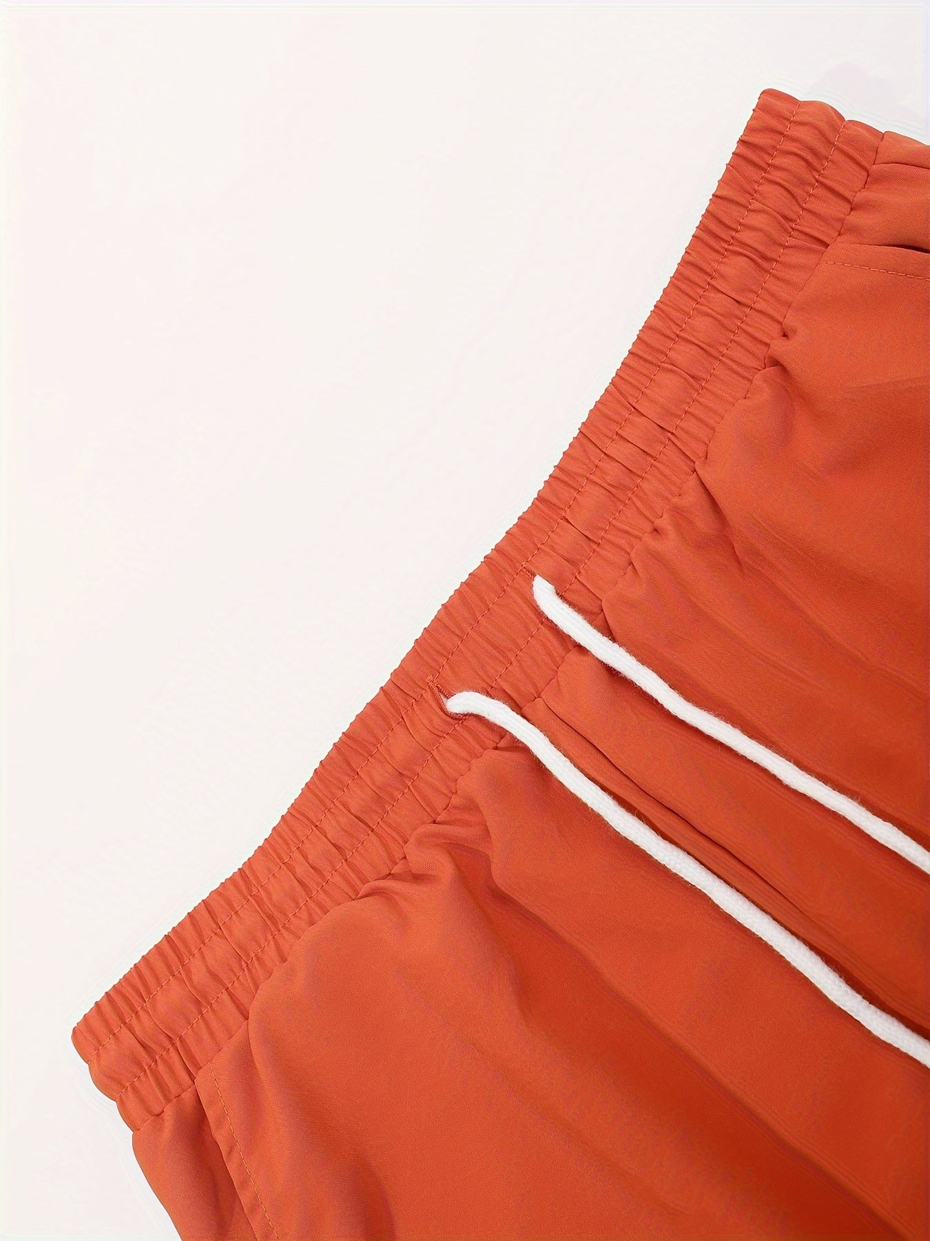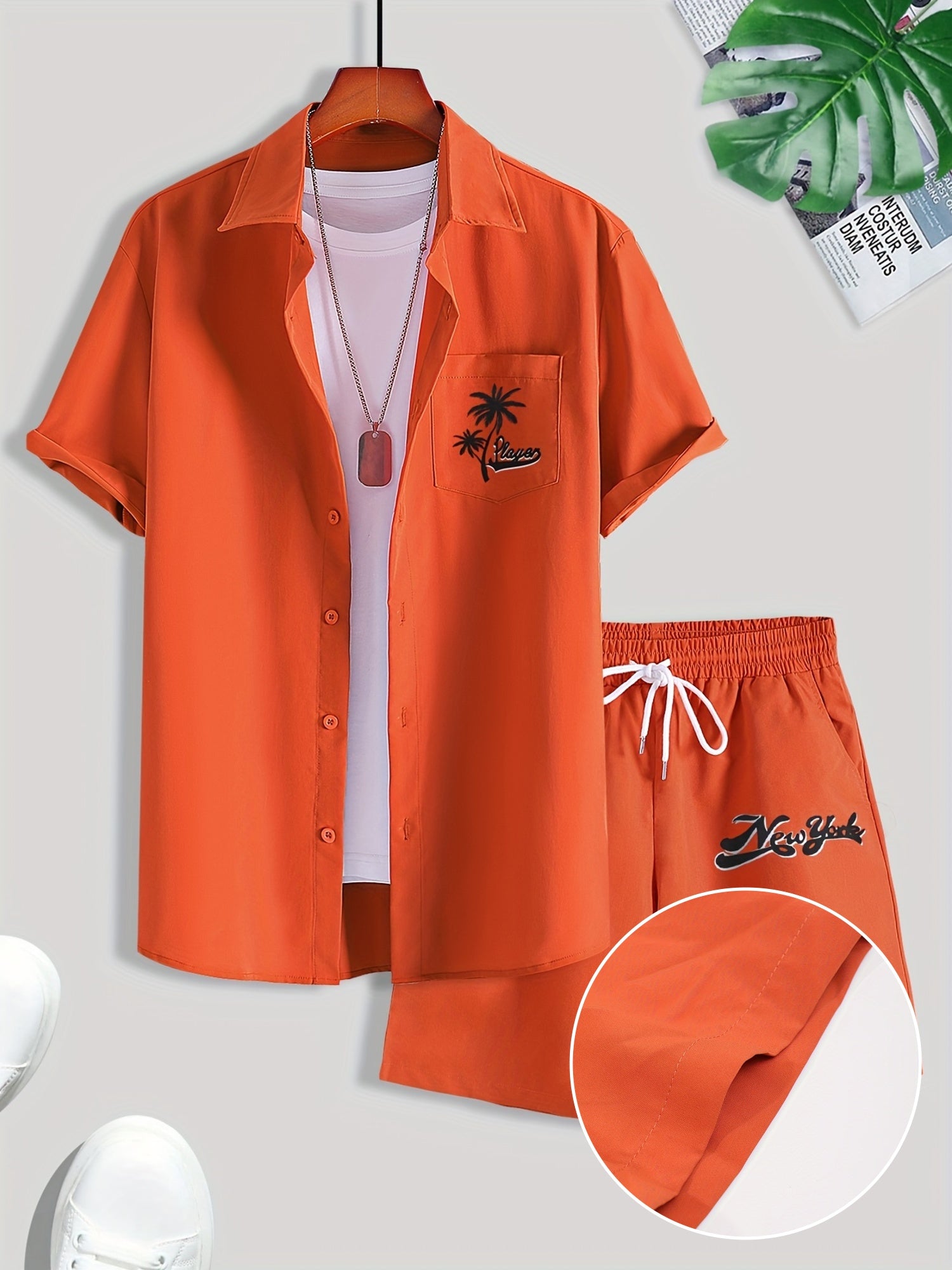 2-piece Men's Stylish Summer Beach Wear Set, Letter Print Men's Short Sleeve Lapel Shirt With Chest Pocket & Drawstring Shorts Co Ord Se