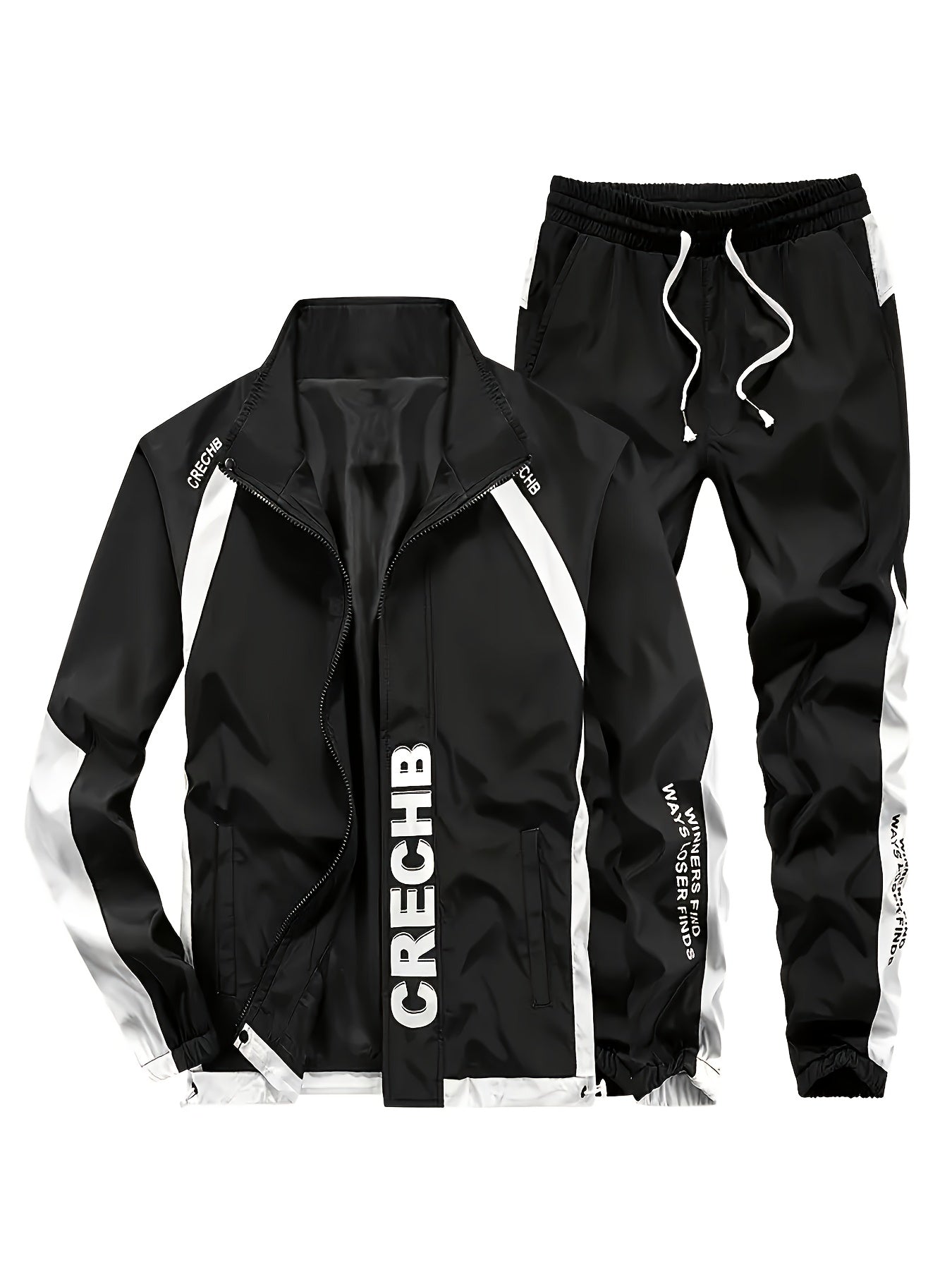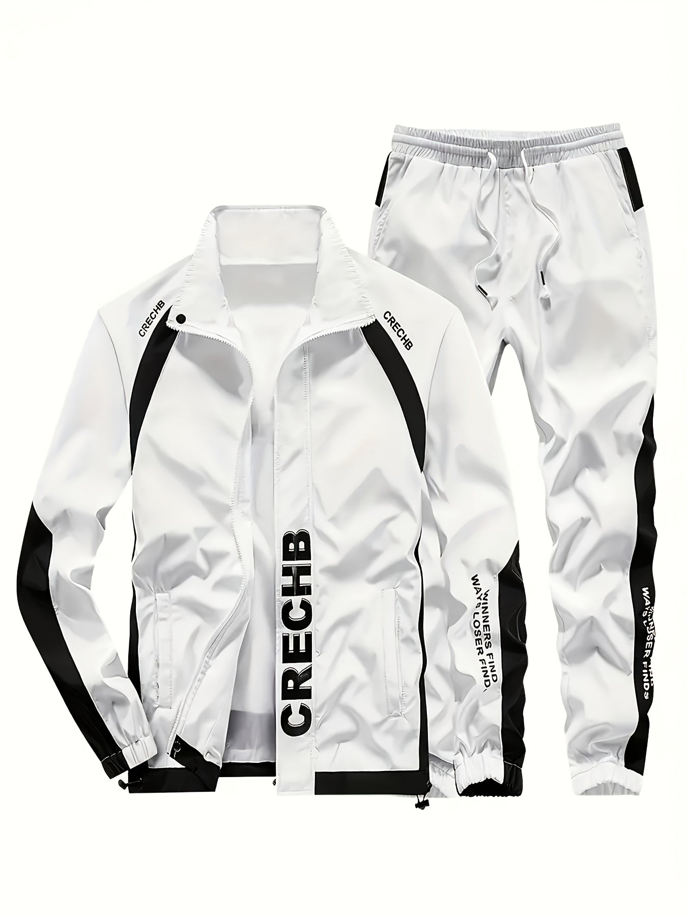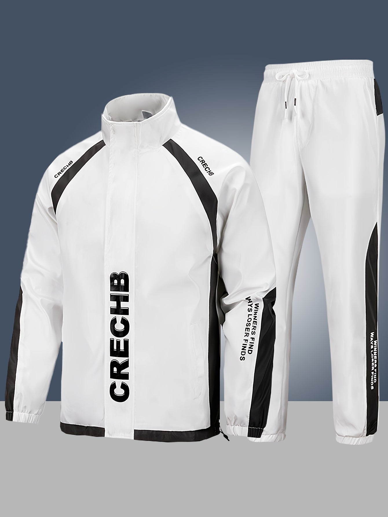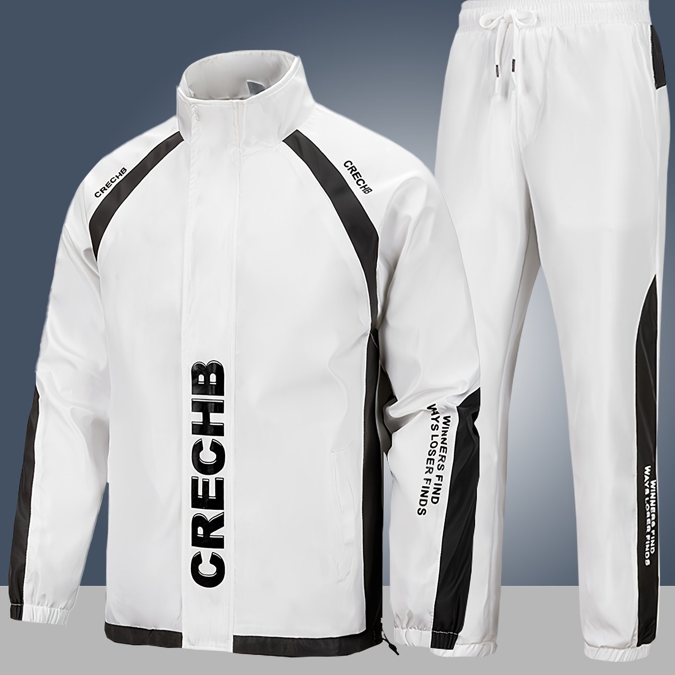 2025 New Casual Sports Set Men'S Spring and Autumn New Trendy Print Jacket, 100% Polyester, Soft Fabric Machine Washable, Casual Sports Loose Running Suit 2pcs Set, For Teenager