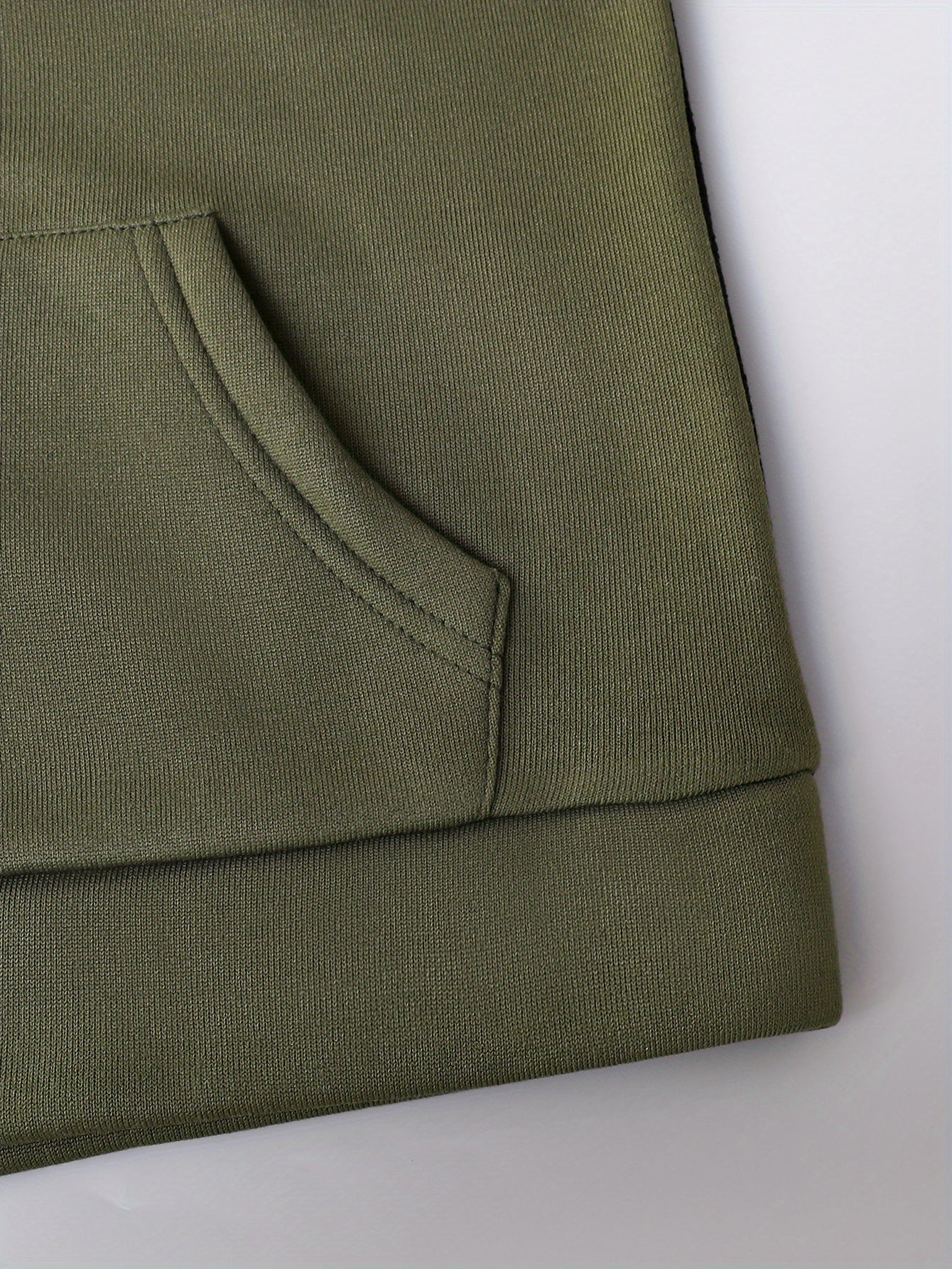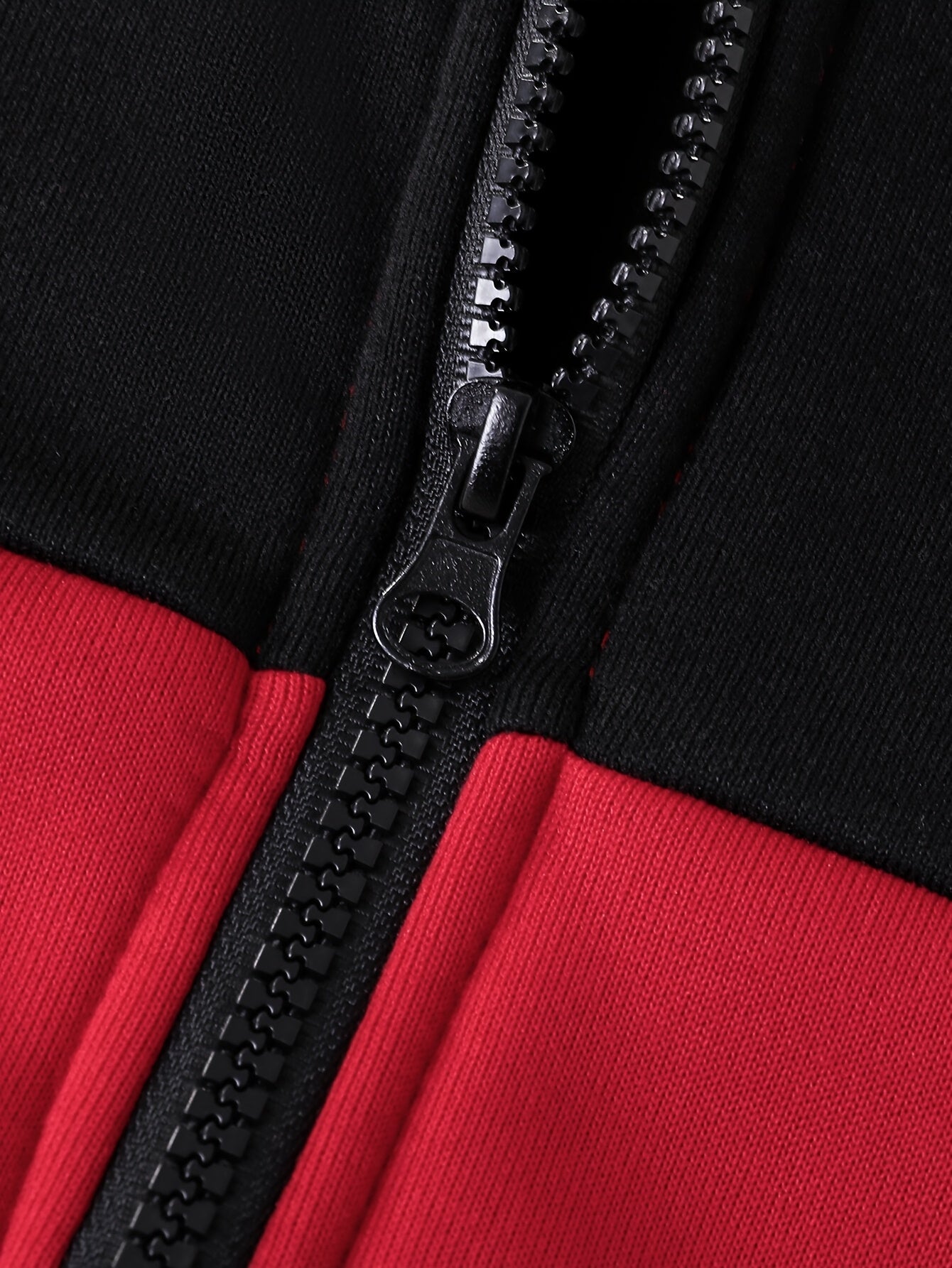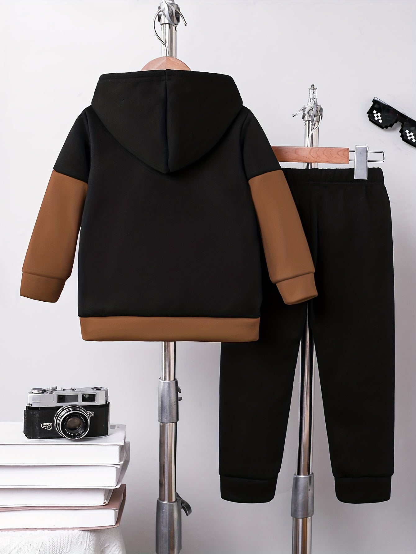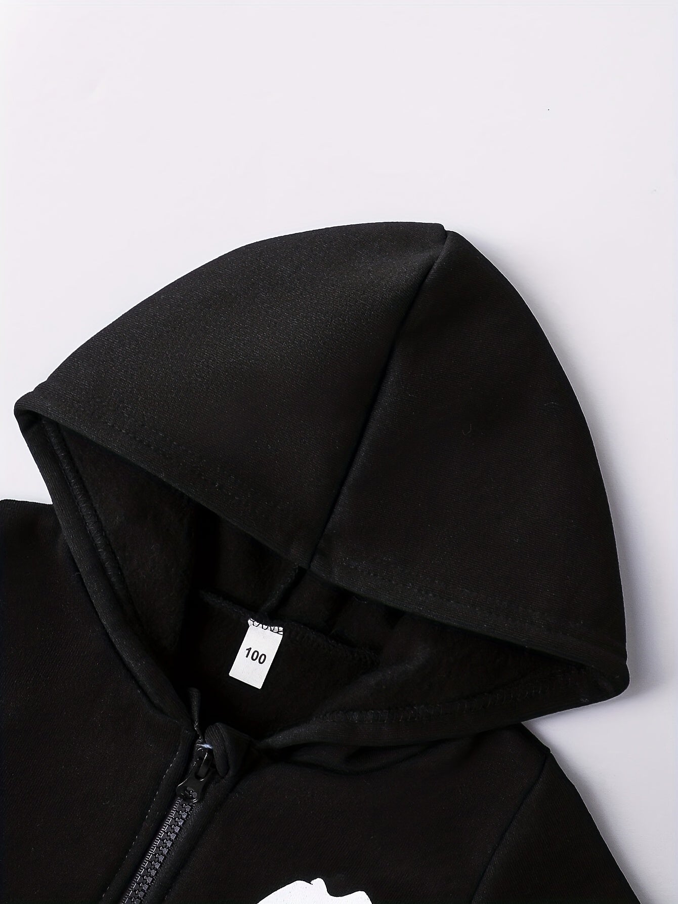 2pcs Boys' Autumn/Winter Fleece-Lined Hooded Zip-Up Jacket and Pants Set with Bird Print, Simple Color Block Design with Pockets, Fashionable Sporty Outfit for Outdoor Activities and Daily Wear, 100% Polyester Knit Stretch Fa