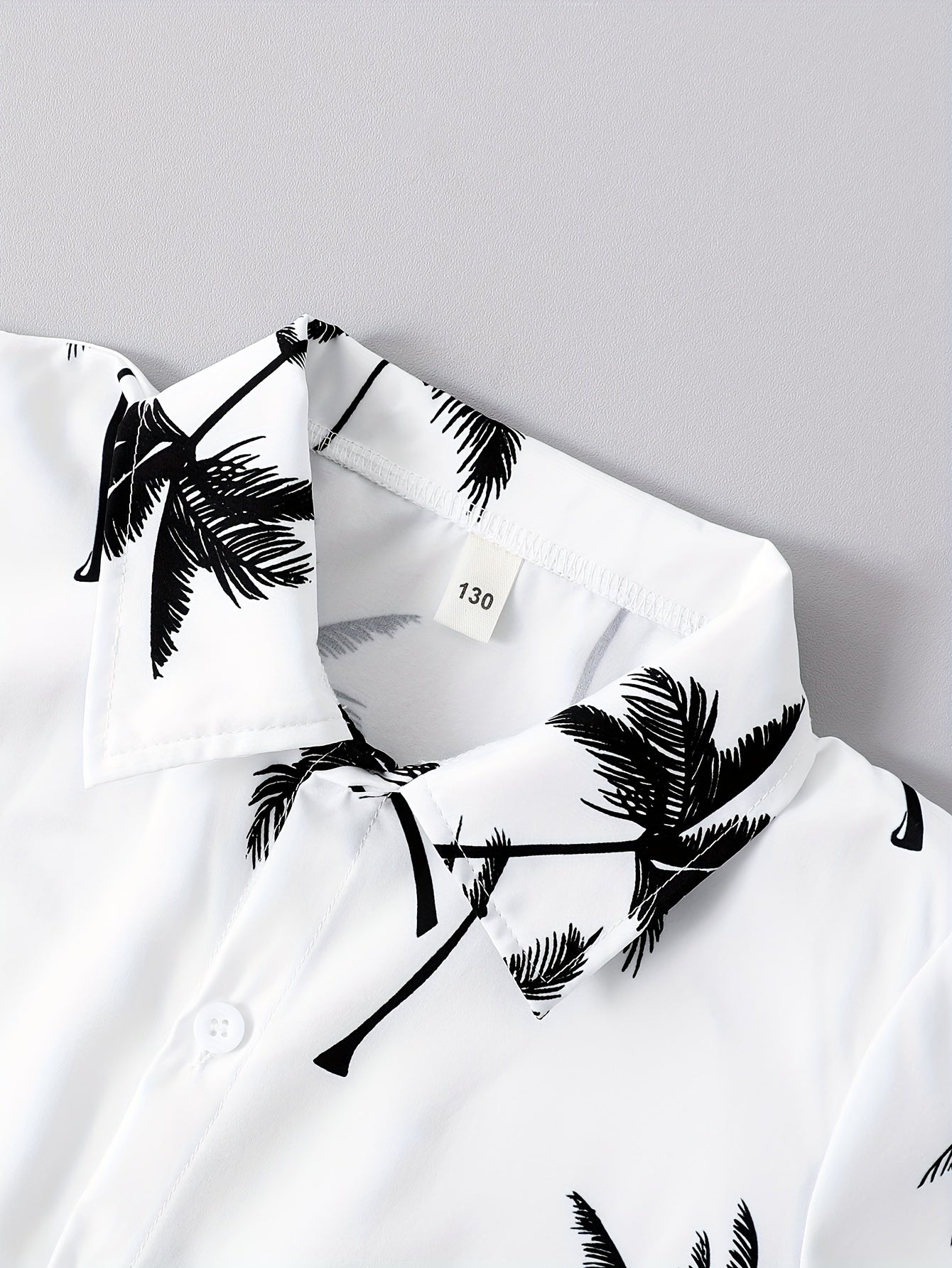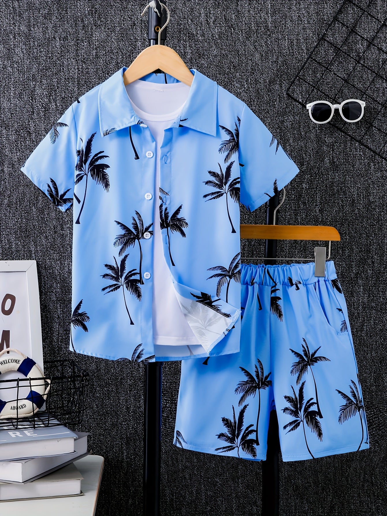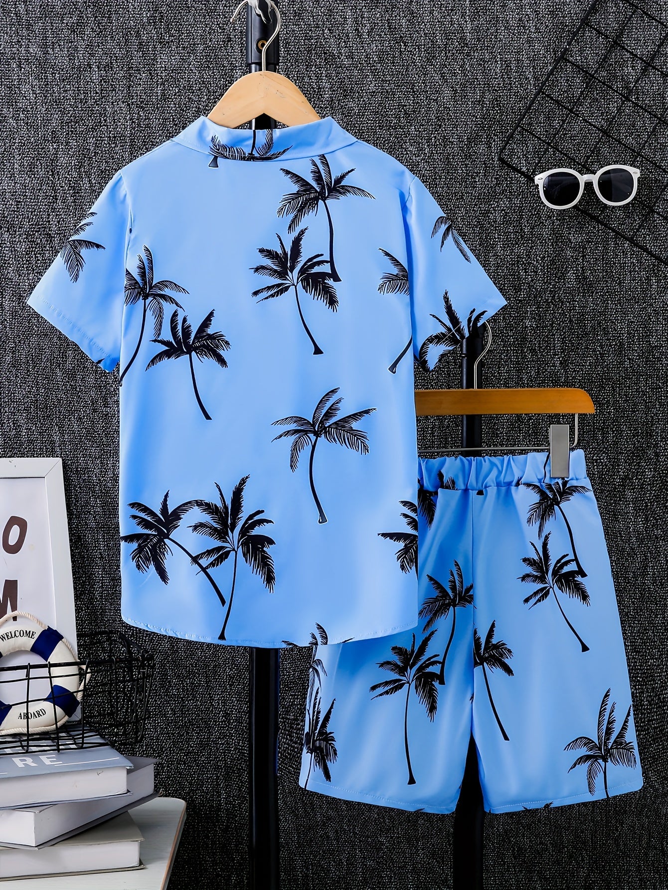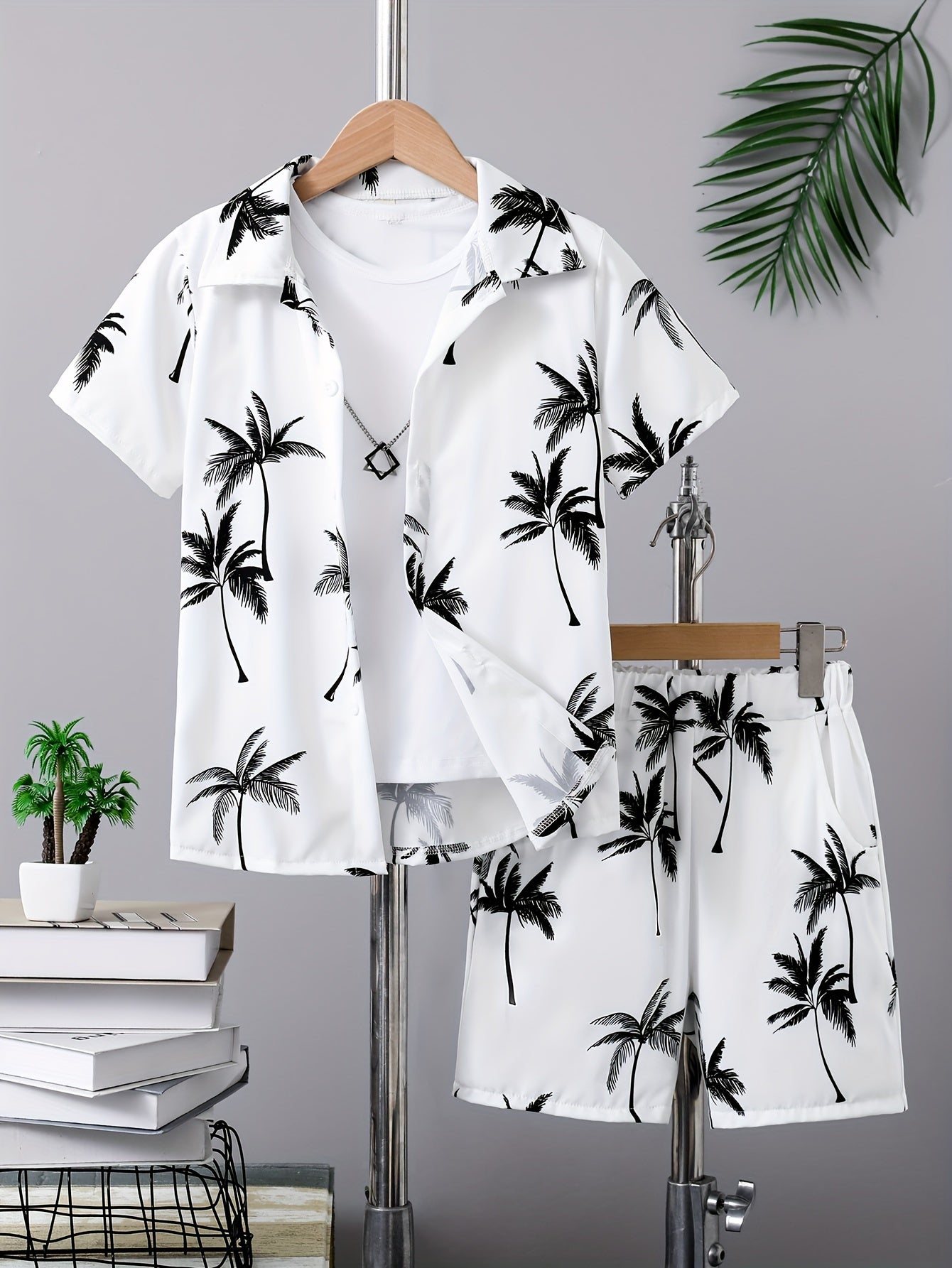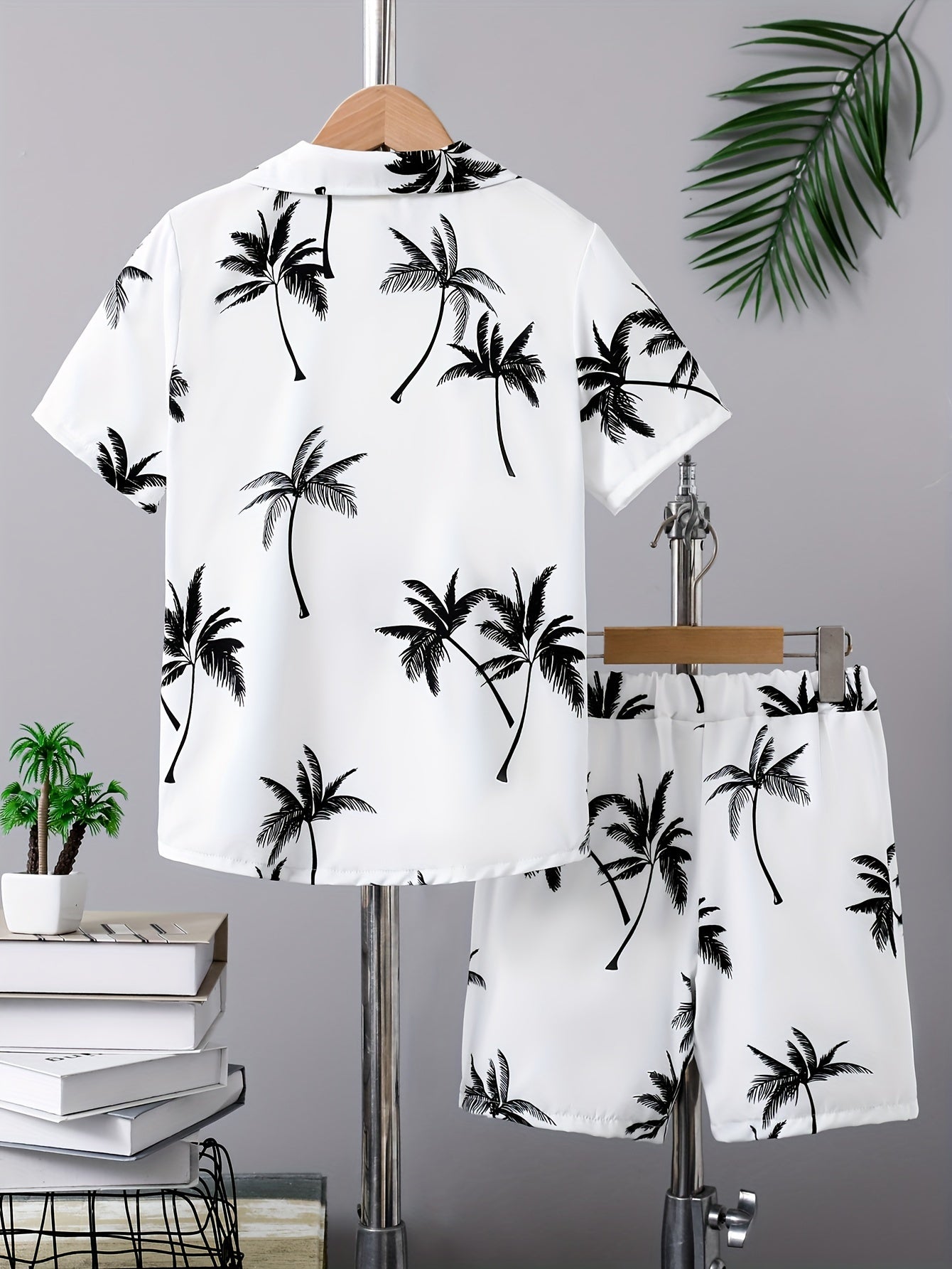 2pcs Boys Casual Coconut Tree Graphic Print Short Sleeve Lapel Shirt & Shorts Set, Comfy Summer Boys Clothing For Daily & Outdoor Wear