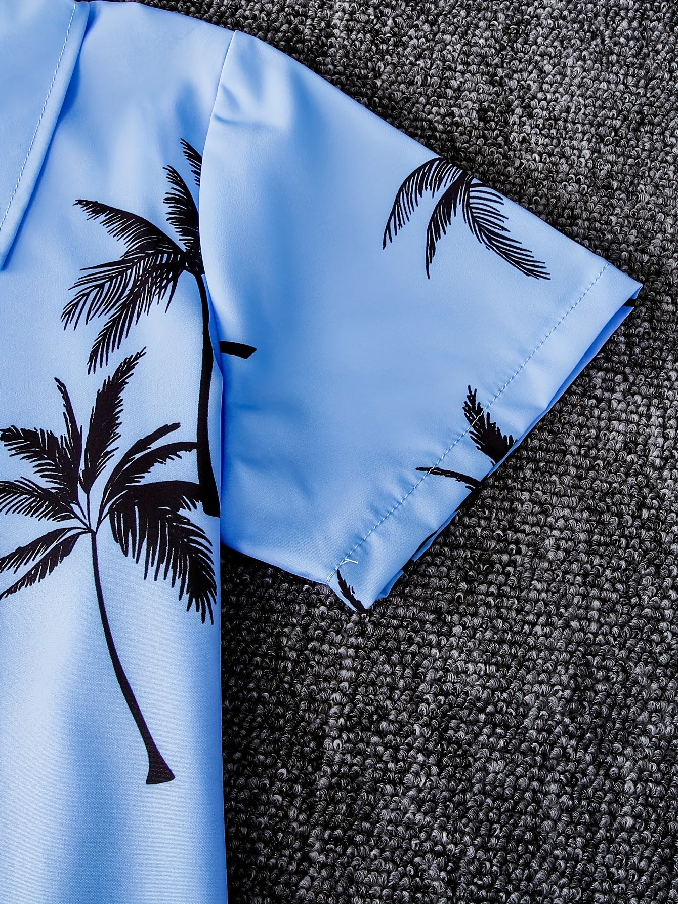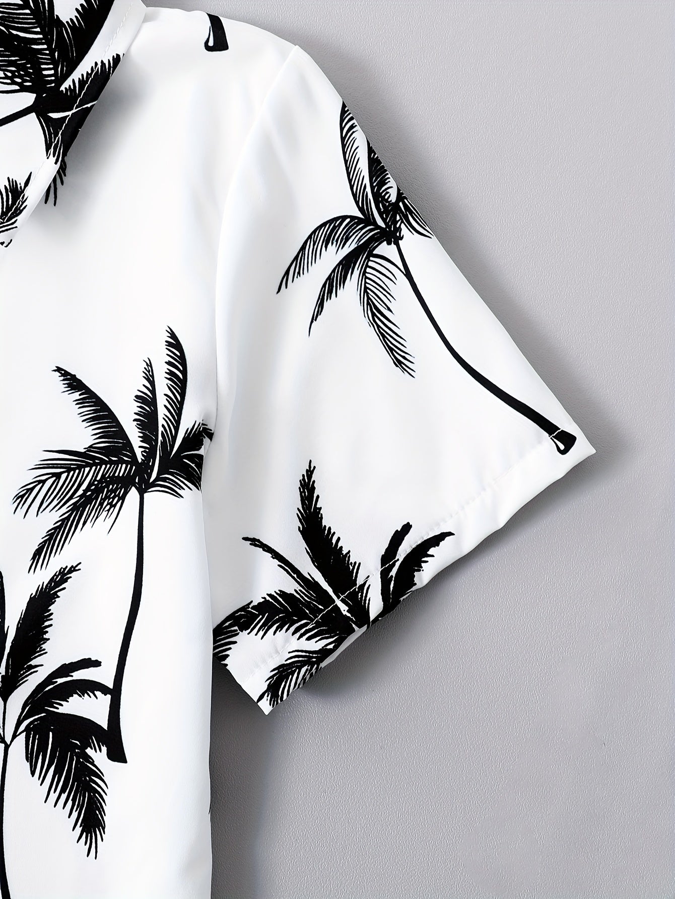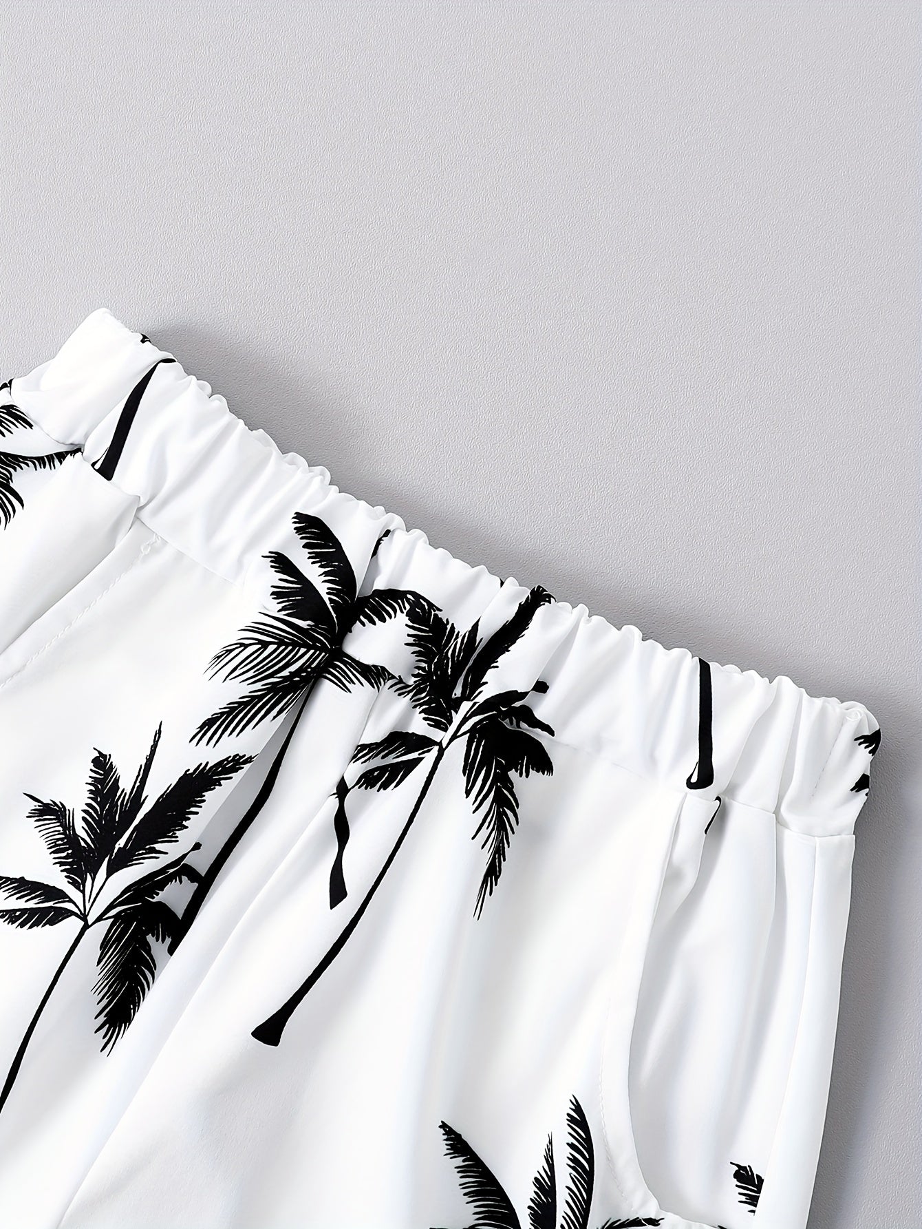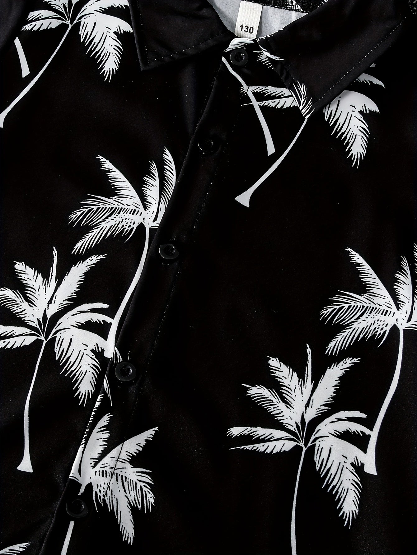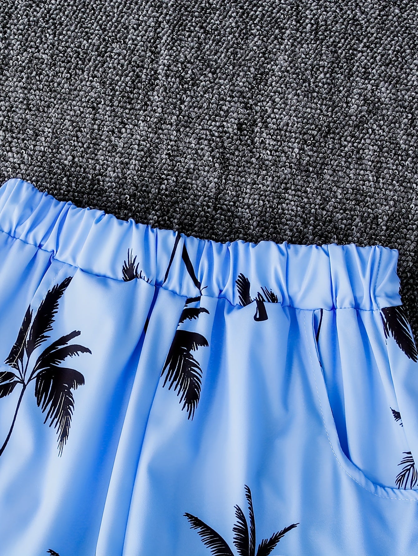 2pcs Boys Casual Coconut Tree Graphic Print Short Sleeve Lapel Shirt & Shorts Set, Comfy Summer Boys Clothing For Daily & Outdoor Wear