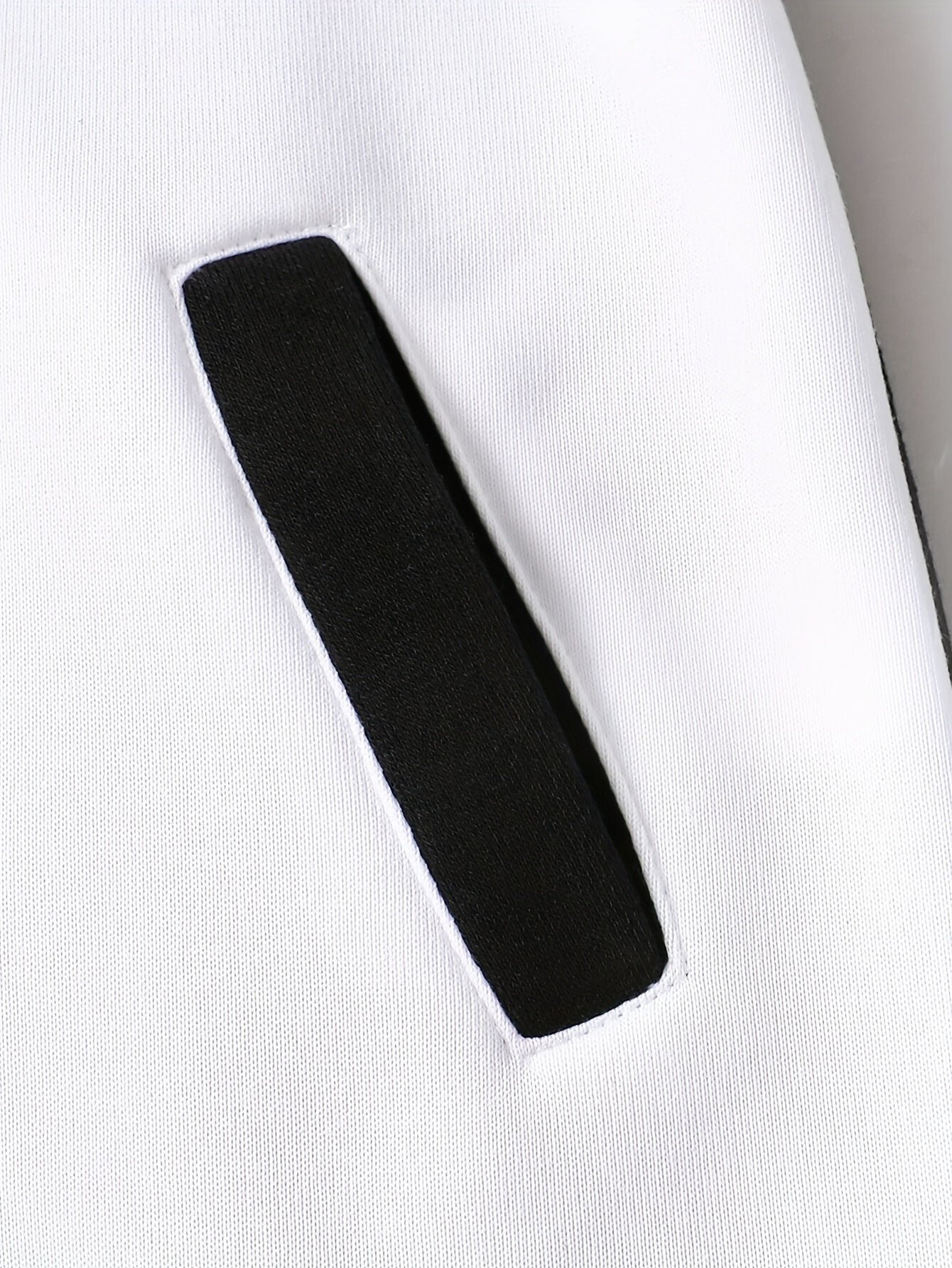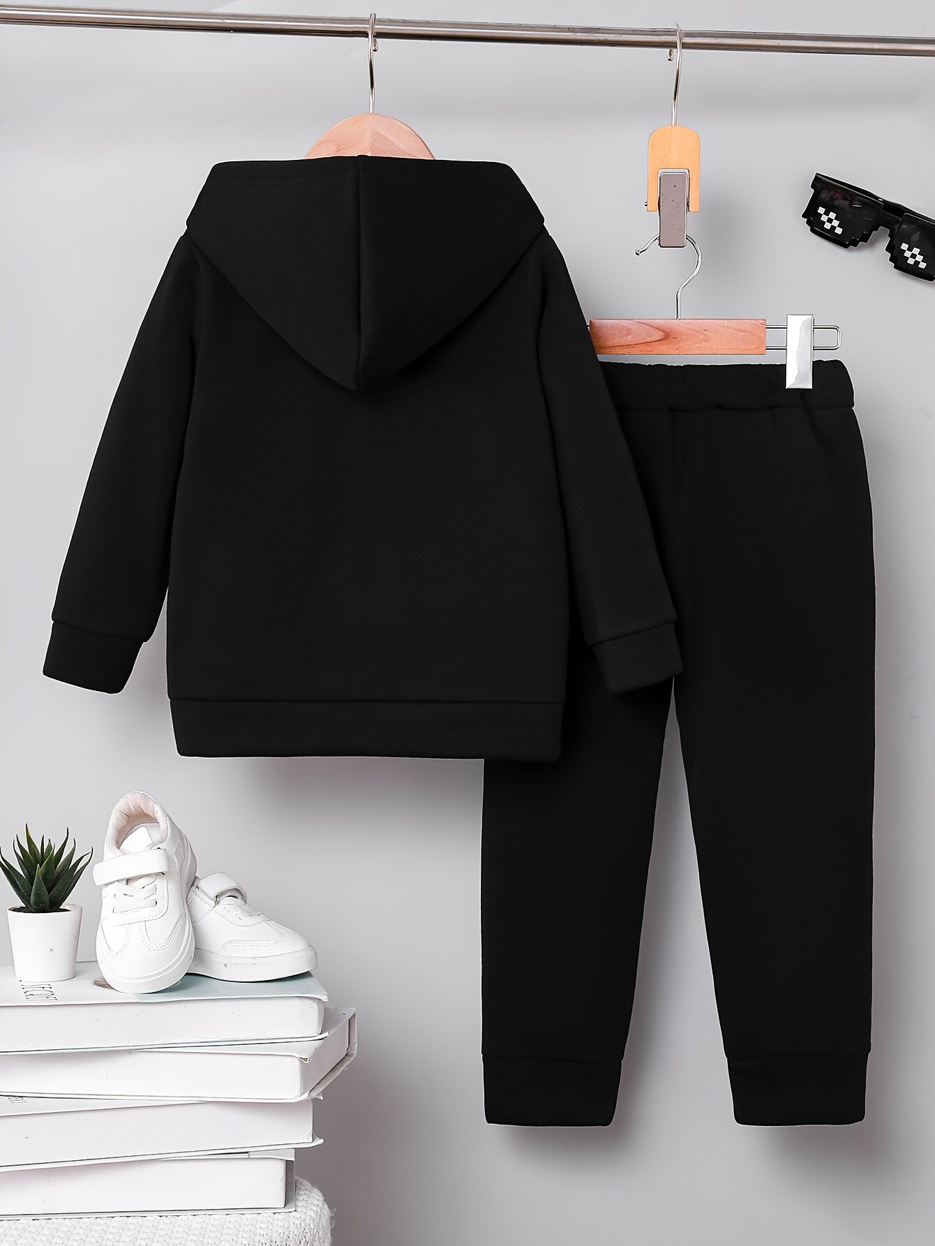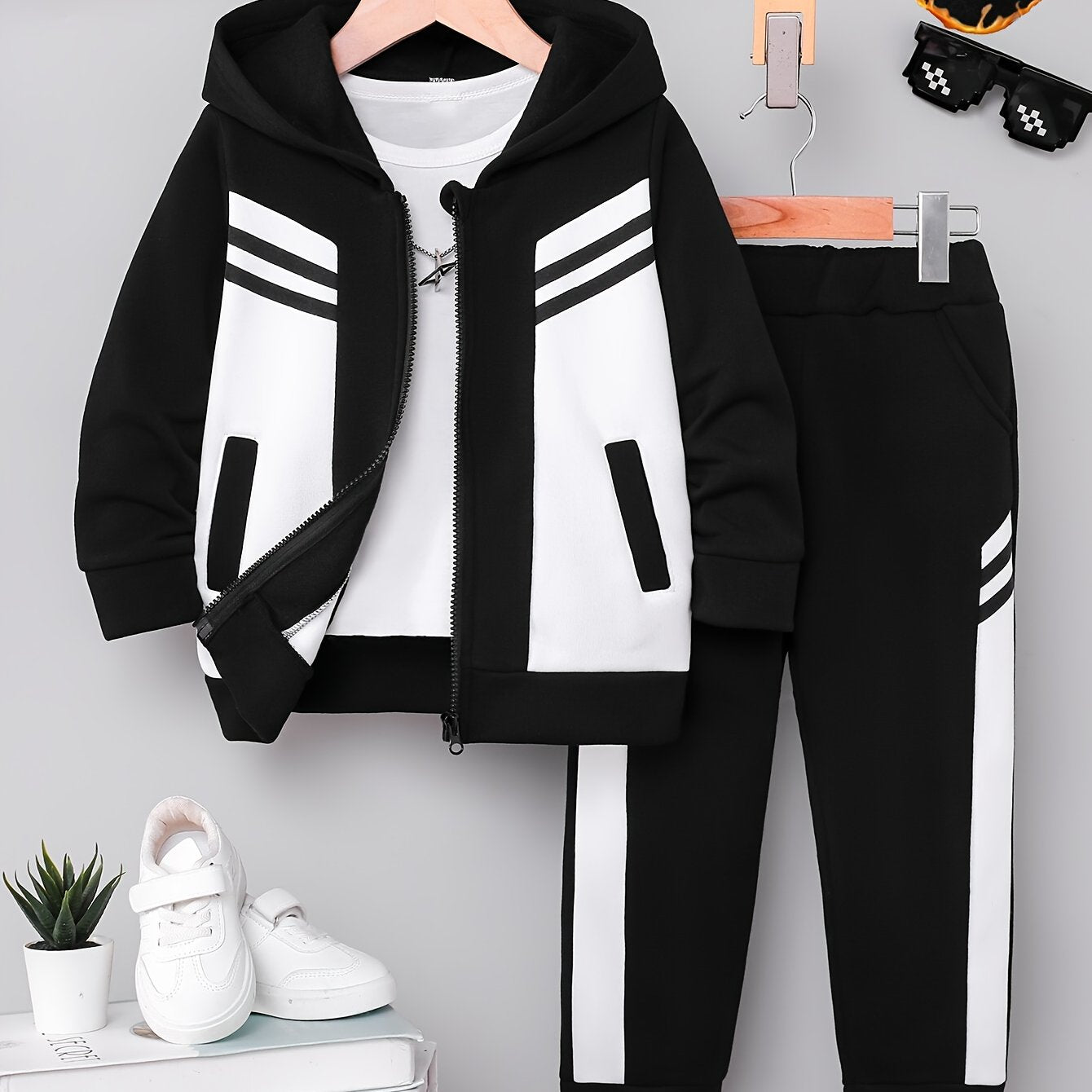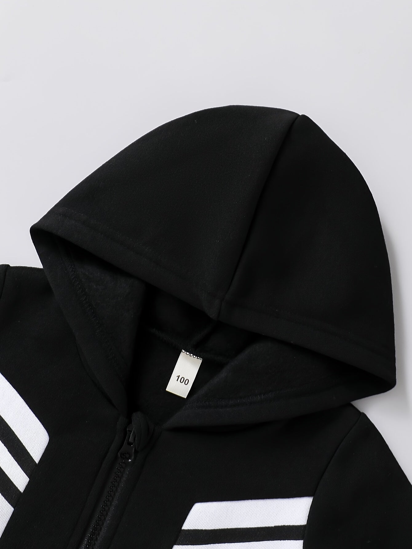 2pcs Boys' New Fashion Hooded Zip-Up Jacket and Pants Set, Black and White Striped Print Trendy Cool Style Outfit for Autumn/Winter, Thickened Sportswear with Pockets, Durable Polyester Fabric, Perfect Gift Choice for Kids, A