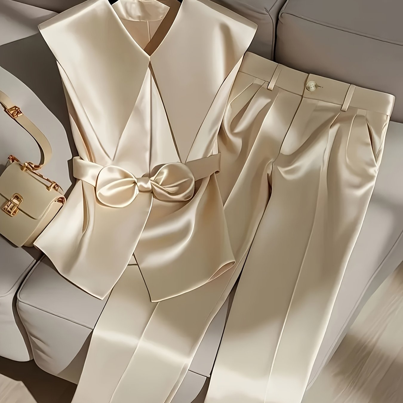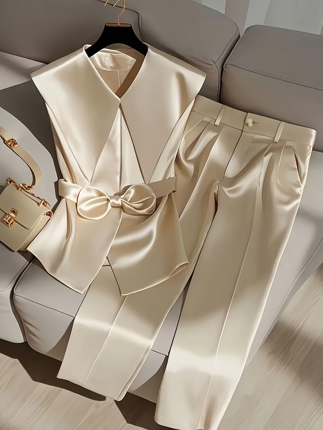2pcs Elegant Polyester Pantsuit Set, Waterfall Collar, Solid Color Sleeveless Top and Pants, Polyester and Spandex Blend, with Bow Details, Spring and Summer Style - Nian Nian