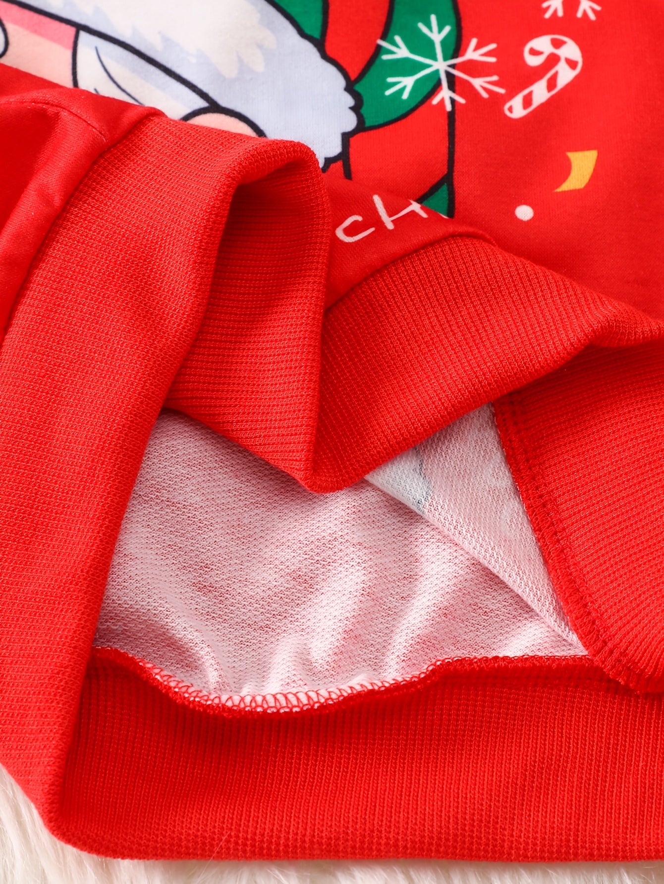 2pcs Girls' Christmas Outfit Set - Red Long Sleeve Top & Black Pants with Santa Claus, Snowflakes & SnowChildren - Cozy Winter Party Outfit for Christmas Day, for Outdoor, Christmas Clothes, Festive Clothing, Holiday Clothing