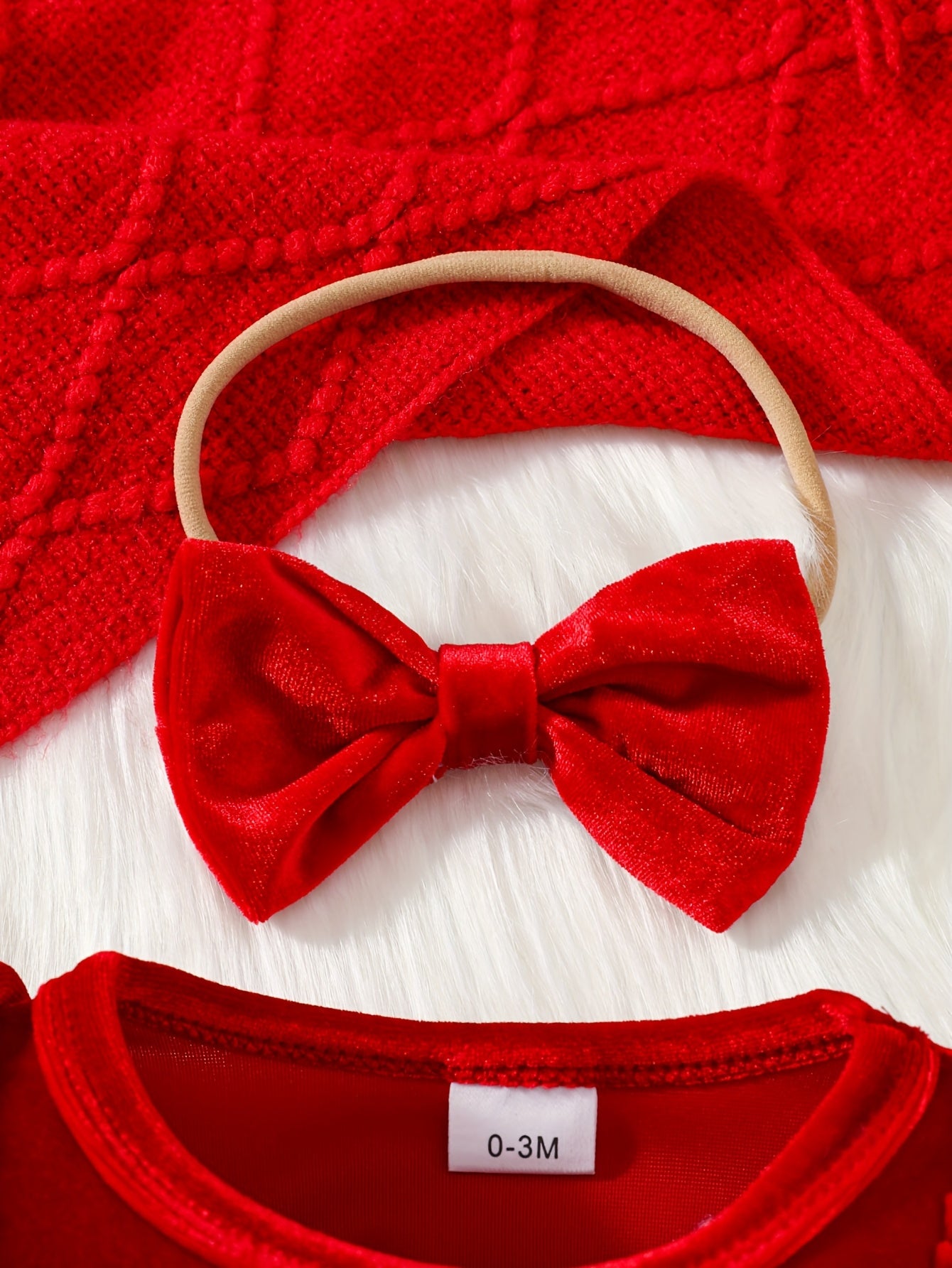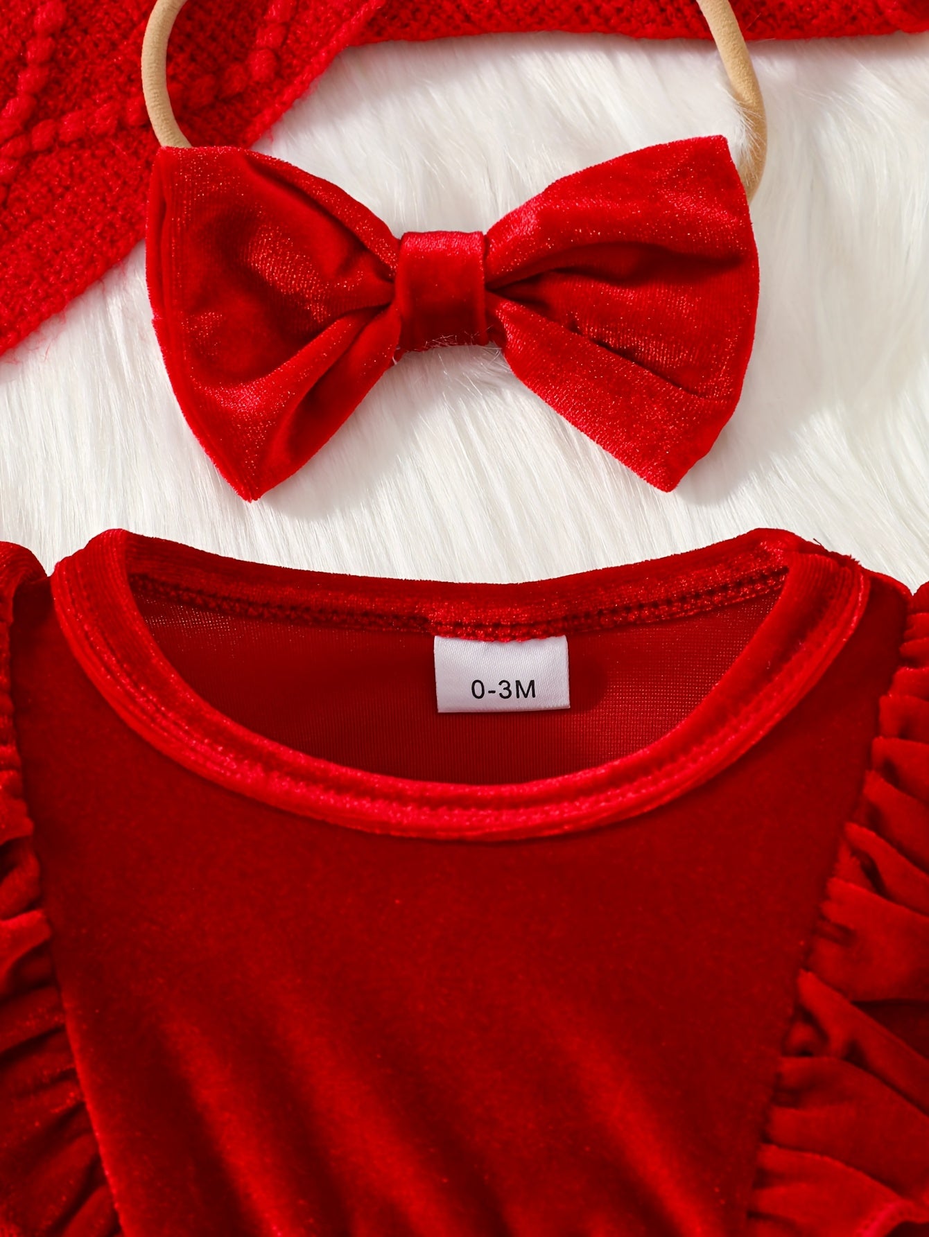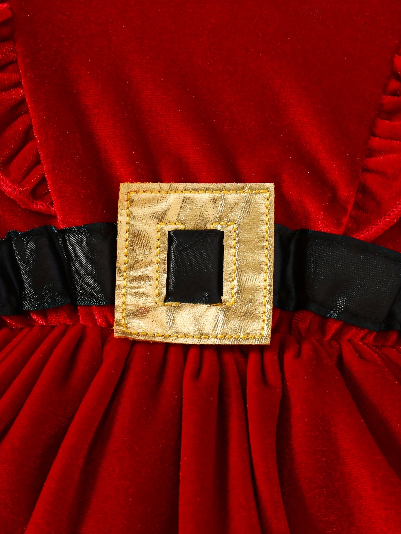 2pcs Golden Velvet Flutter Sleeve Lace Belt Decorated Long Sleeve Bodysuit with Fluffy Skirt + Bow Headscarf Set Autumn and Winter Christmas Cute Party Outfit, for Outdoor