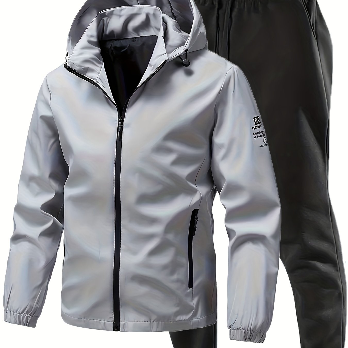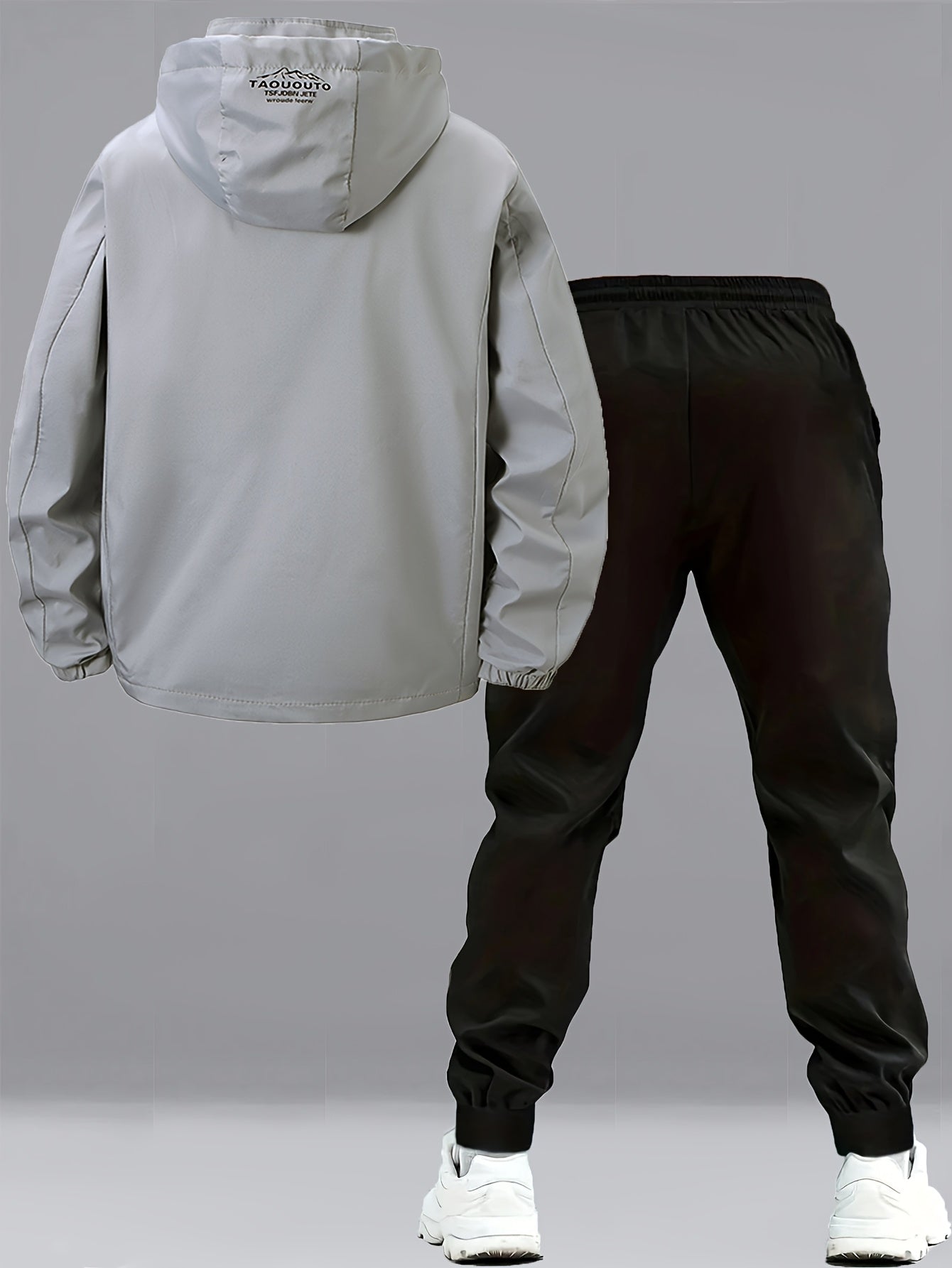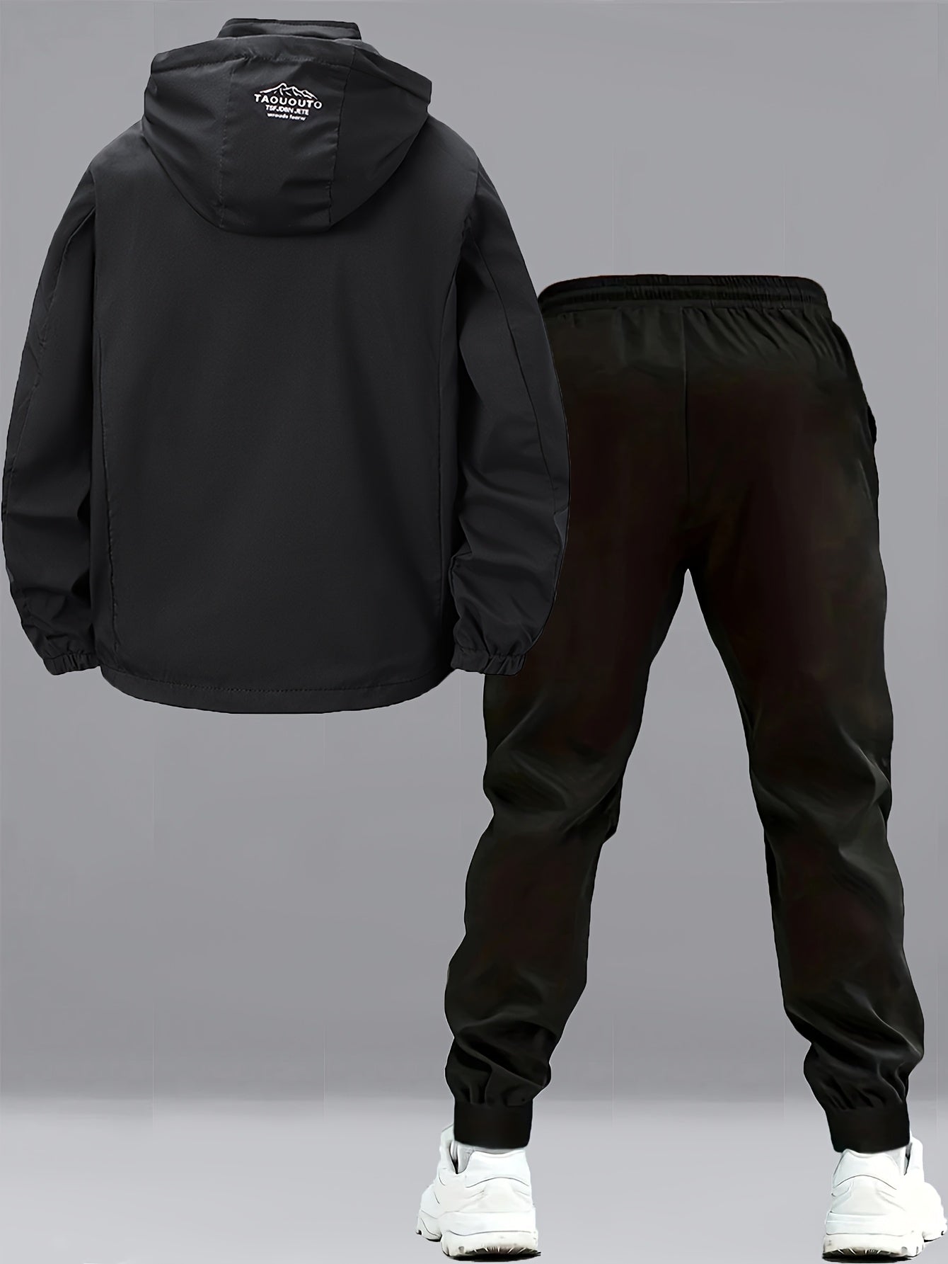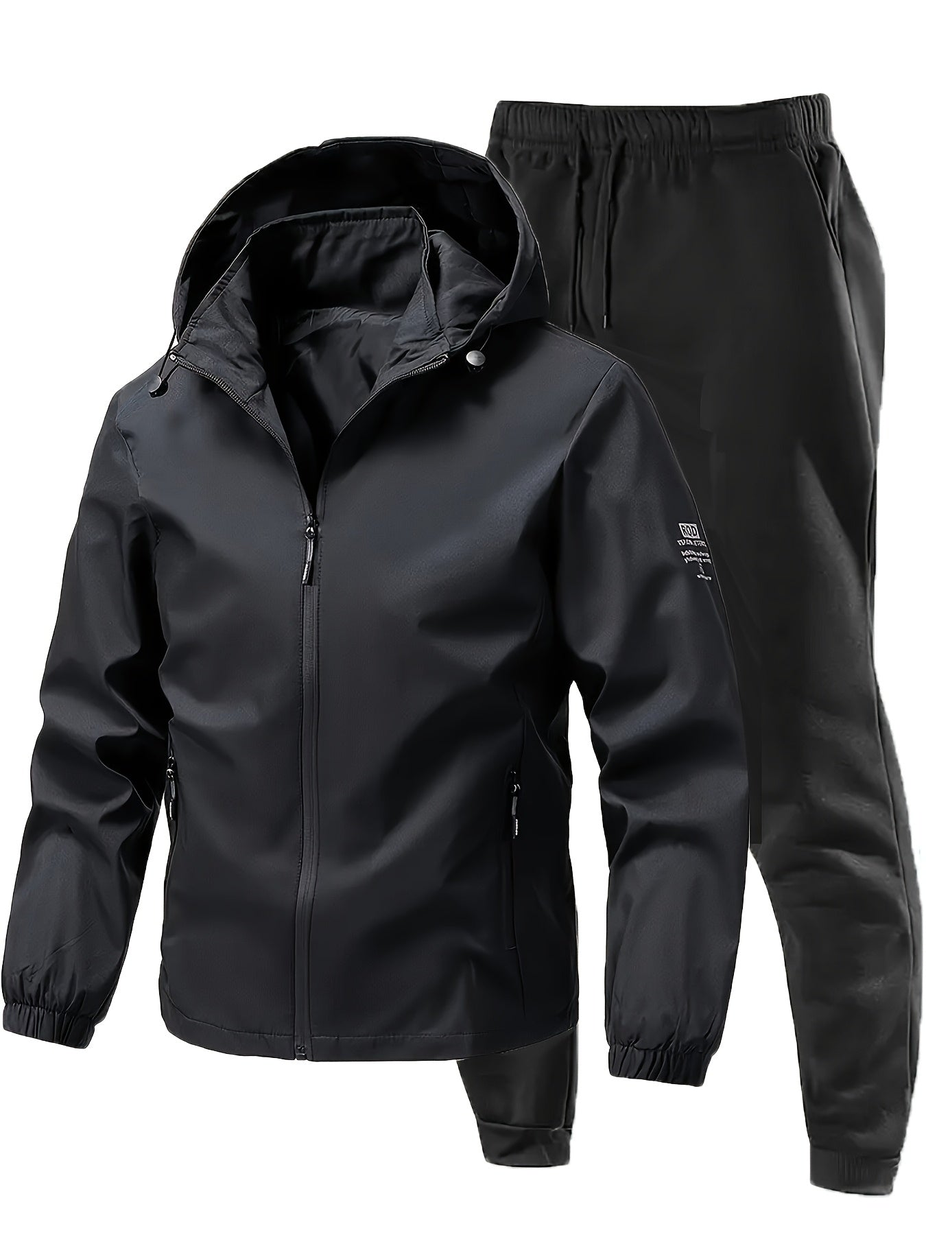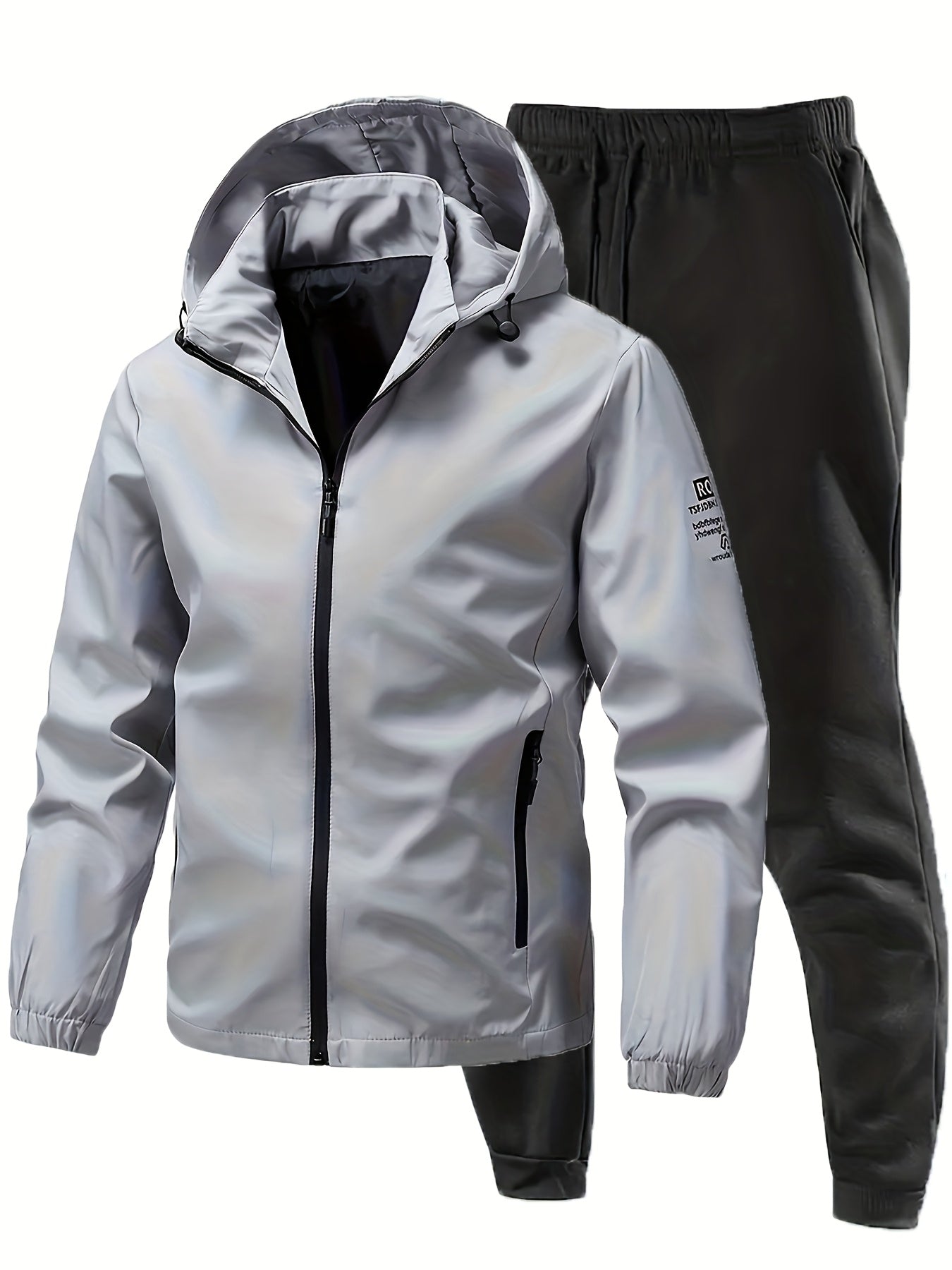 2pcs Men's Sporty Casual Jacket and Stretch Jogger Set, Spring/Autumn Fashion Hooded Jacket with Zipper Pockets, Windproof Outerwear and Black Stretch Joggers, Perfect for Outdoor Activities and Leisure Wear