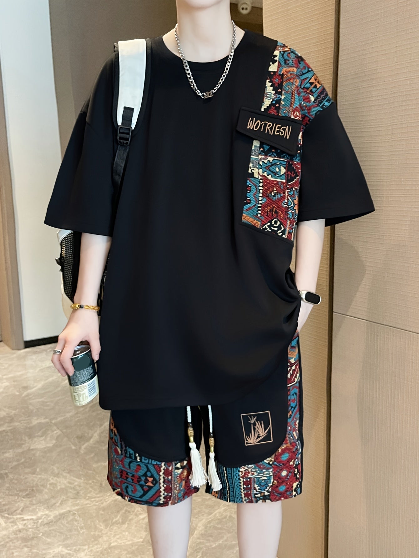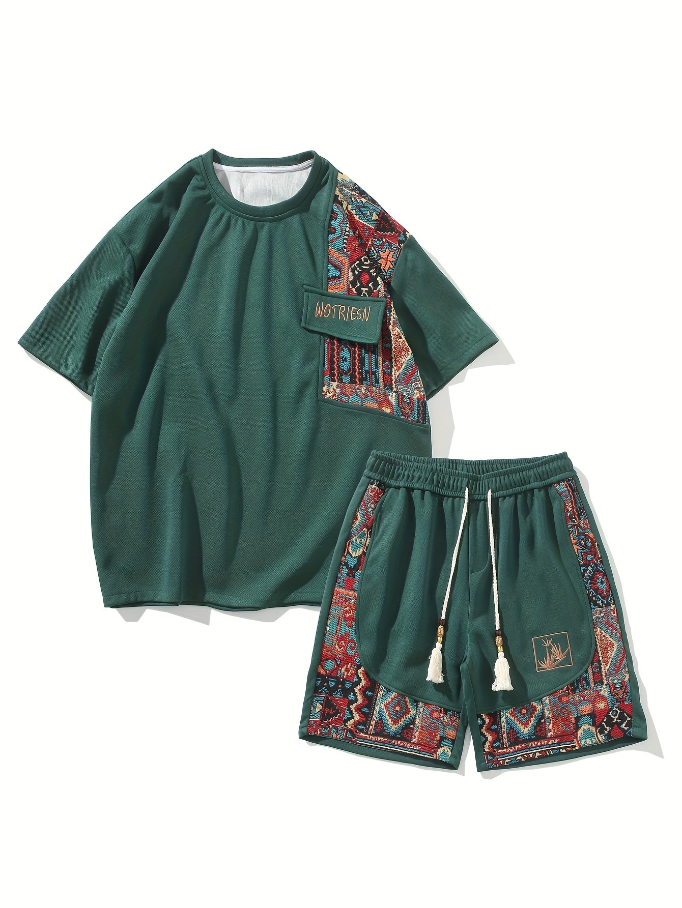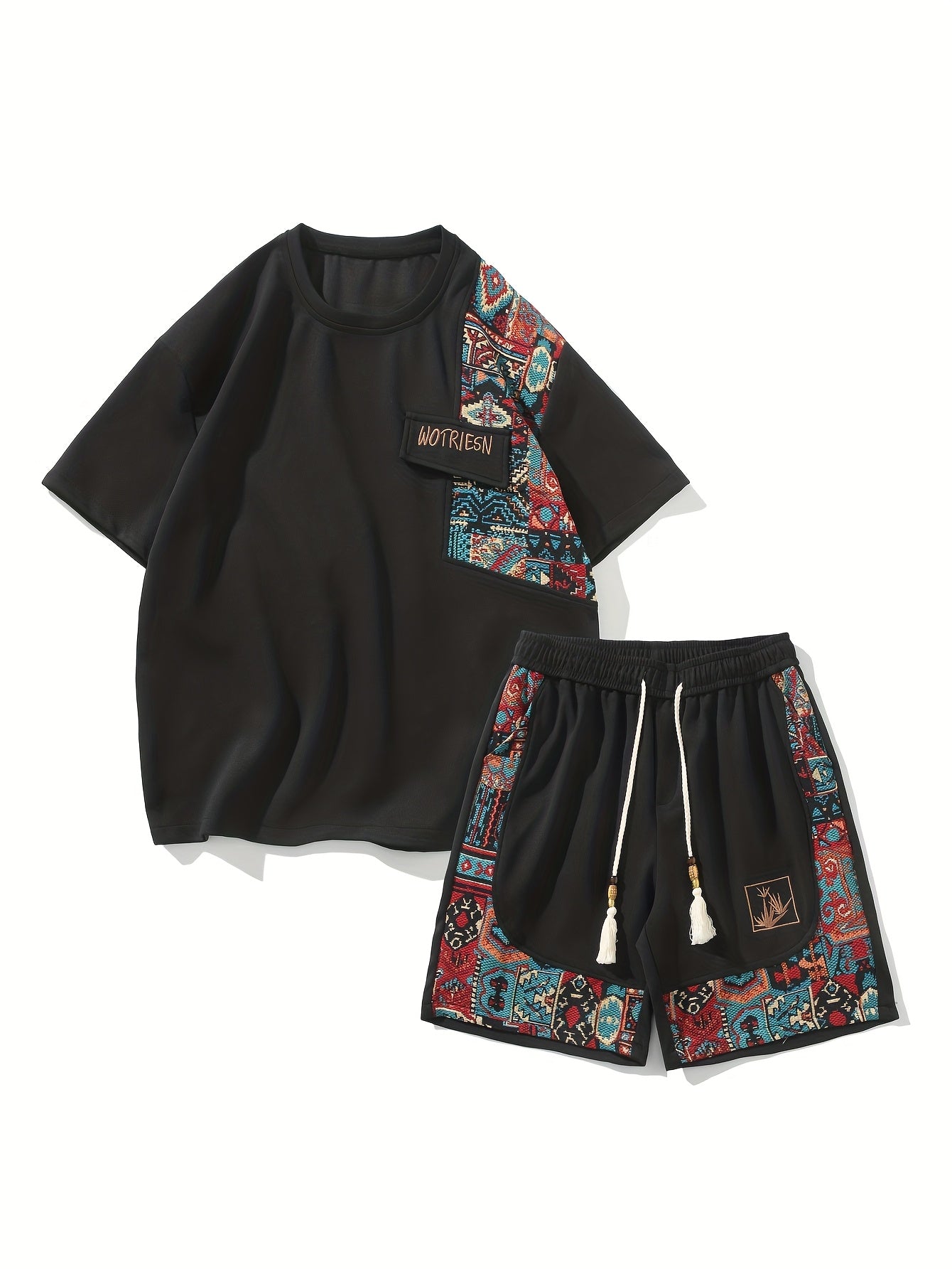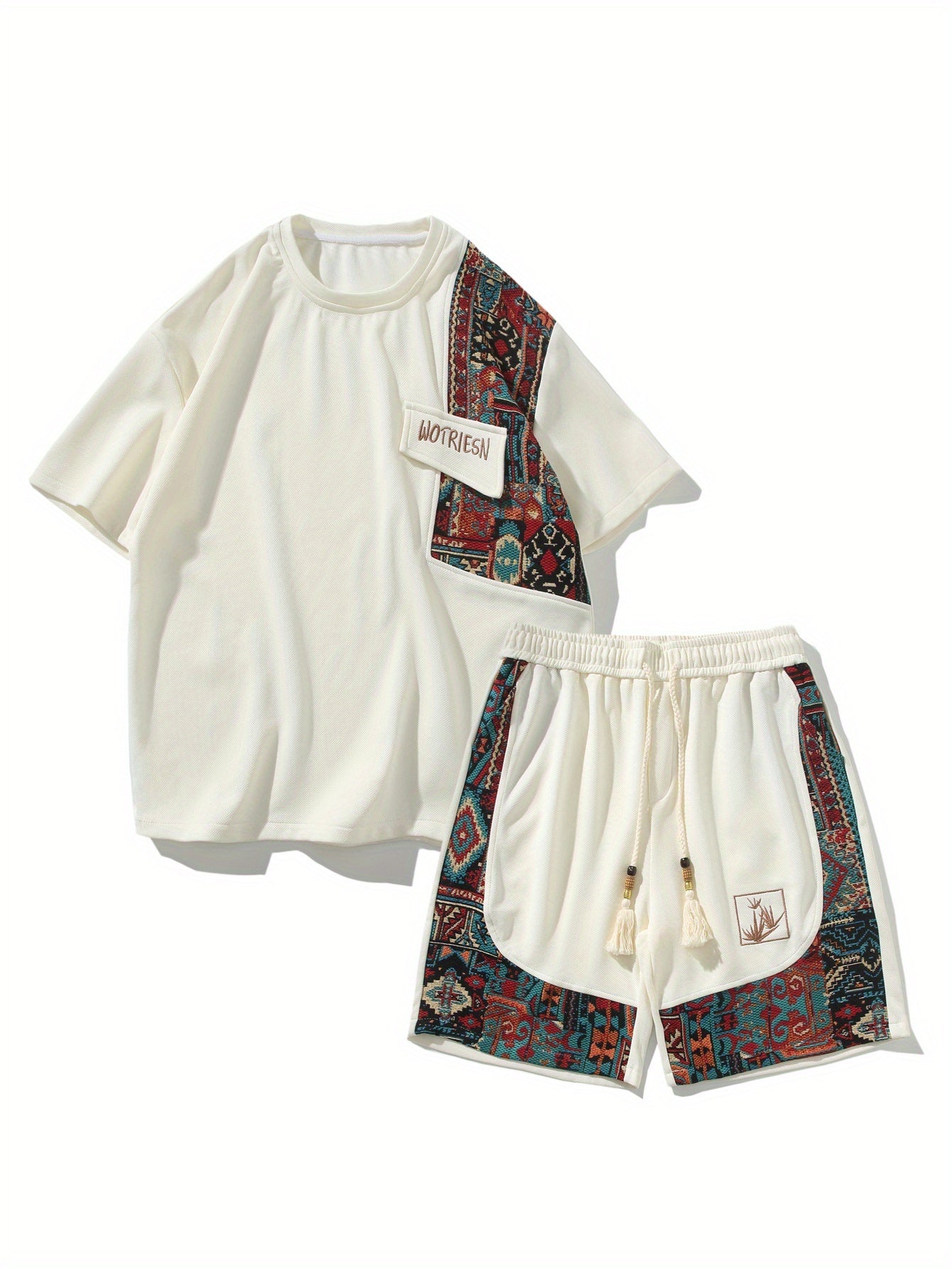 2pcs Men's Summer Casual Outdoor Set, Fashion Ethnic Style Round Neck Short Sleeve T-Shirt and Shorts Suit with Embroidery Design Loose Fit, Short Sleeve + Drawstring Shorts Combo, Suitable for Summer Outdoor Activities