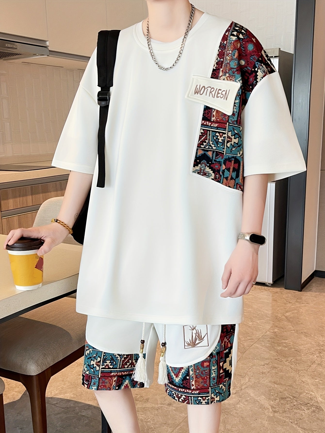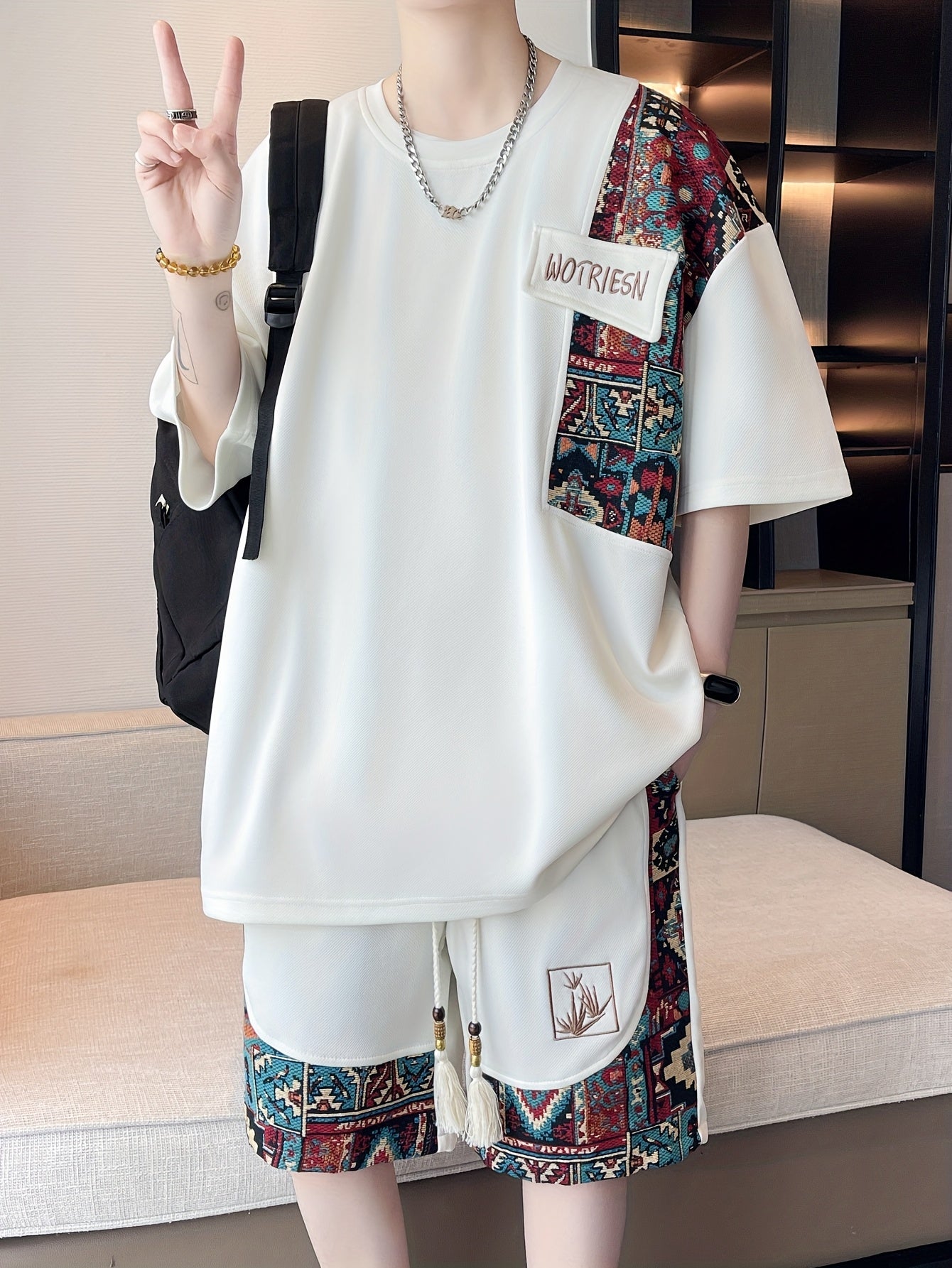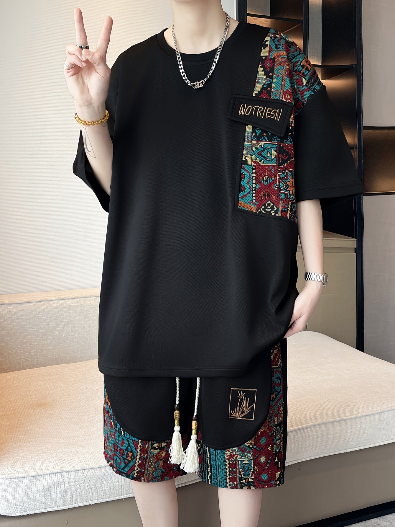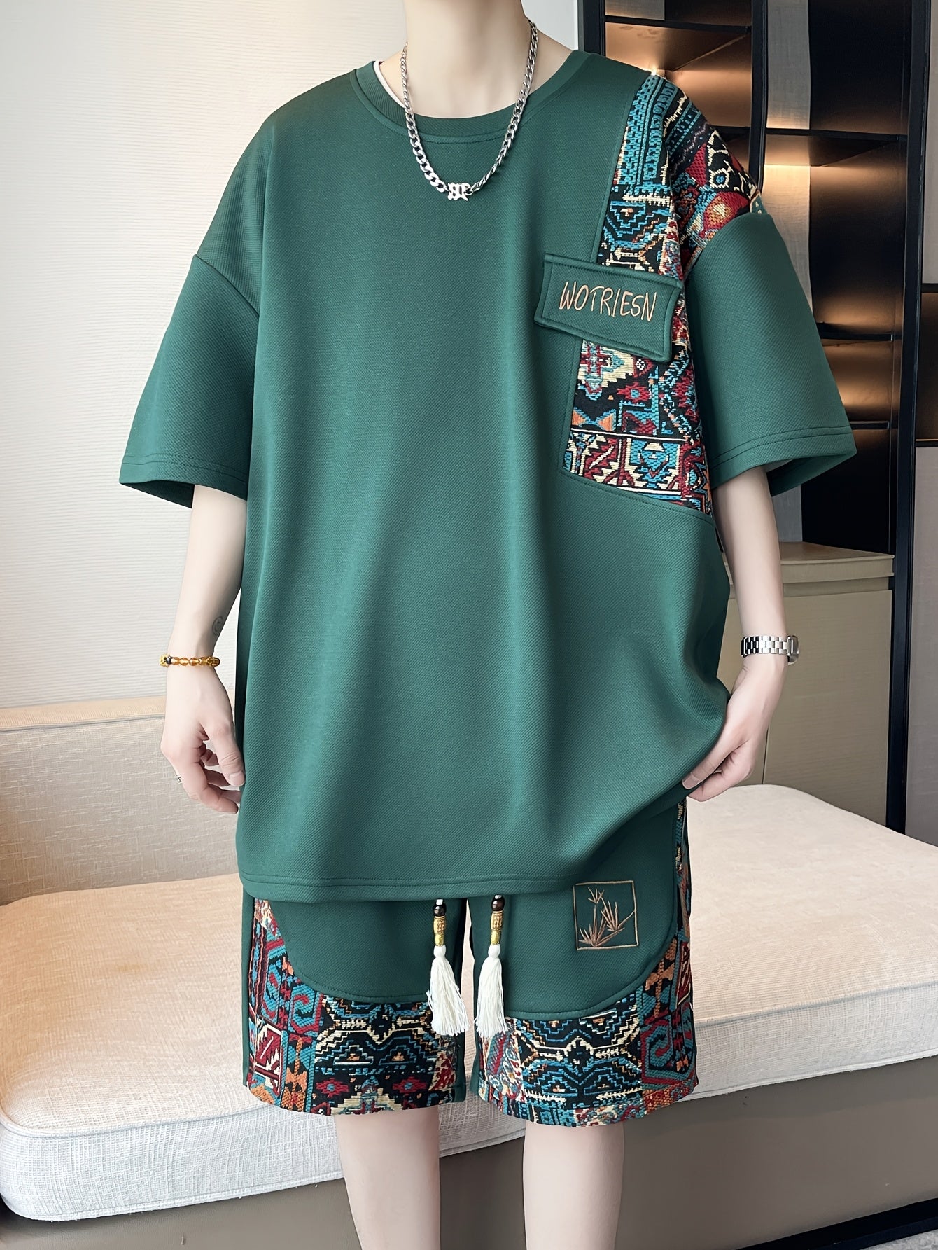 2pcs Men's Summer Casual Outdoor Set, Fashion Ethnic Style Round Neck Short Sleeve T-Shirt and Shorts Suit with Embroidery Design Loose Fit, Short Sleeve + Drawstring Shorts Combo, Suitable for Summer Outdoor Activities