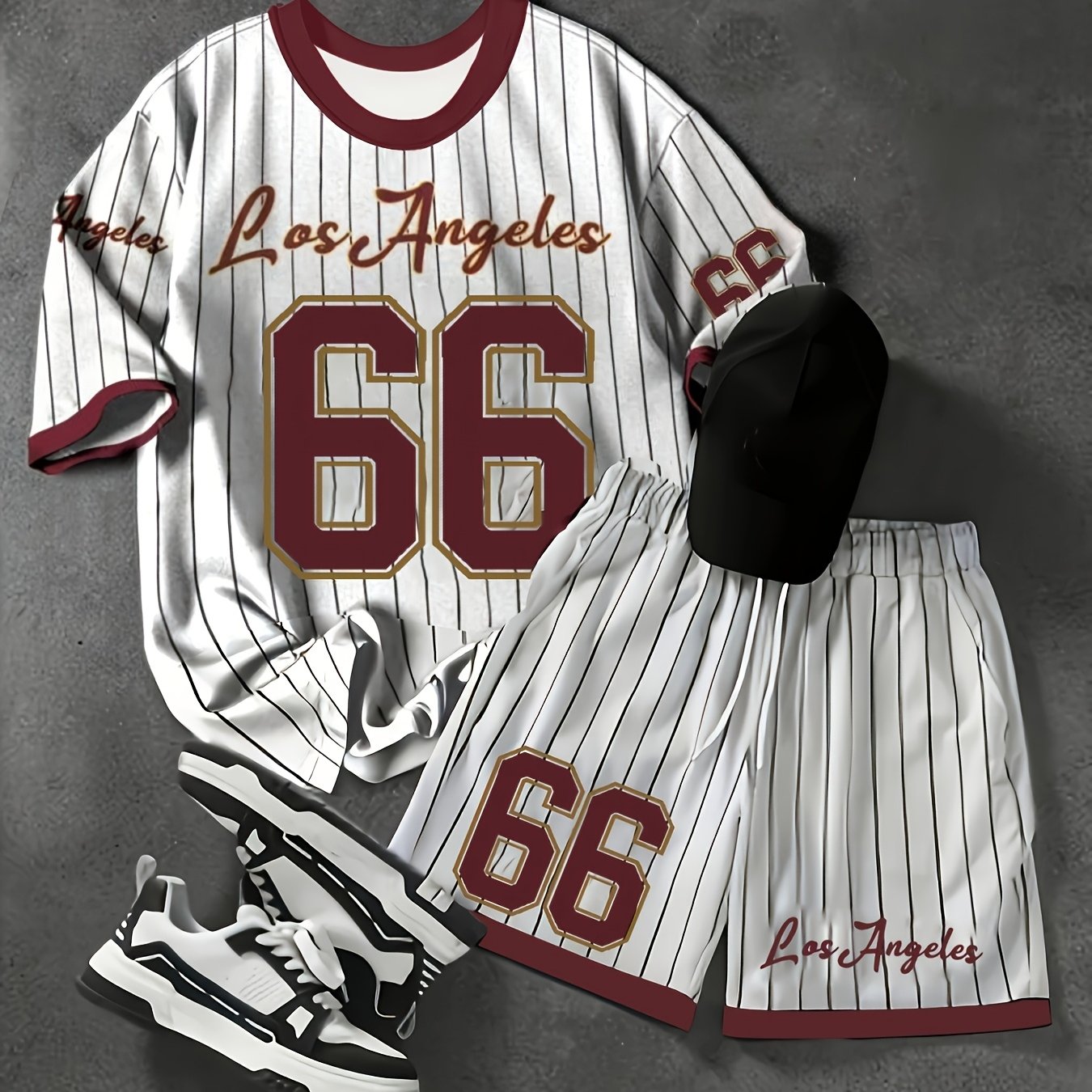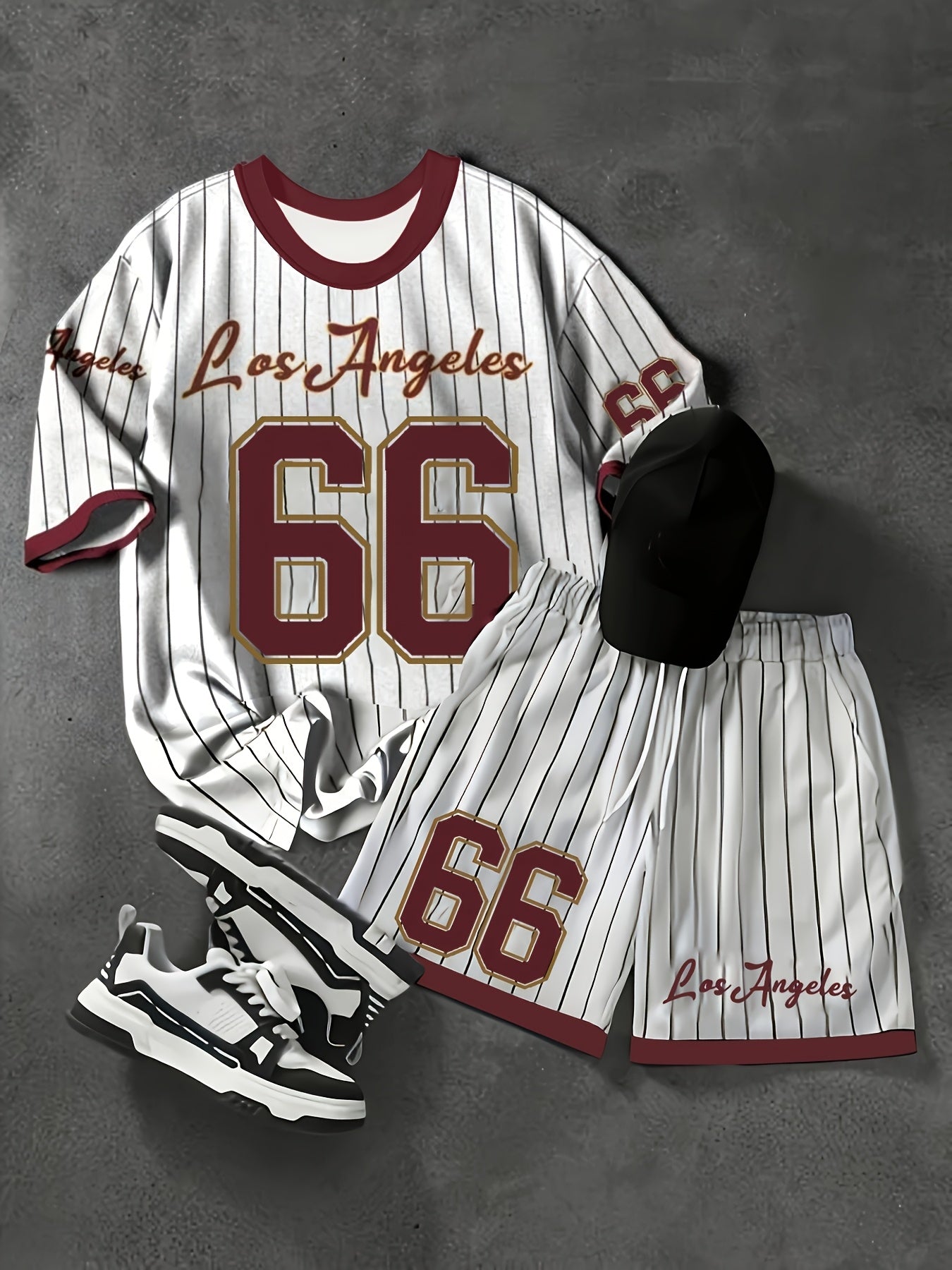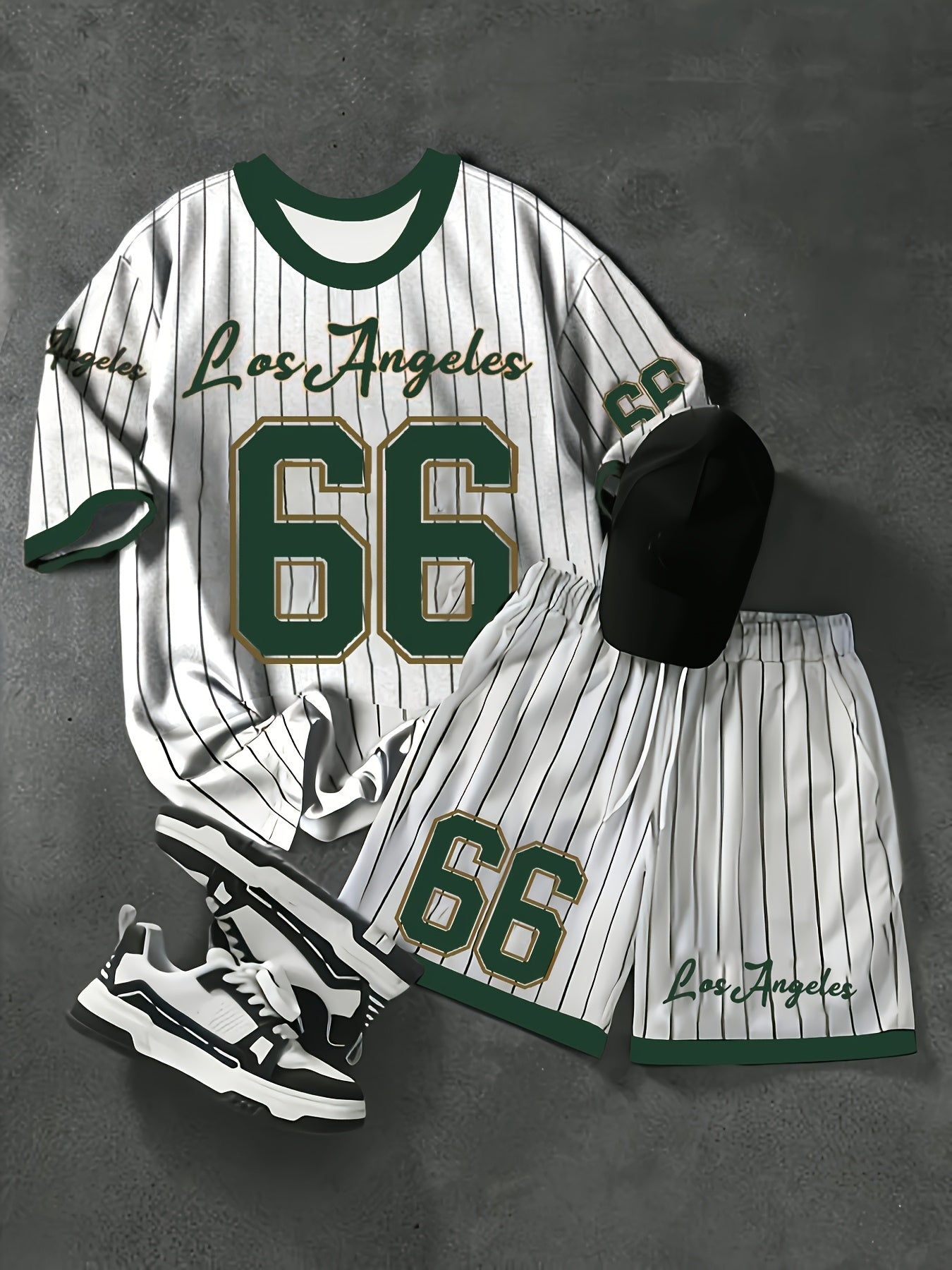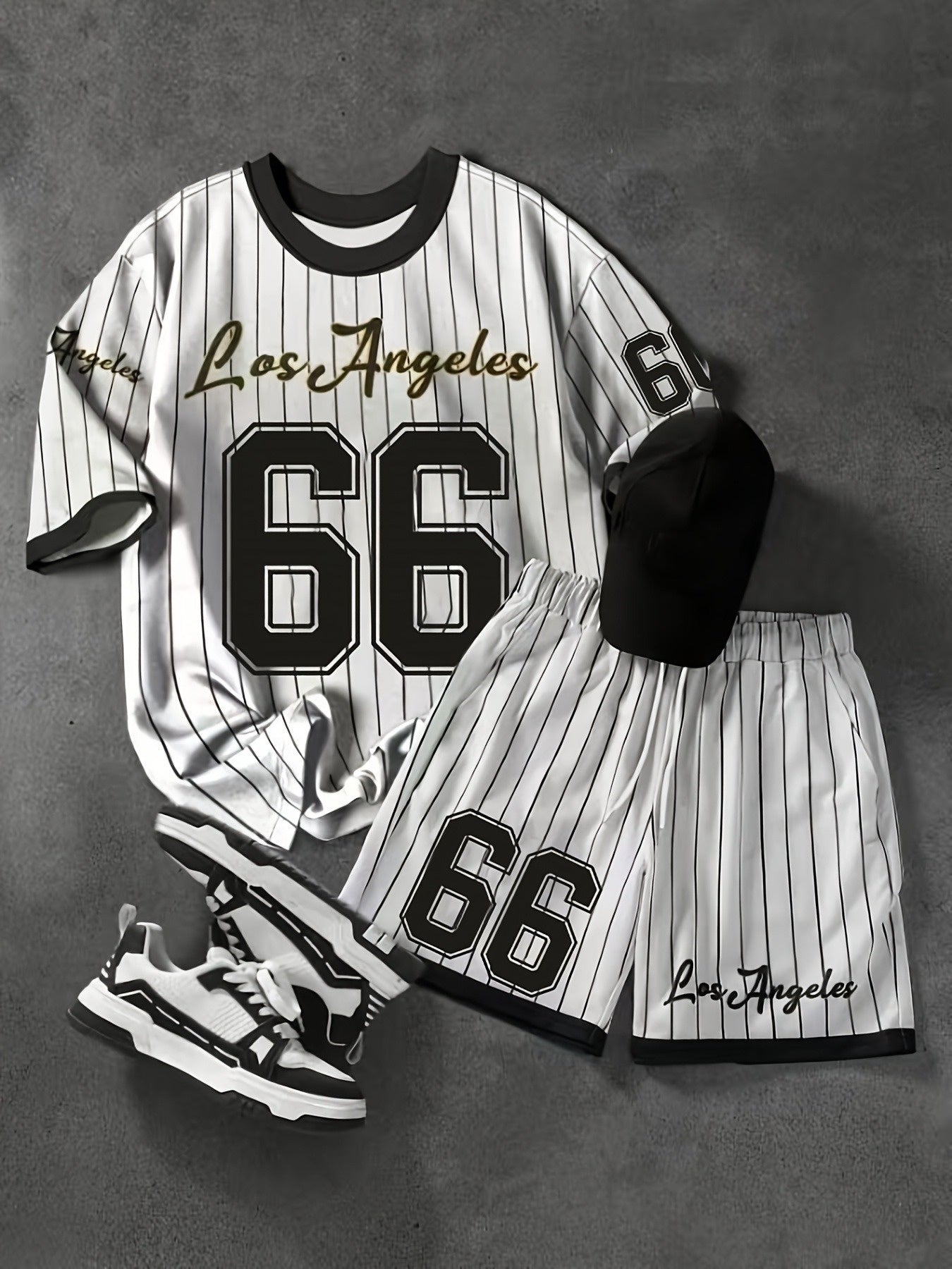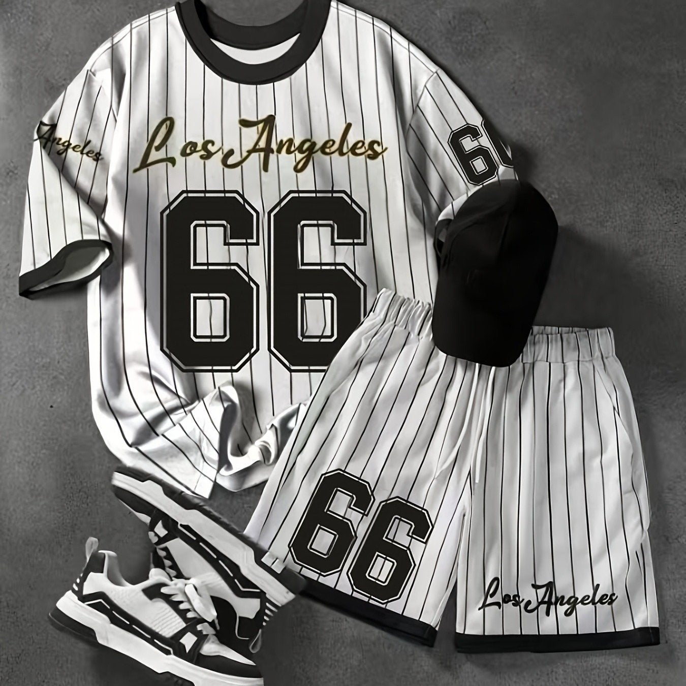 2pcs Set, Men'S Plus Size Los Angeles 66 Print T-Shirt + Shorts - Casual Sportswear, Breathable Stretch Knit Fabric, Crew Neck, Machine Washable, Black and White Diagonal Stripe, Party Clothing | Casual Style | Comfort Fit, L
