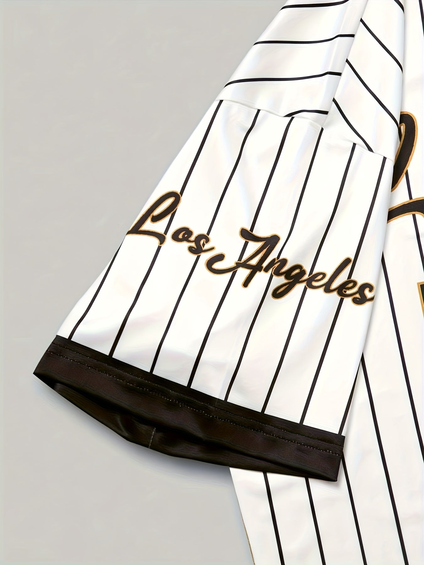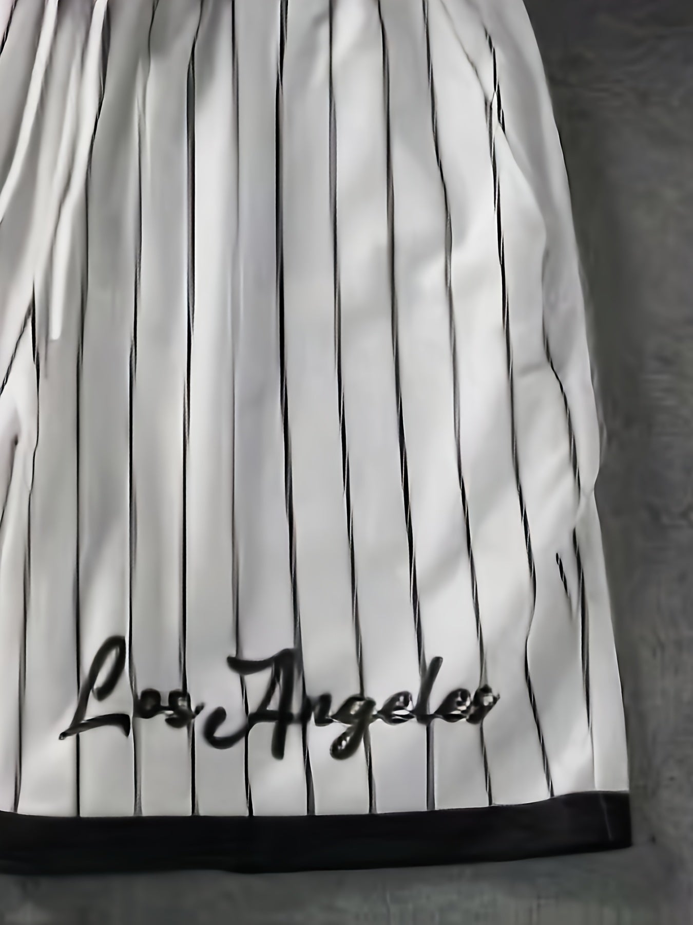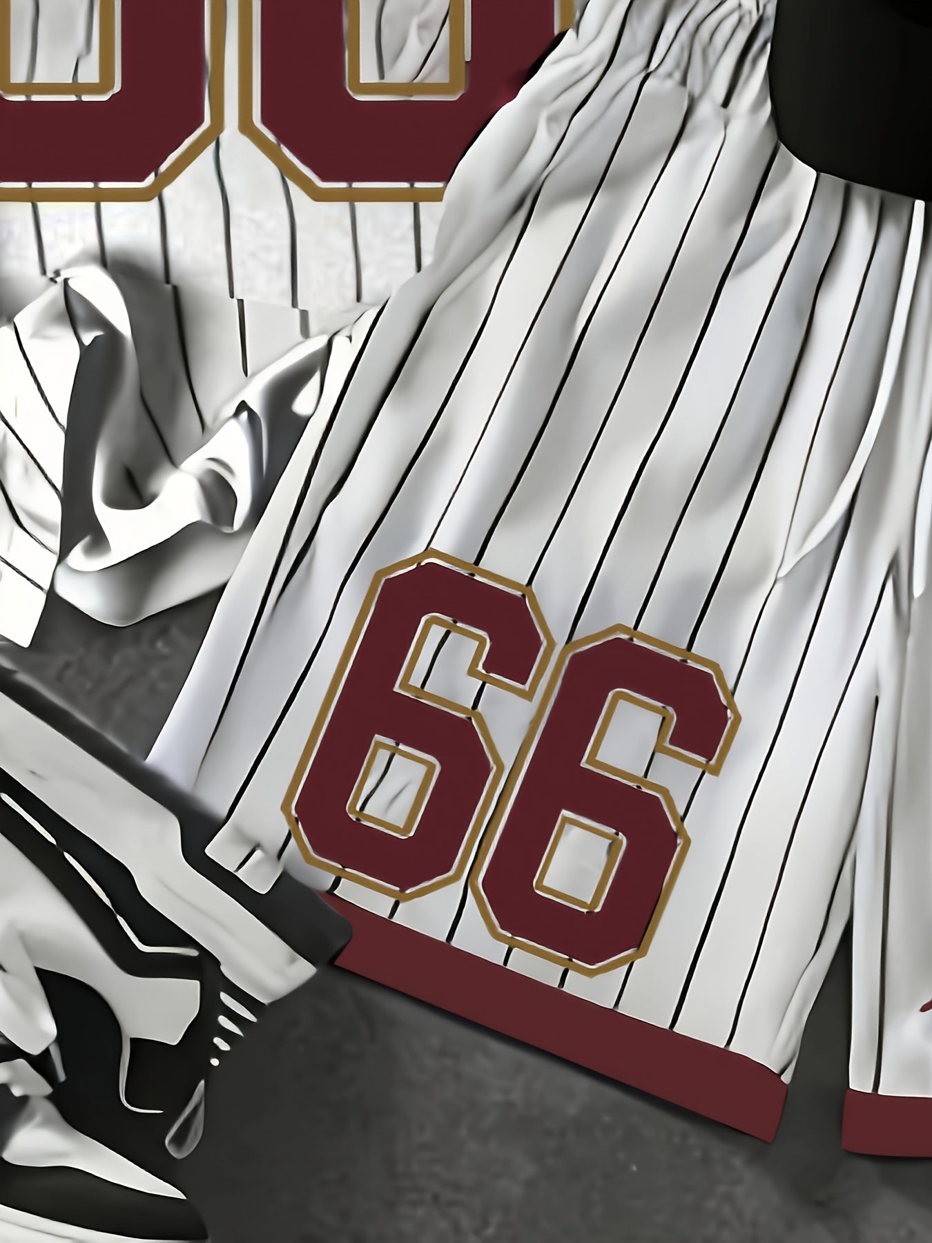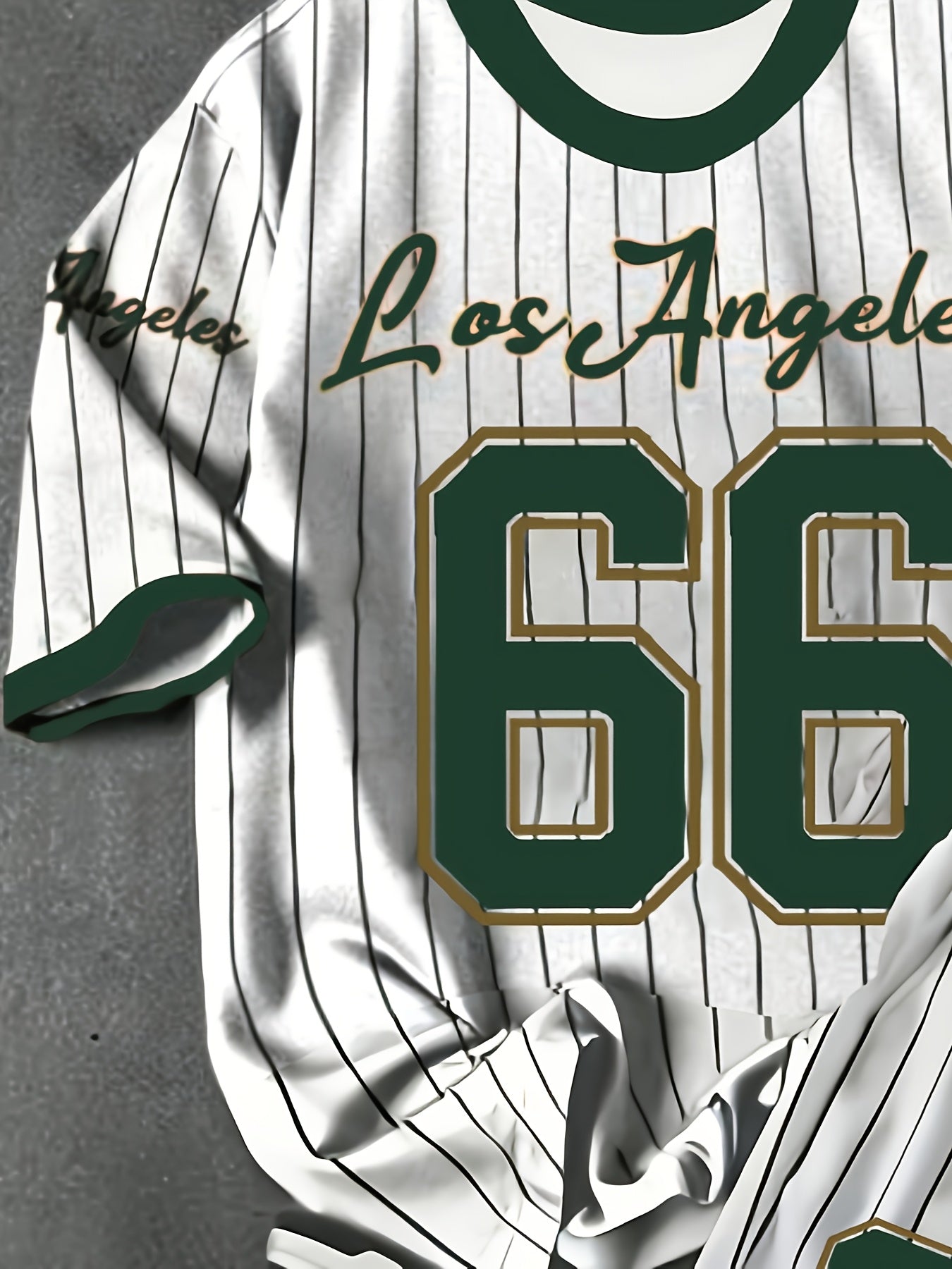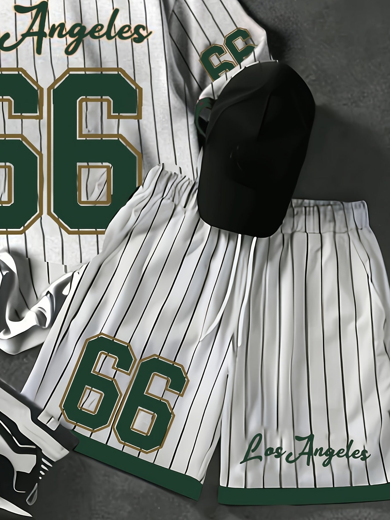 2pcs Set, Men'S Plus Size Los Angeles 66 Print T-Shirt + Shorts - Casual Sportswear, Breathable Stretch Knit Fabric, Crew Neck, Machine Washable, Black and White Diagonal Stripe, Party Clothing | Casual Style | Comfort Fit, L