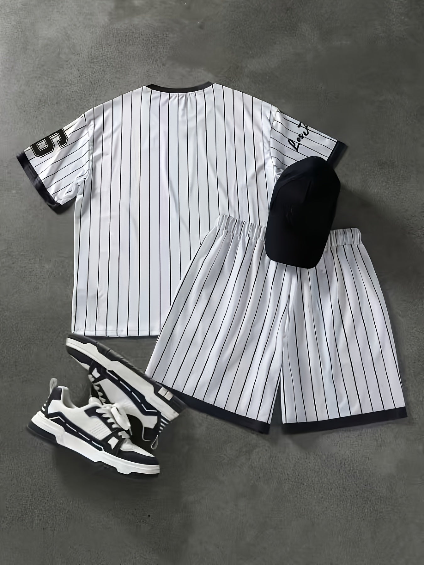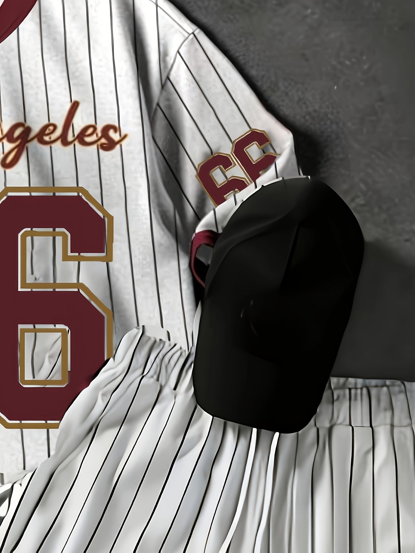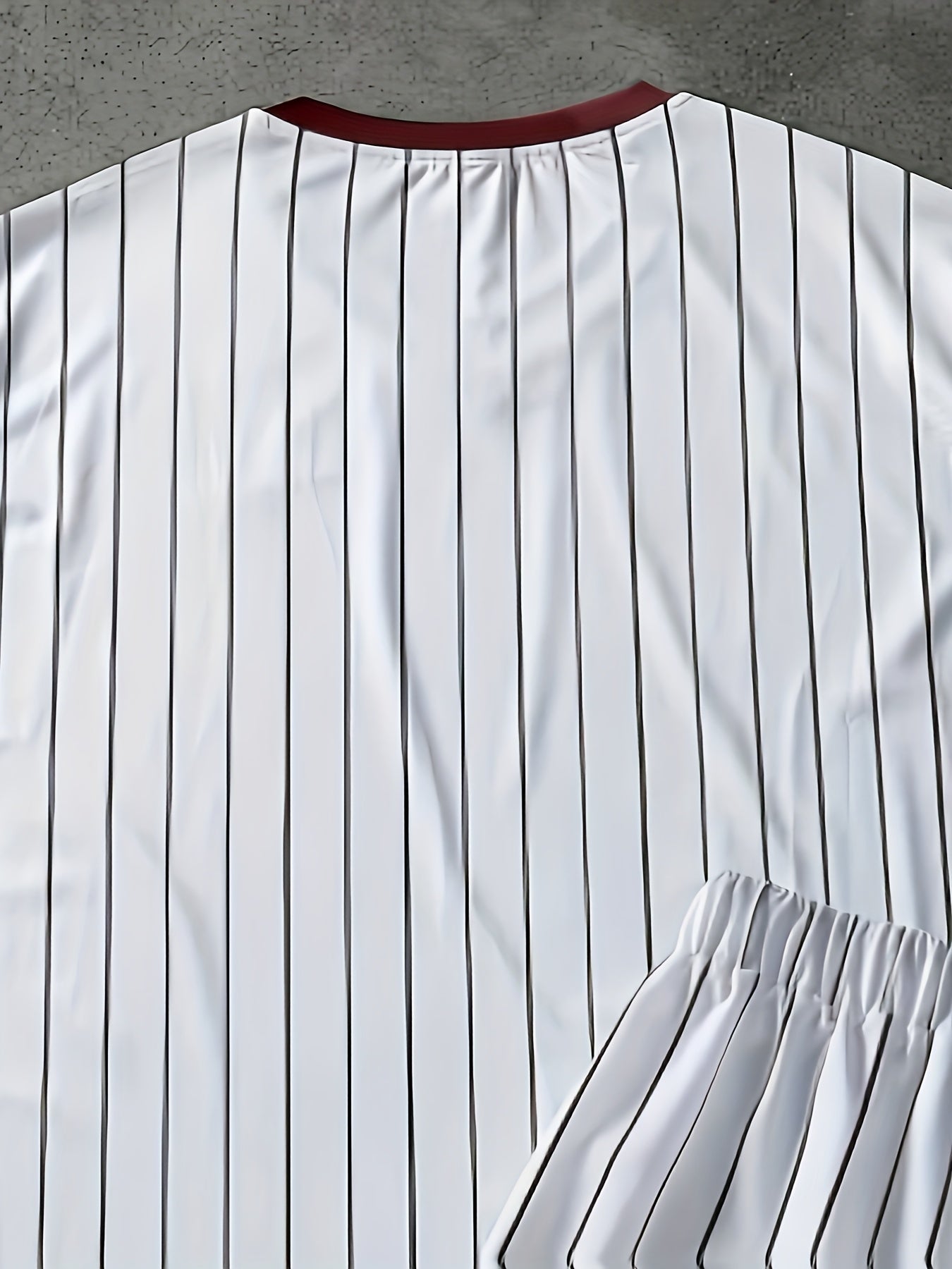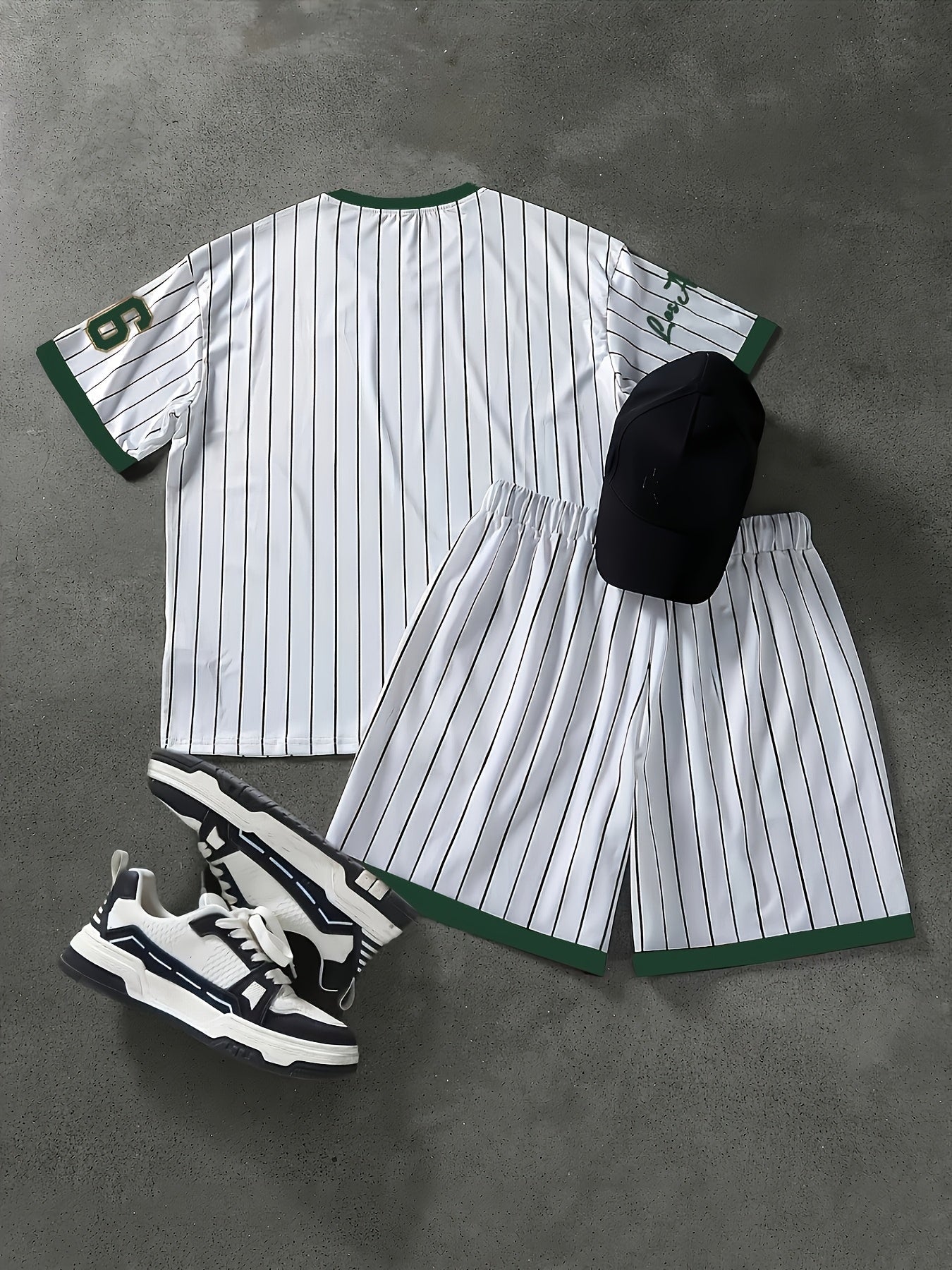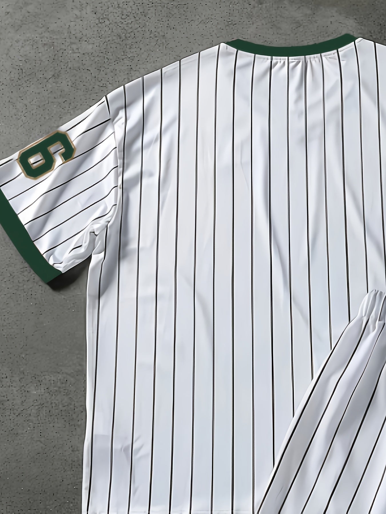 2pcs Set, Men'S Plus Size Los Angeles 66 Print T-Shirt + Shorts - Casual Sportswear, Breathable Stretch Knit Fabric, Crew Neck, Machine Washable, Black and White Diagonal Stripe, Party Clothing | Casual Style | Comfort Fit, L