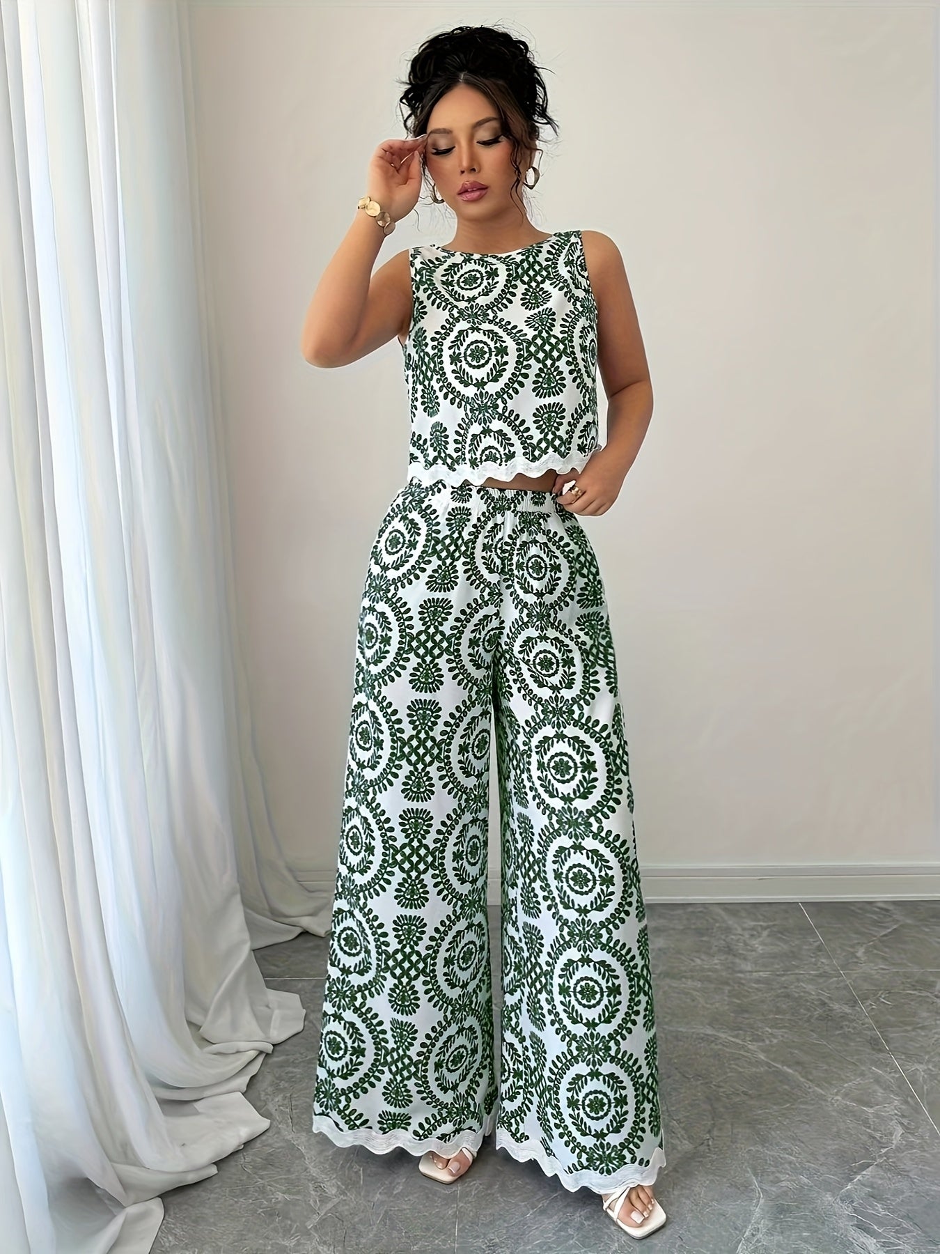 2pcs Women's Plant Pattern Round Neck Sleeveless Top and Pants Set