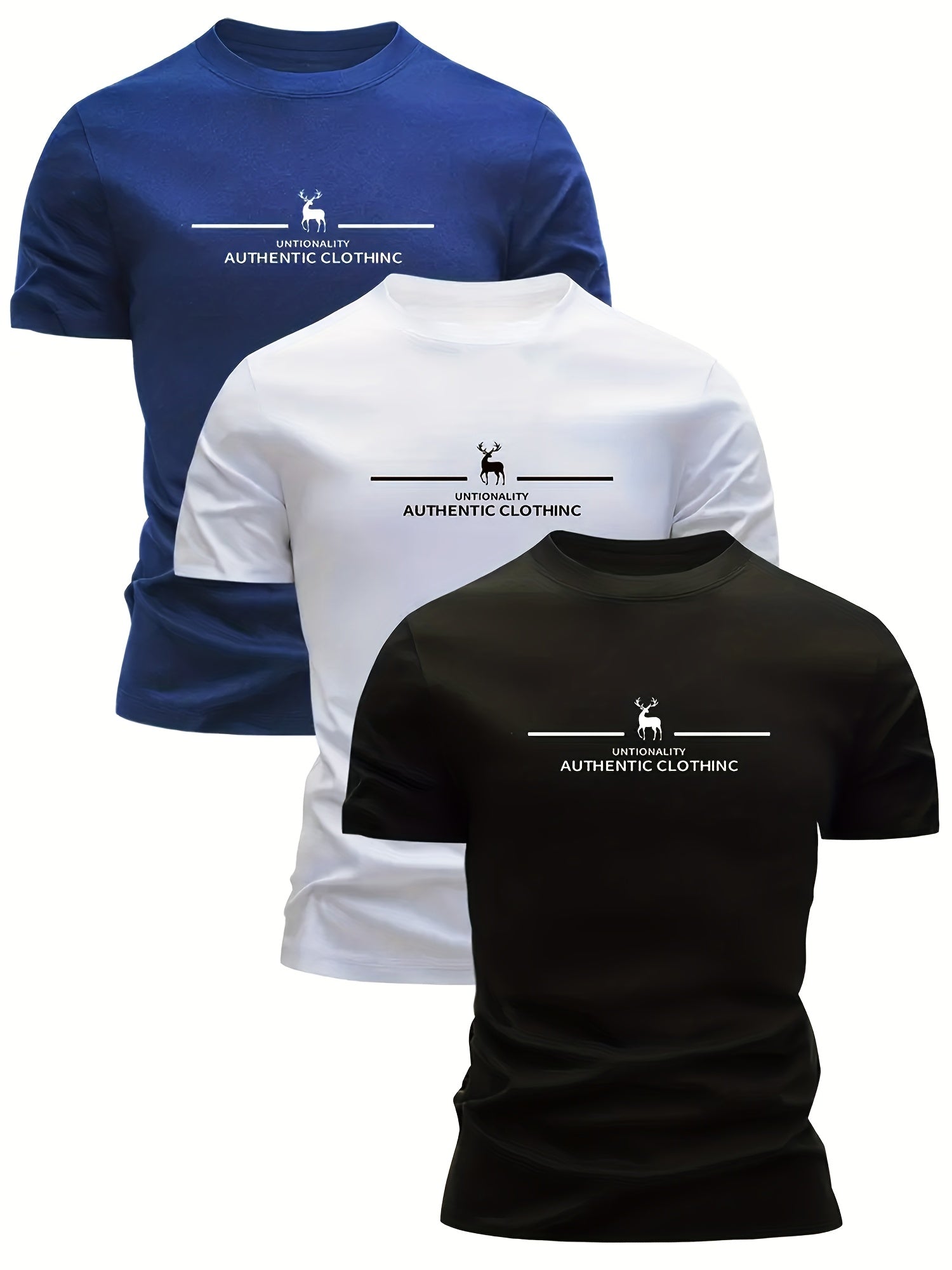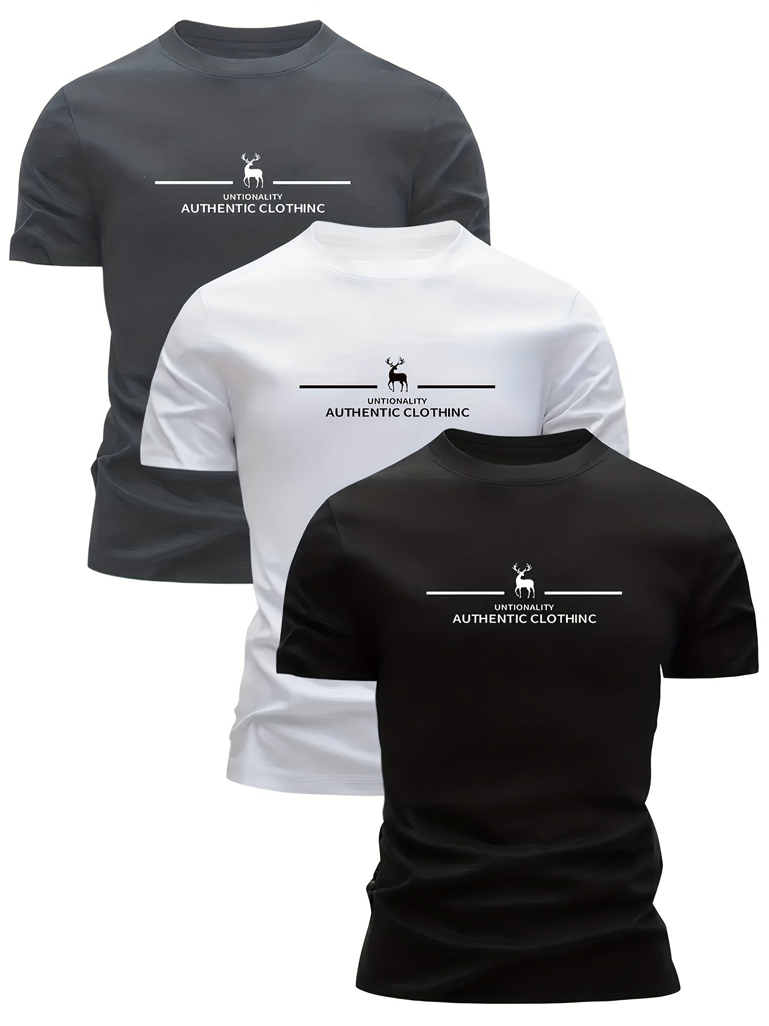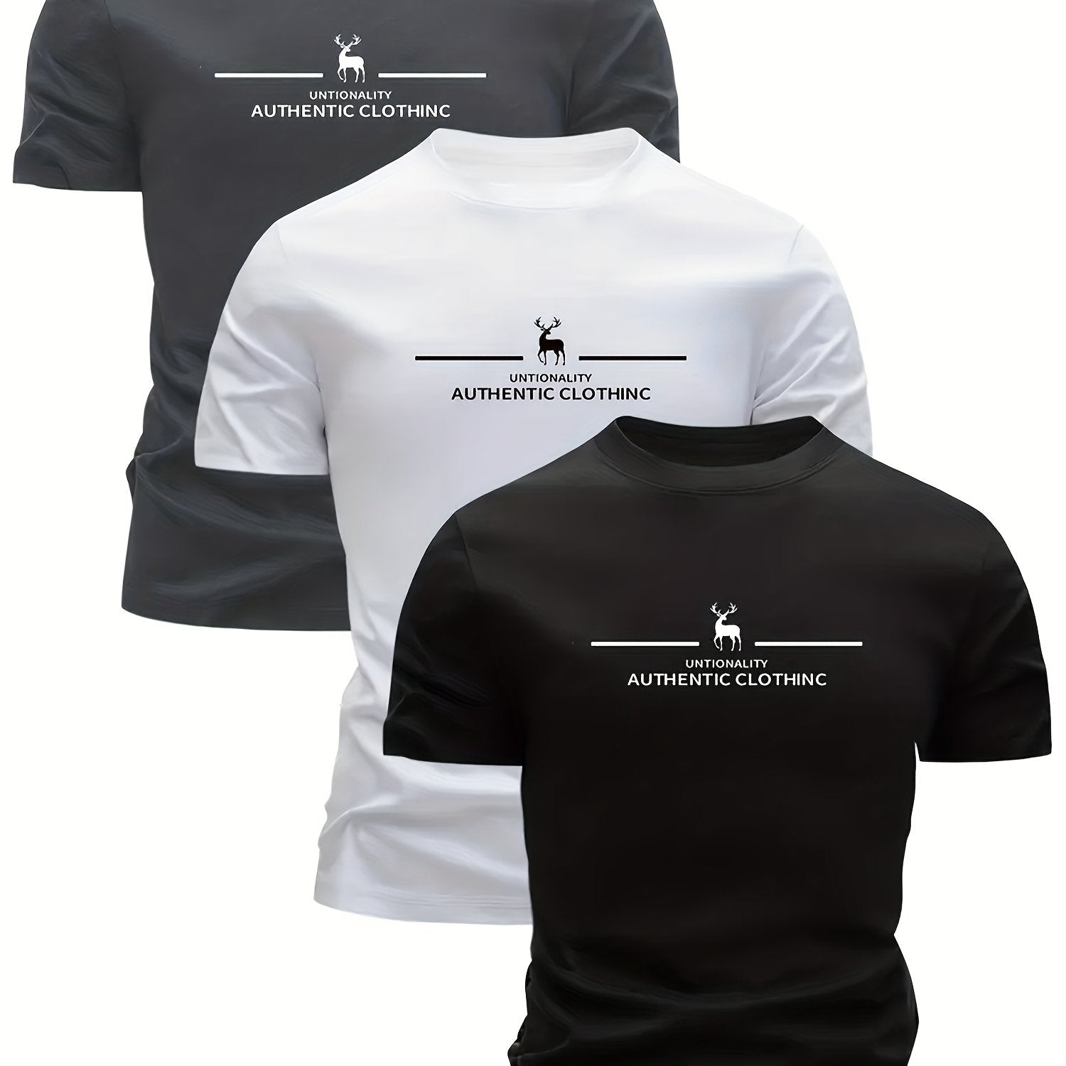 3pcs Mixed Print Deer Pattern Men's Ultra-Lightweight Round Neck T-Shirt - Quick-Dry, Breathable, Sweat-Absorbent Casual Summer Short Sleeve Shirt for Men, Gift Idea with Round Neck Design