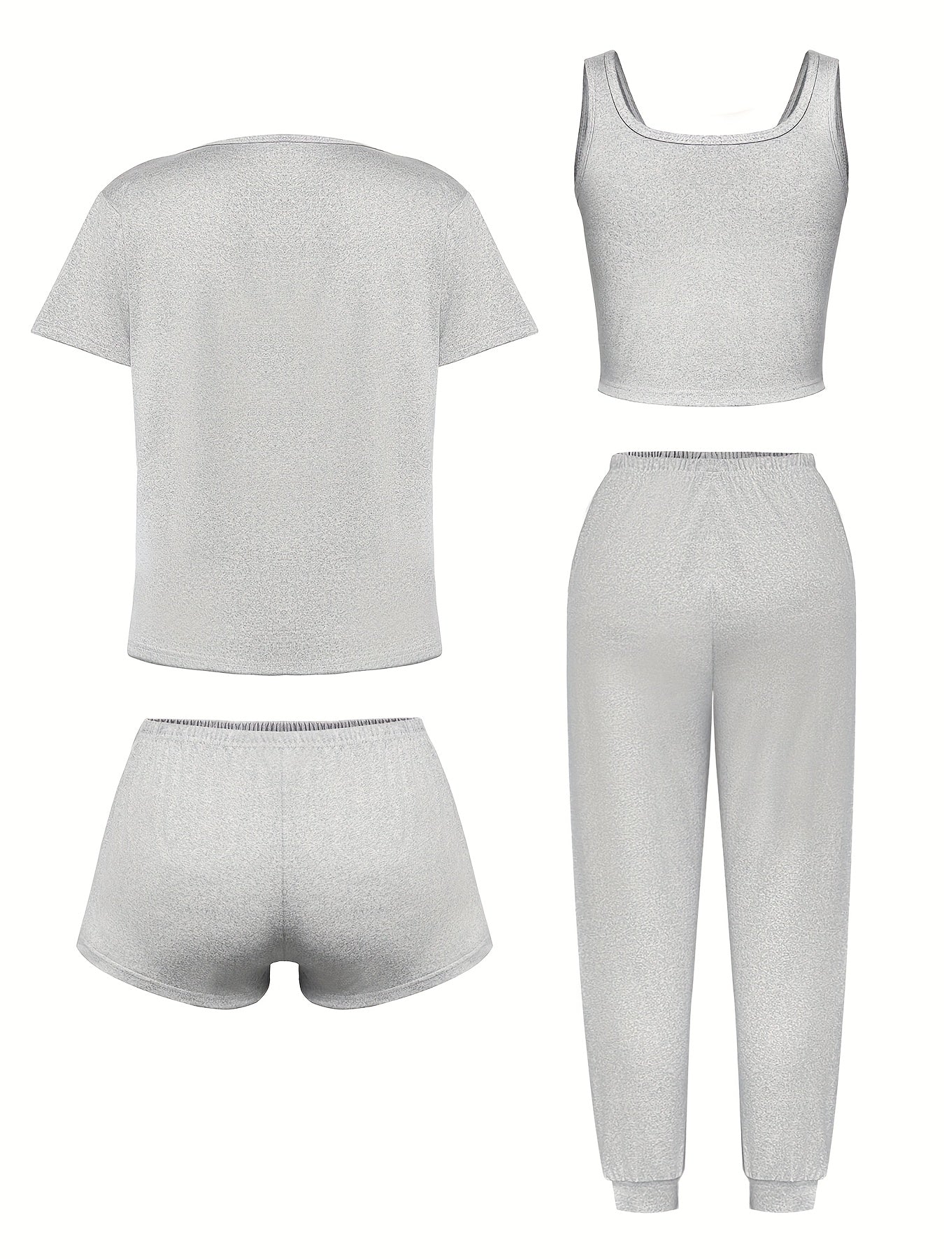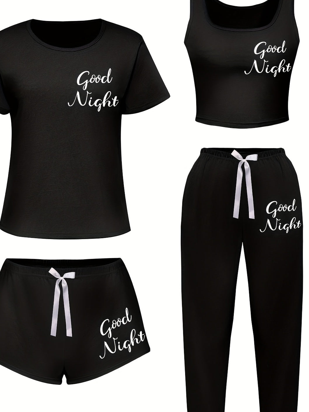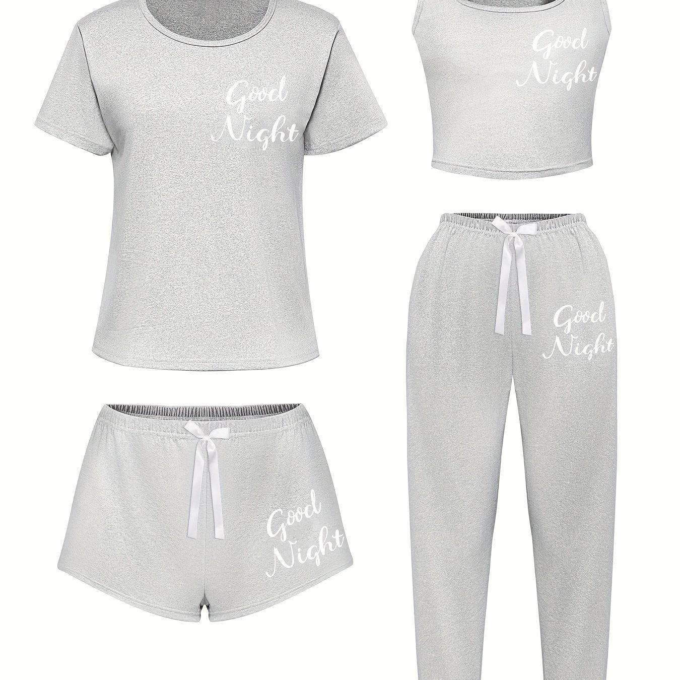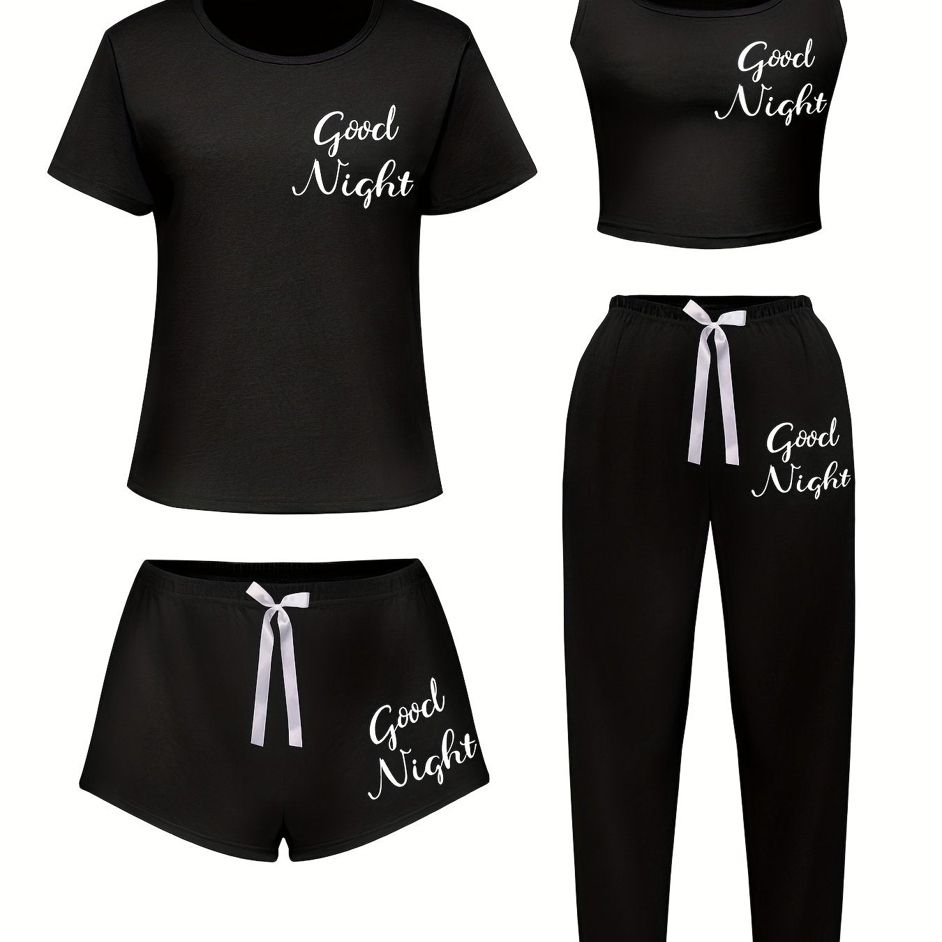 4pcs Women'S Sleepwear Set - Soft & Casual "Good Night" Print, Short Sleeve T-Shirt, Shorts & Pants with Bow Detail - Perfect for Spring, Summer, Fall & Winter - Soft, Comfortable Loungewear