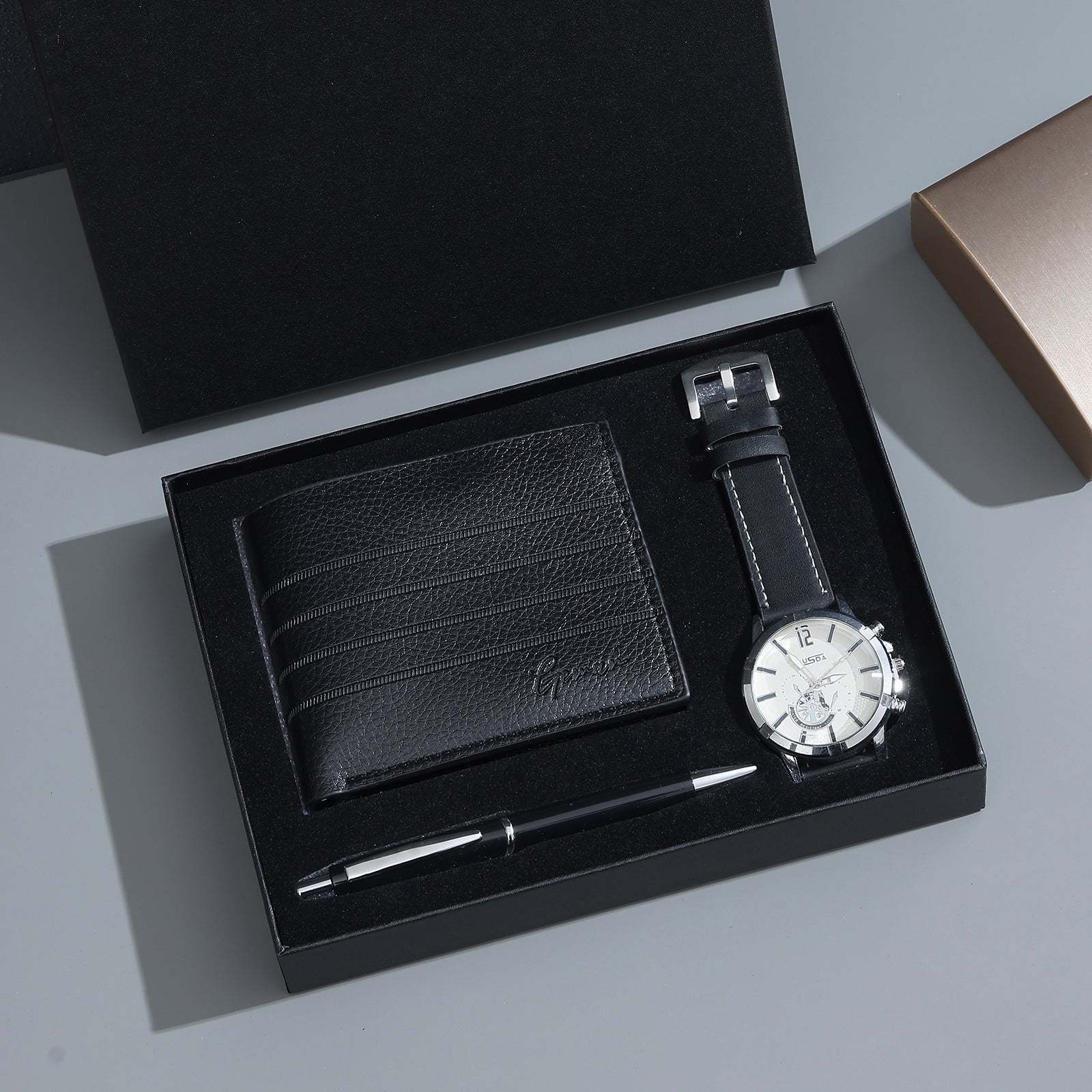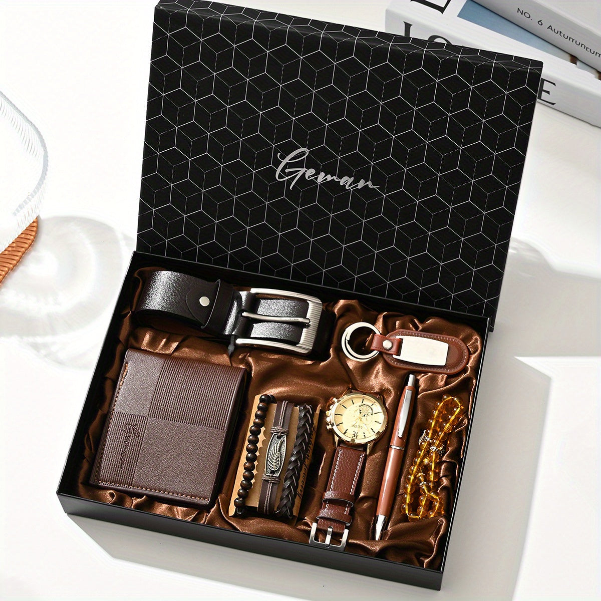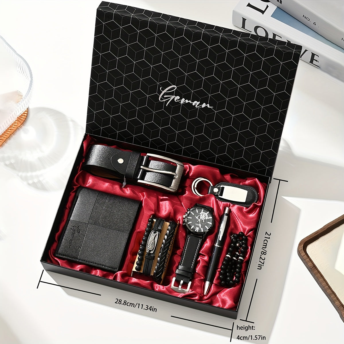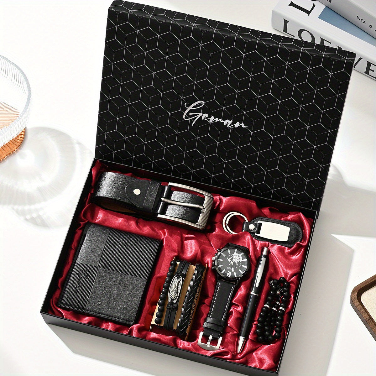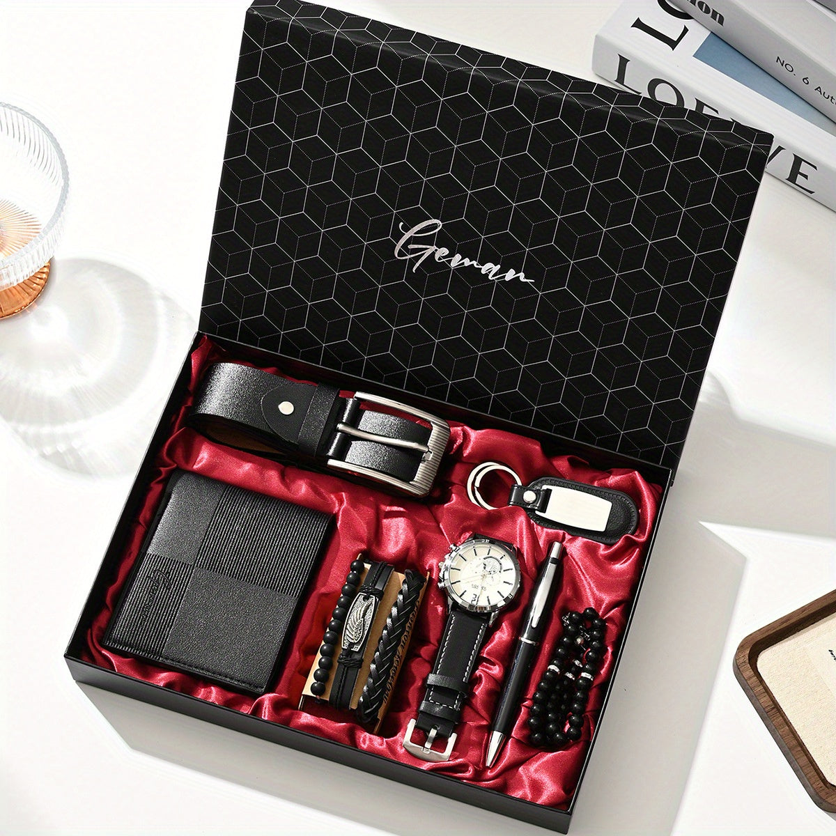 7pcs/set-Men's PU Leather Business Casual Watch Set (wallet + Belt + Keychain + Bracelet + Watch + Pen + Rosary), Minimalist Quartz Watch Set, Exquisite Watch Gift Box, Valentine's Day Gift Box.