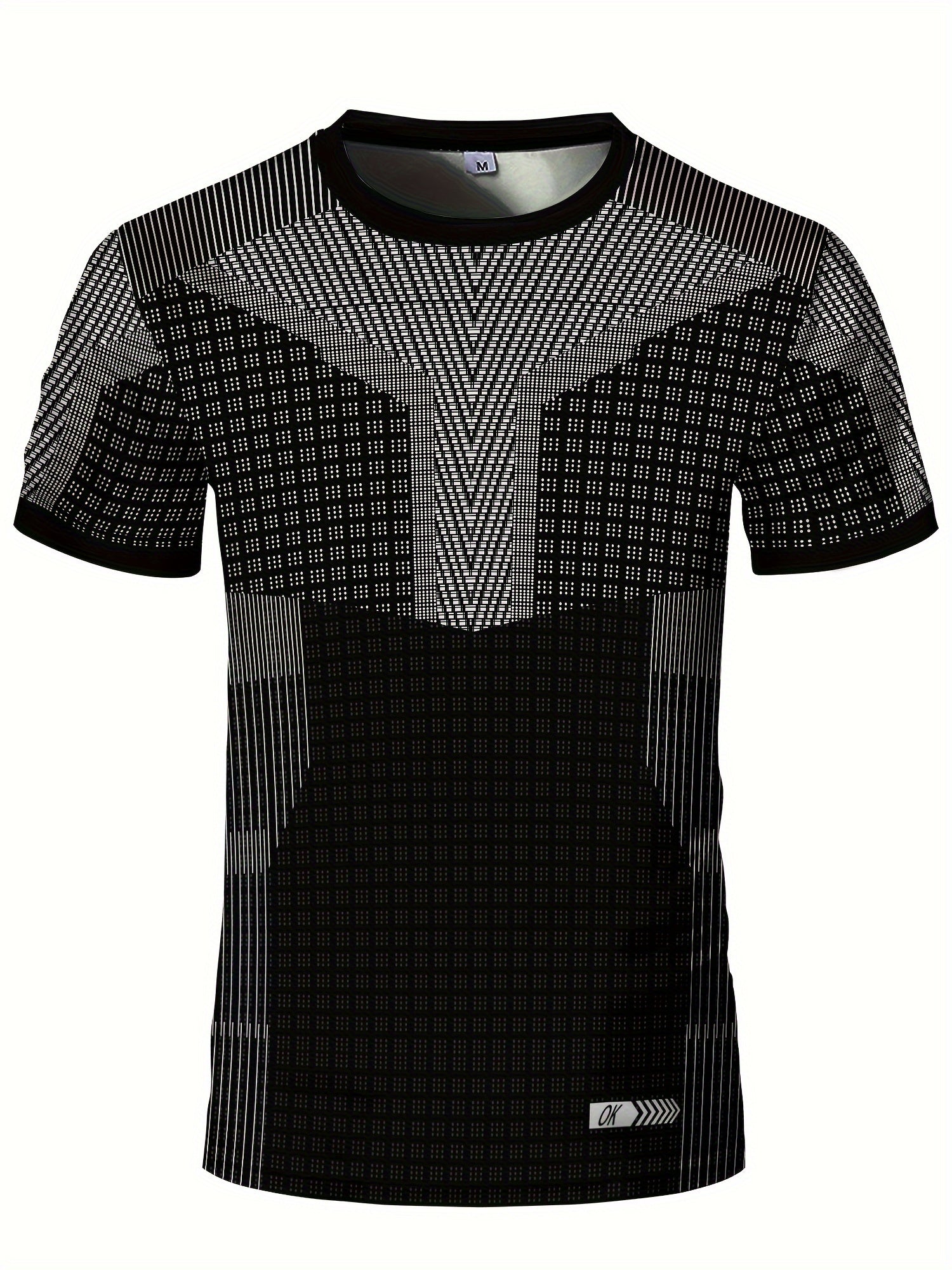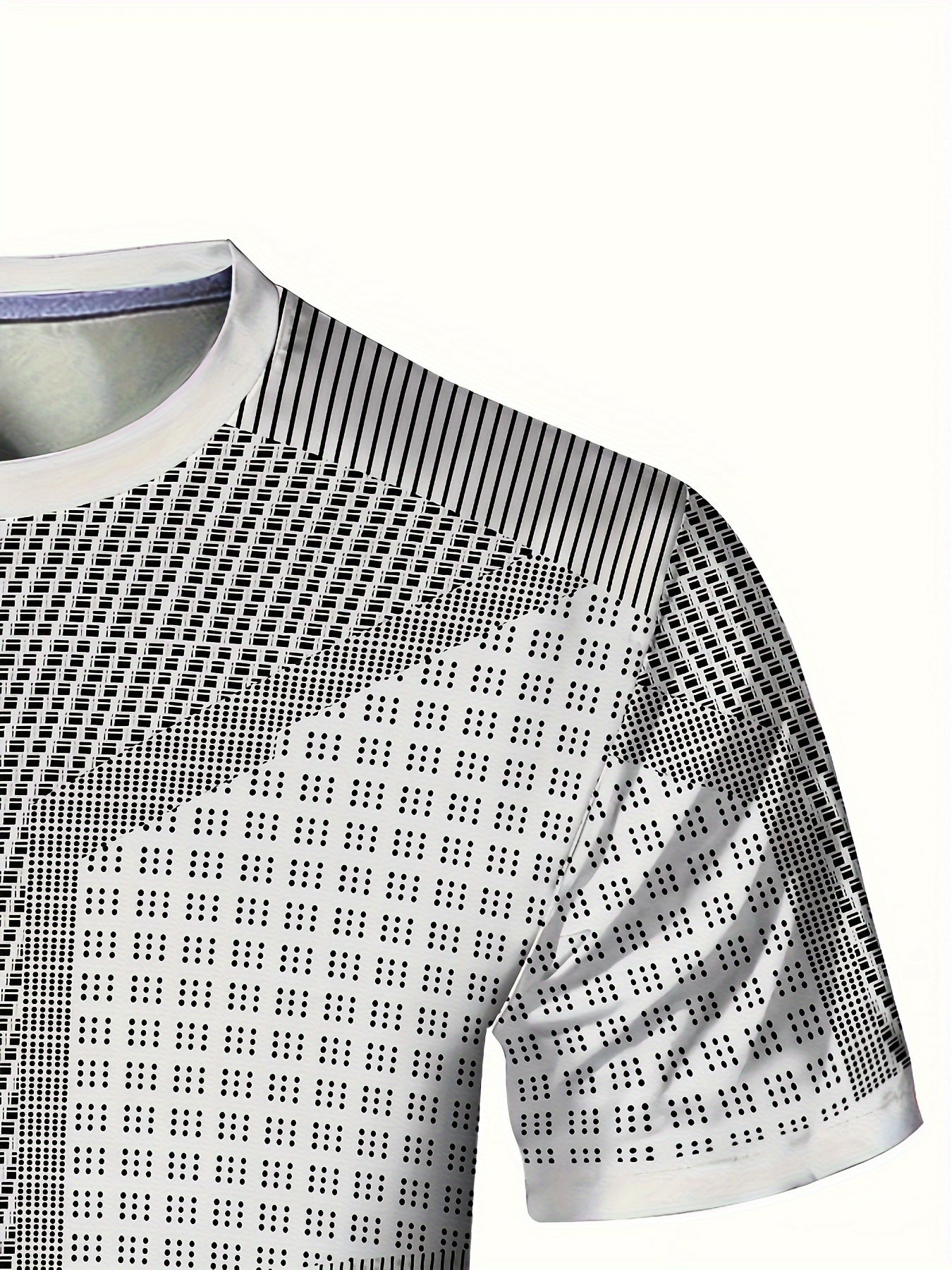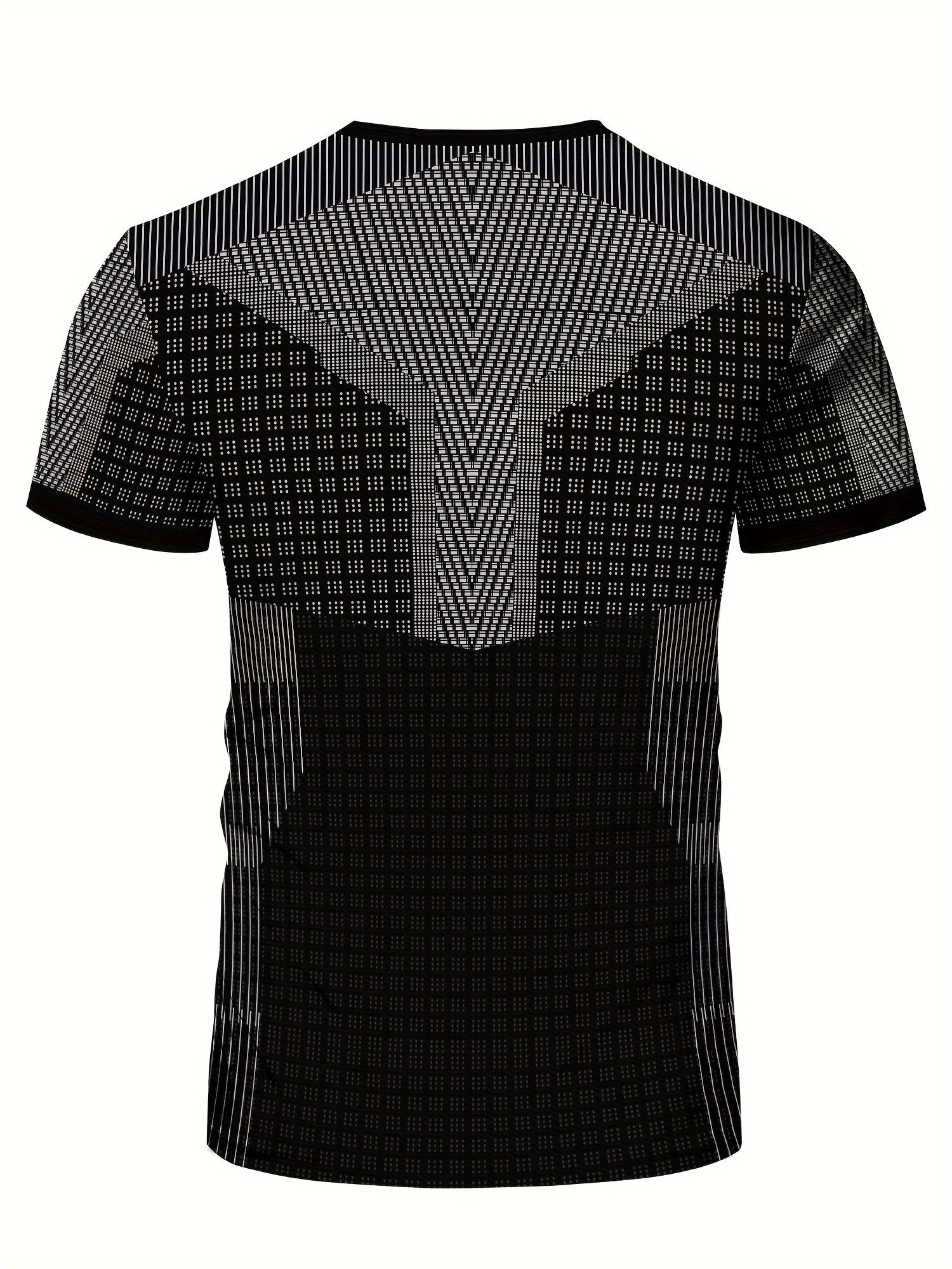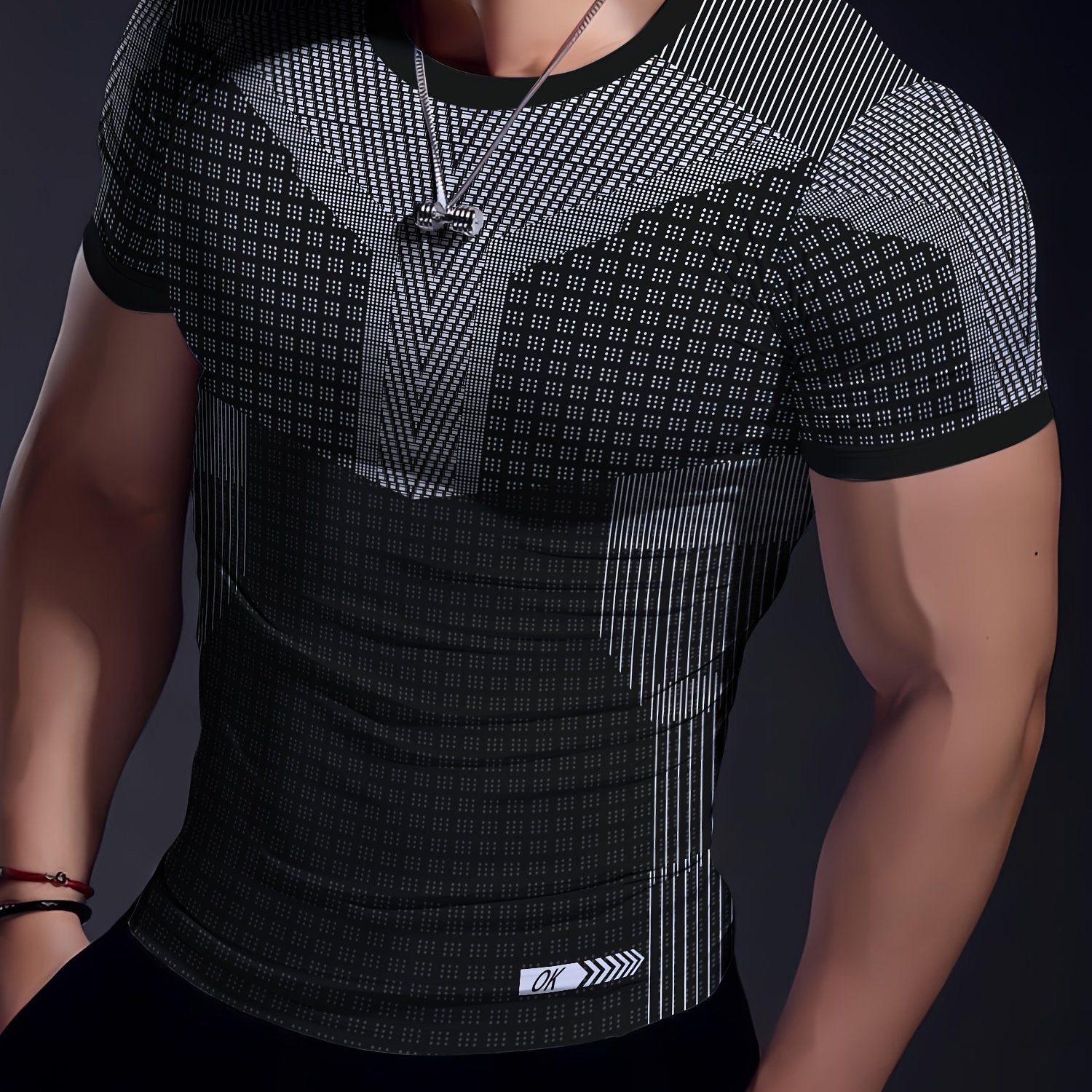 A Black And White Patterned Print Design, Men'S Sporty Fashion, Geometric Print High-Elastic Tight-Fitting Short-Sleeve Round-Neck T-Shirt, Quick-Drying Sports Top for Summer Fitness, Training, And Workout, with a Cool Feel,
