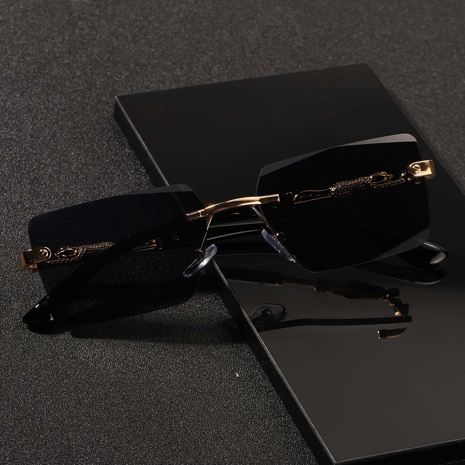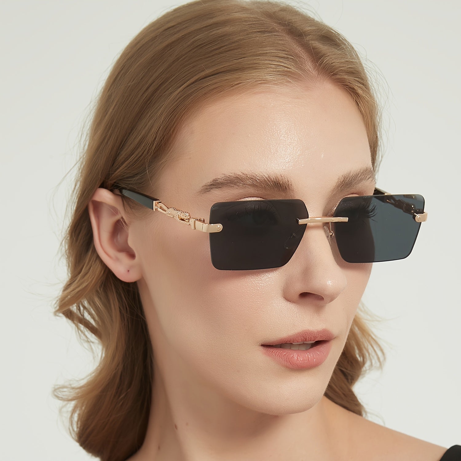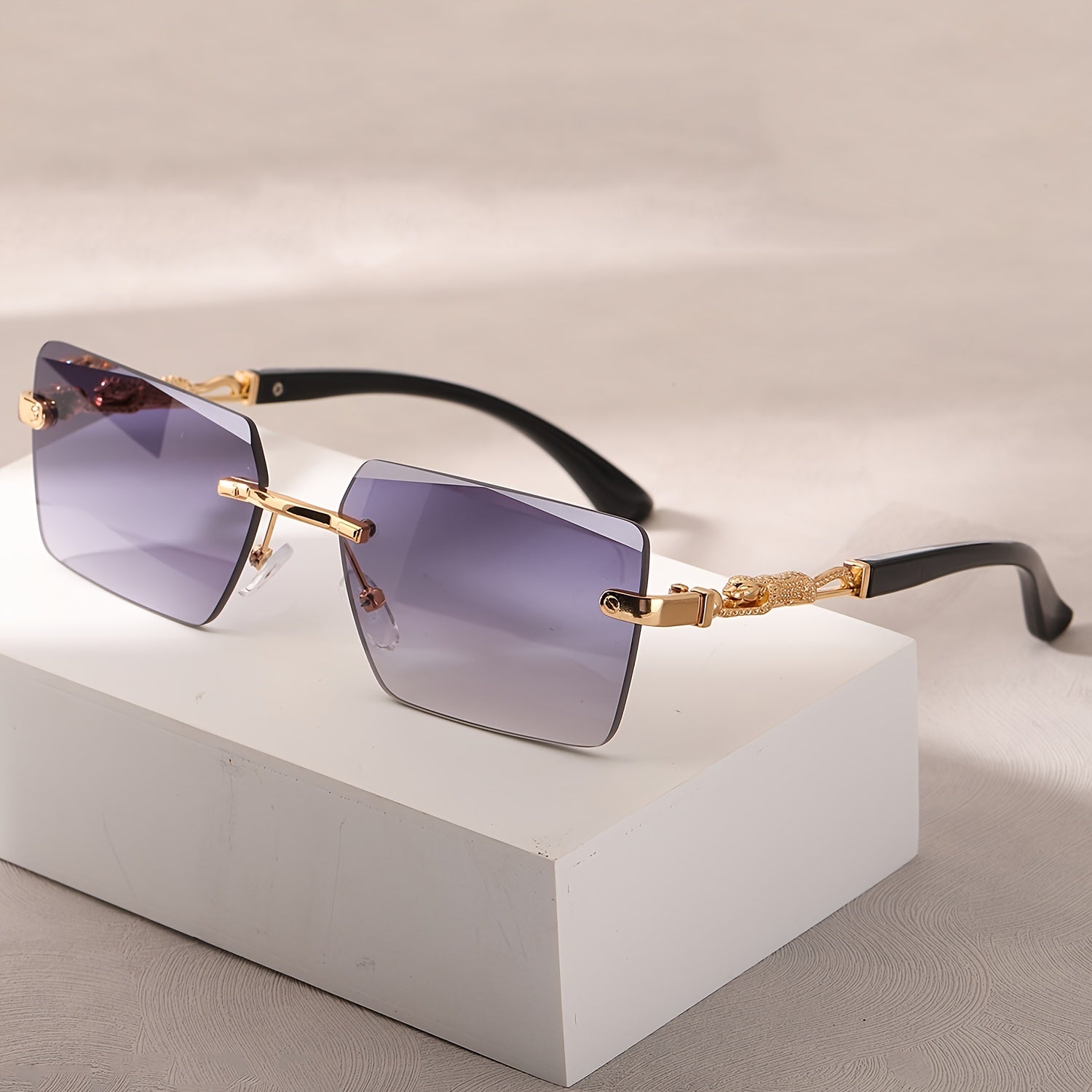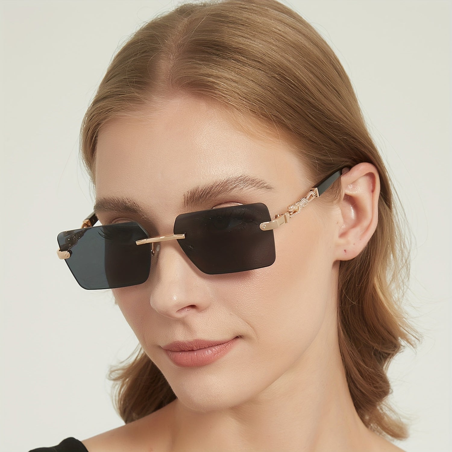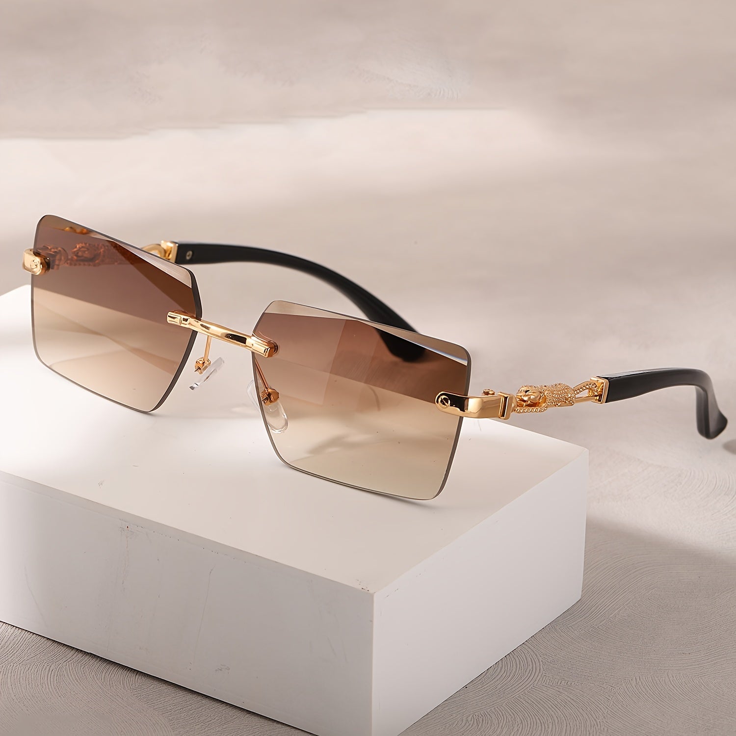 A pair of fashionable glasses with a retro style, featuring rimless leopard print temples and a compact trendy frame