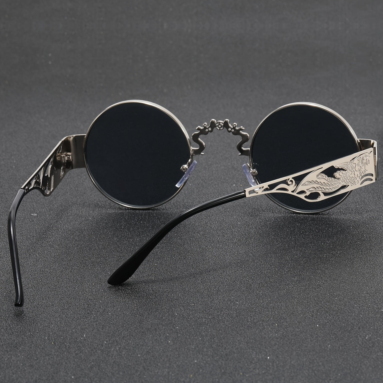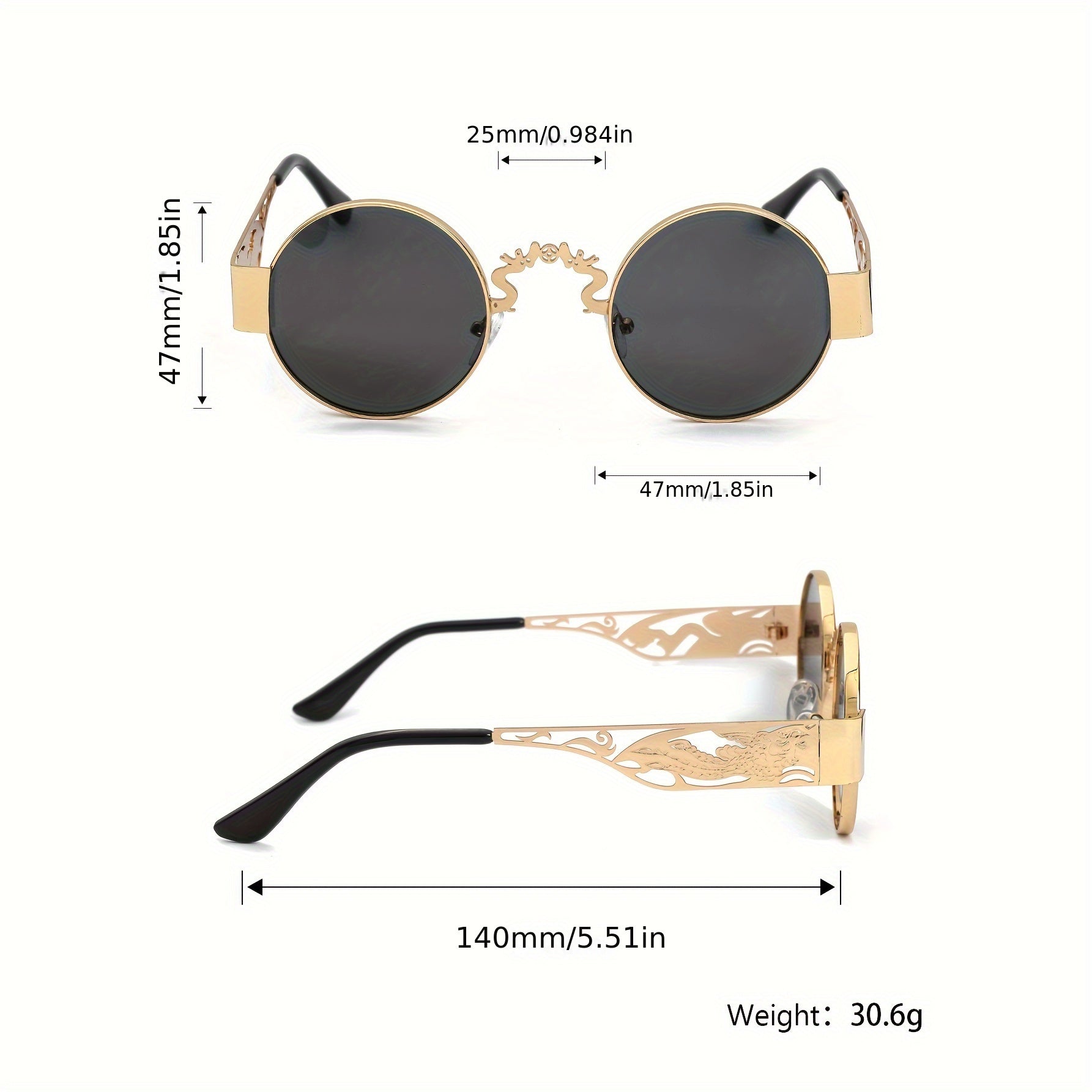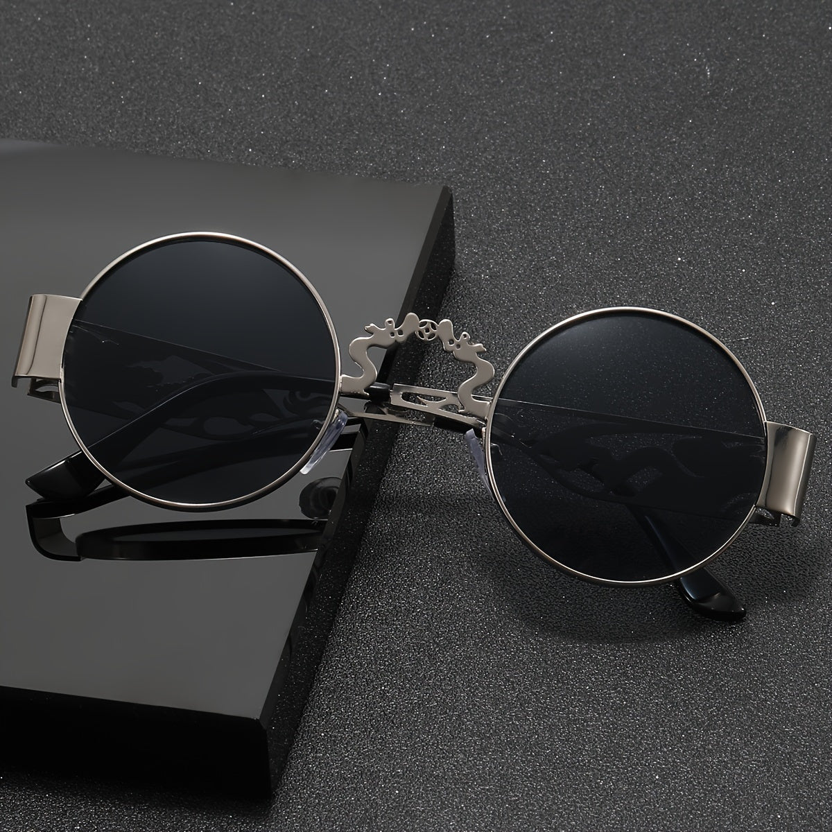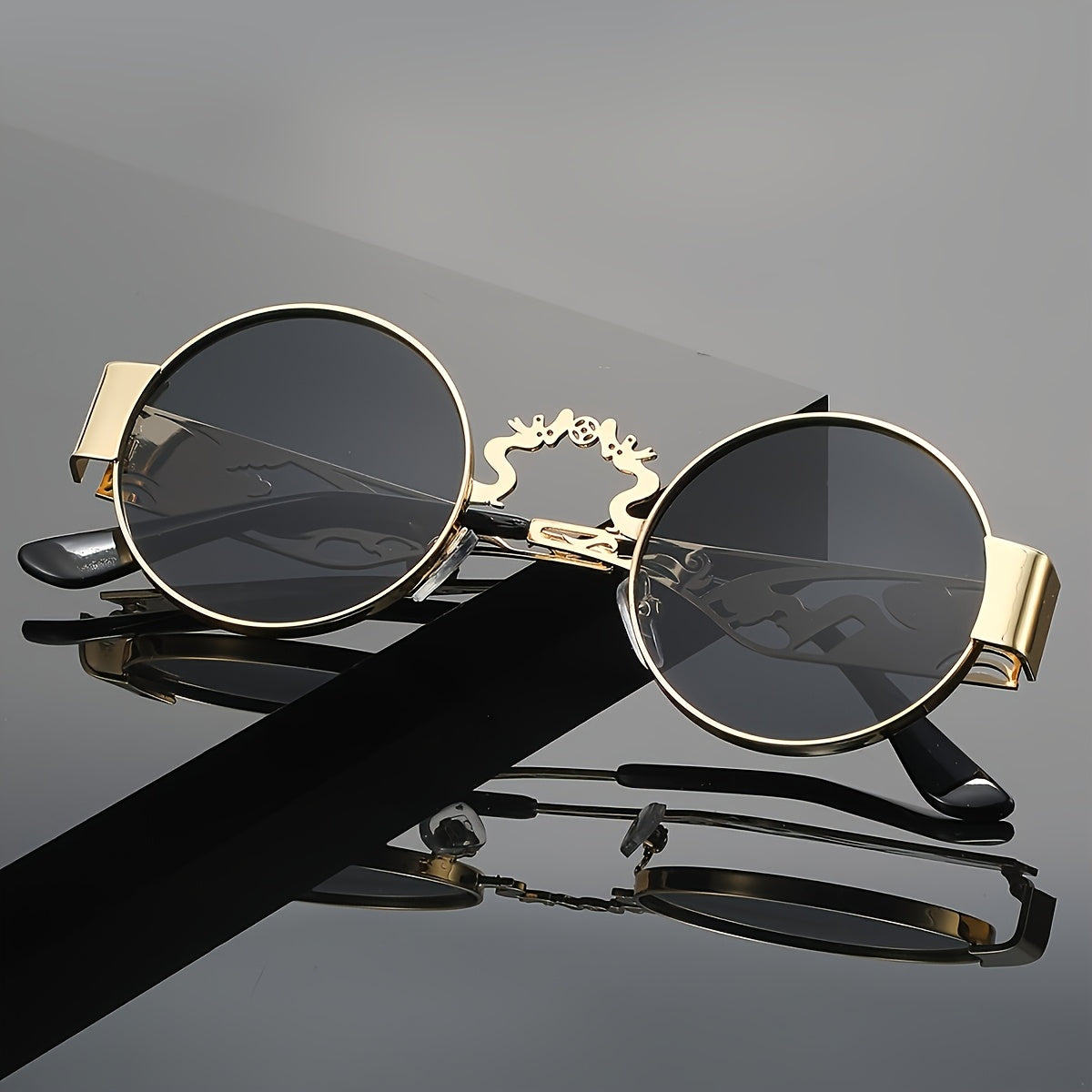 A Pair Of Men's Stainless Steel Retro Round Frame Glasses, Chinese Dragon And Phoenix Carving Hollow Arms, Casual Hip-hop Punk Street Party Fashion Trend Decorative Glasses, With PC Lenses