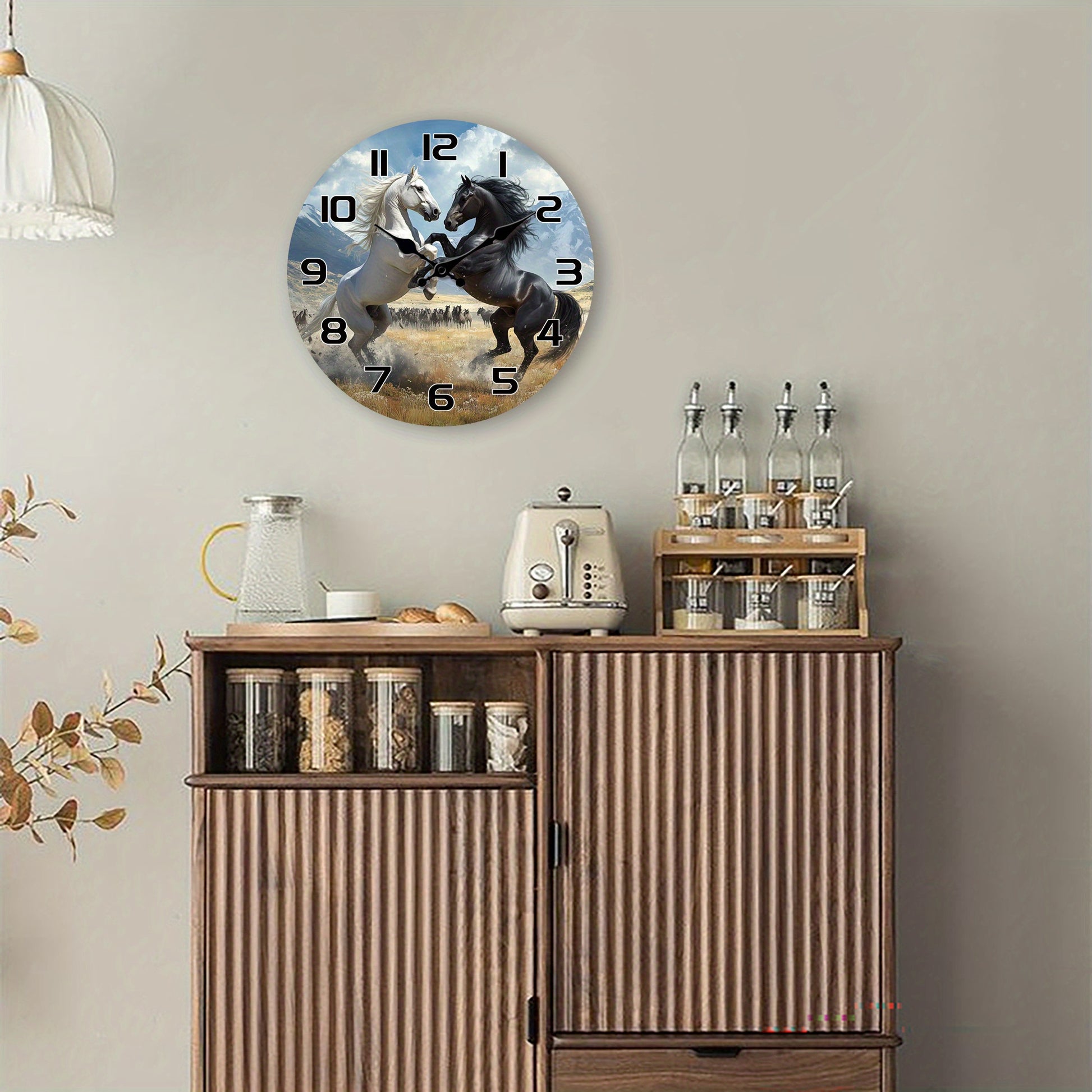 A Wooden Wall Clock with a Fantasy Theme Featuring a Design of Two Horses Facing Each Other, a Silent Clock Suitable for Decorating Living Rooms, Bedrooms, Kitchens, And Offices, Making It an Exciting Gift for Birthdays And H