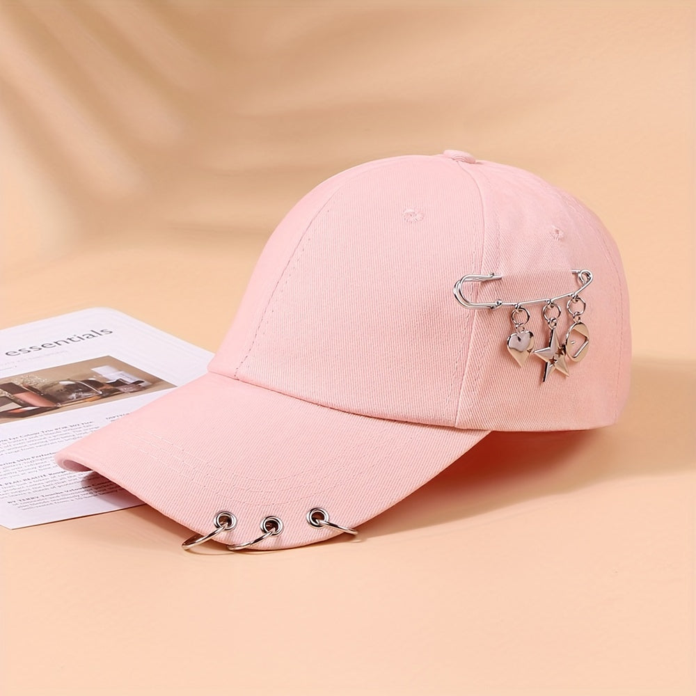 Adjustable Black Polyester Baseball Cap for Women - Trendy Korean Style with Heart & Star Pin, Versatile Fashion Accessory for Spring/Summer, Baseball Cap
