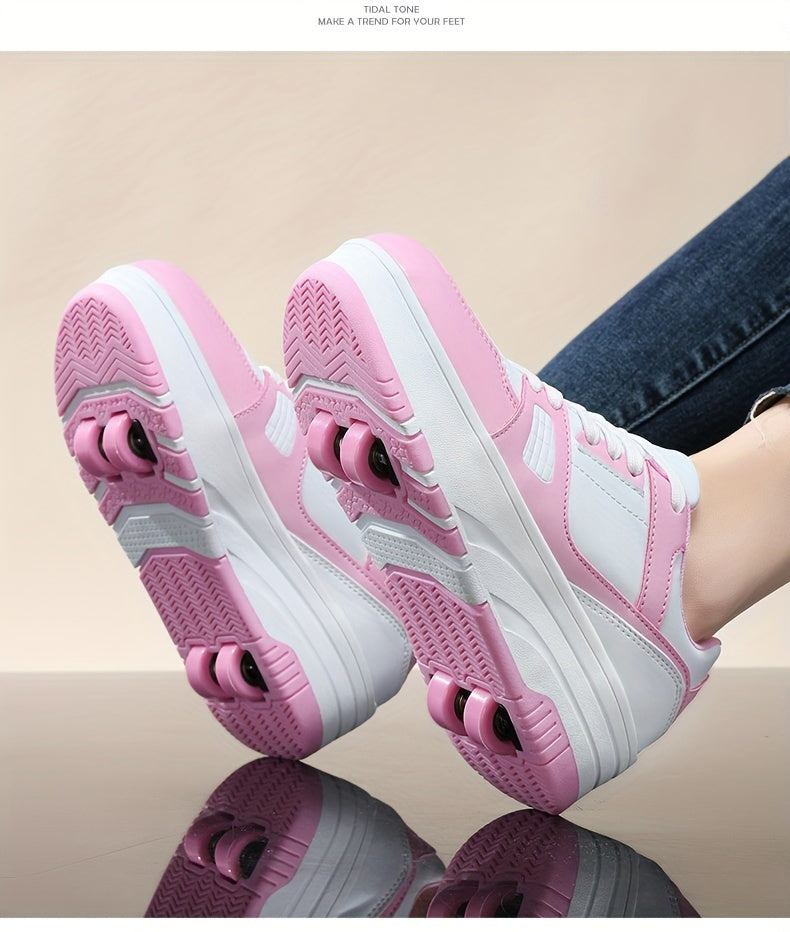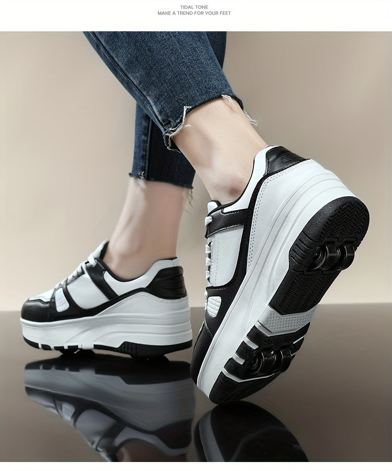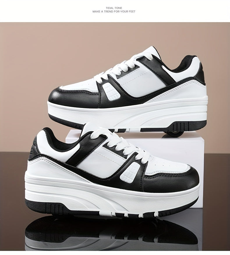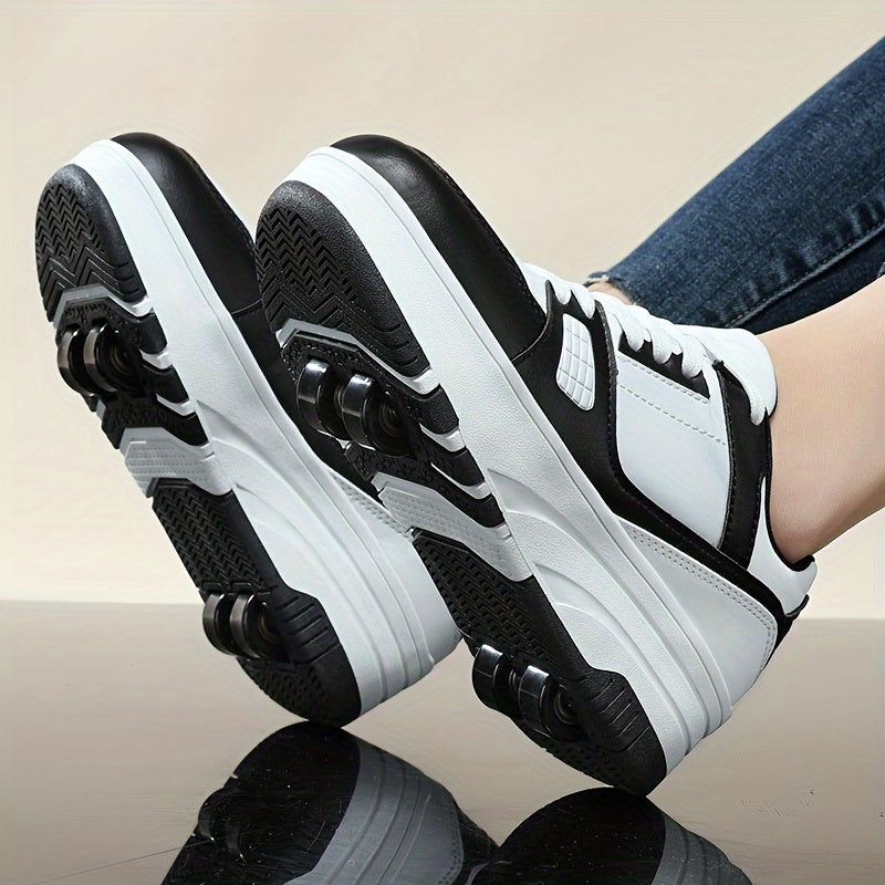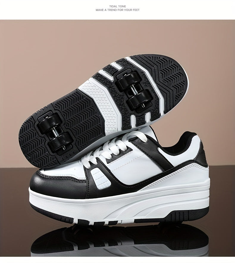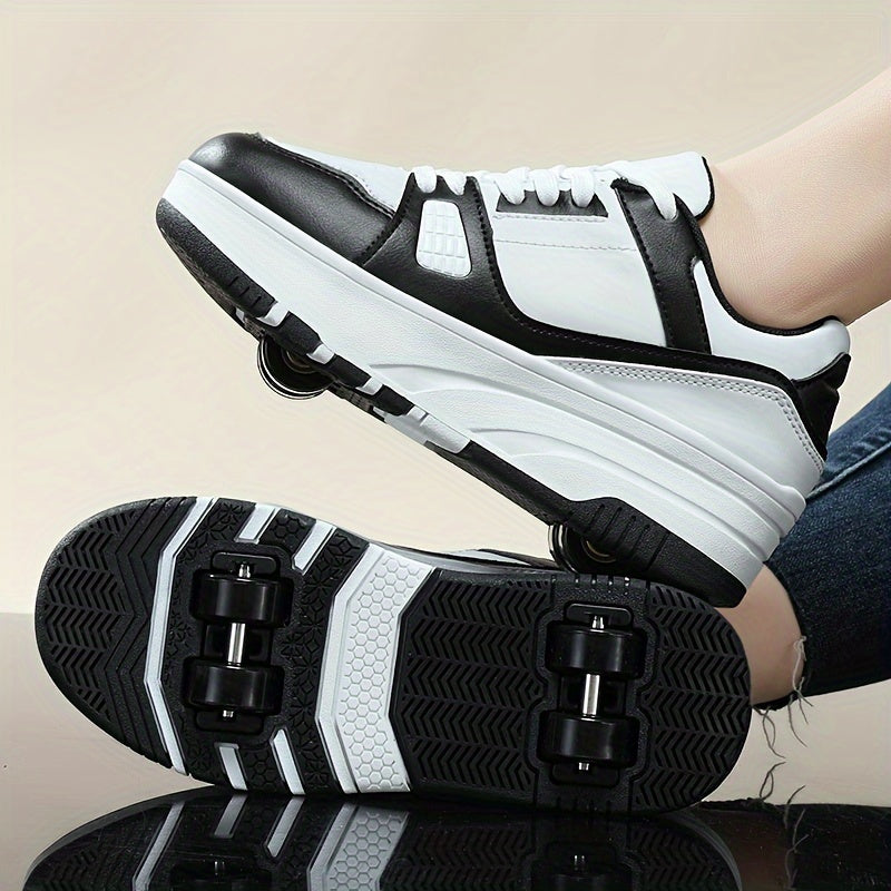 Boys' Fashion Roller Skate Footwear - Non-Slip Dual Wheel, Lace-Up with Durable Buckle Straps, Black & White, Suitable for All Seasons
