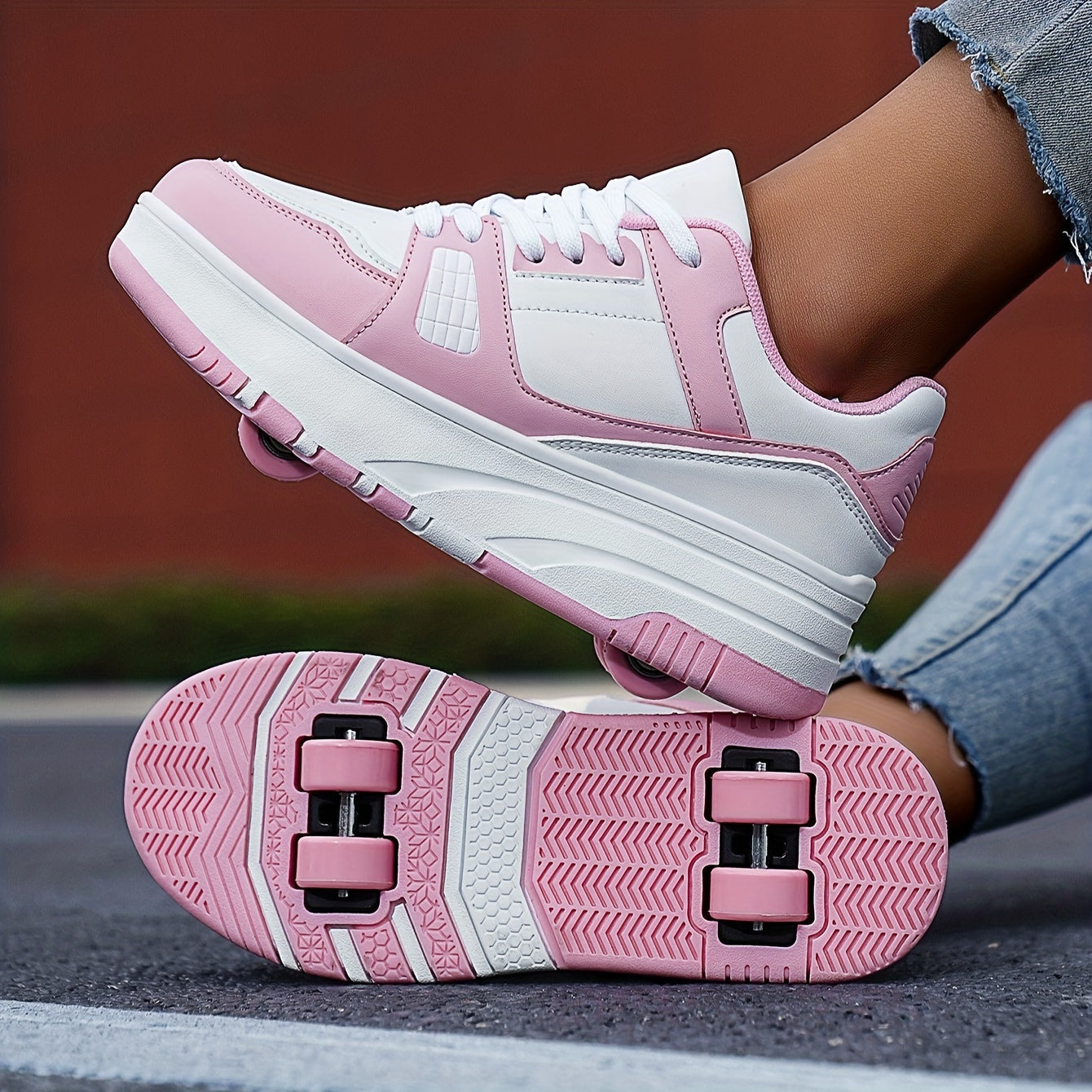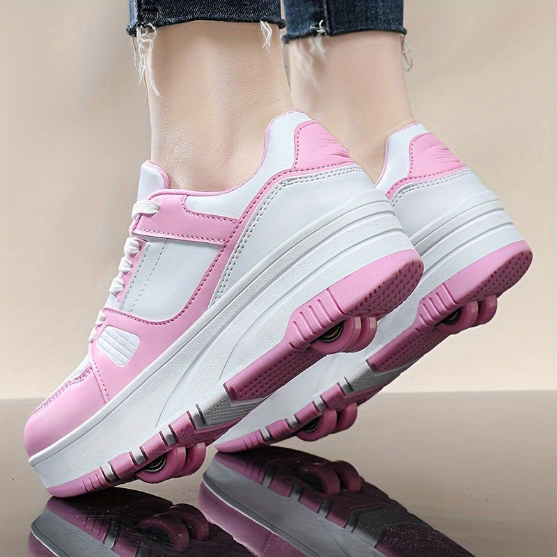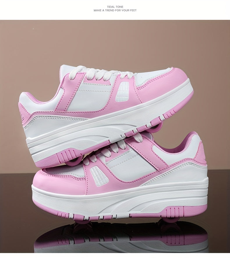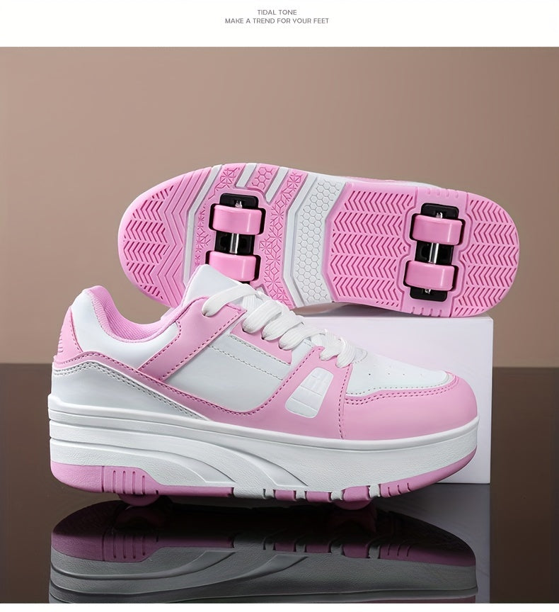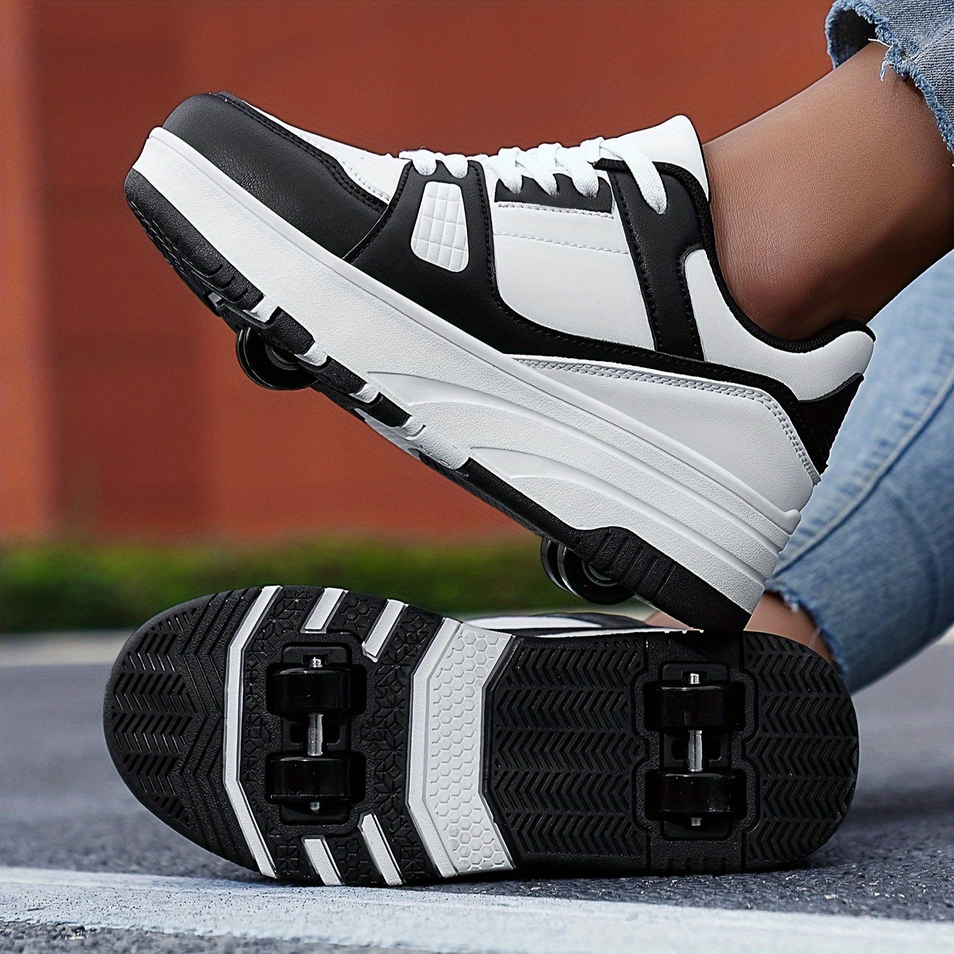 Boys' Fashion Roller Skate Footwear - Non-Slip Dual Wheel, Lace-Up with Durable Buckle Straps, Black & White, Suitable for All Seasons