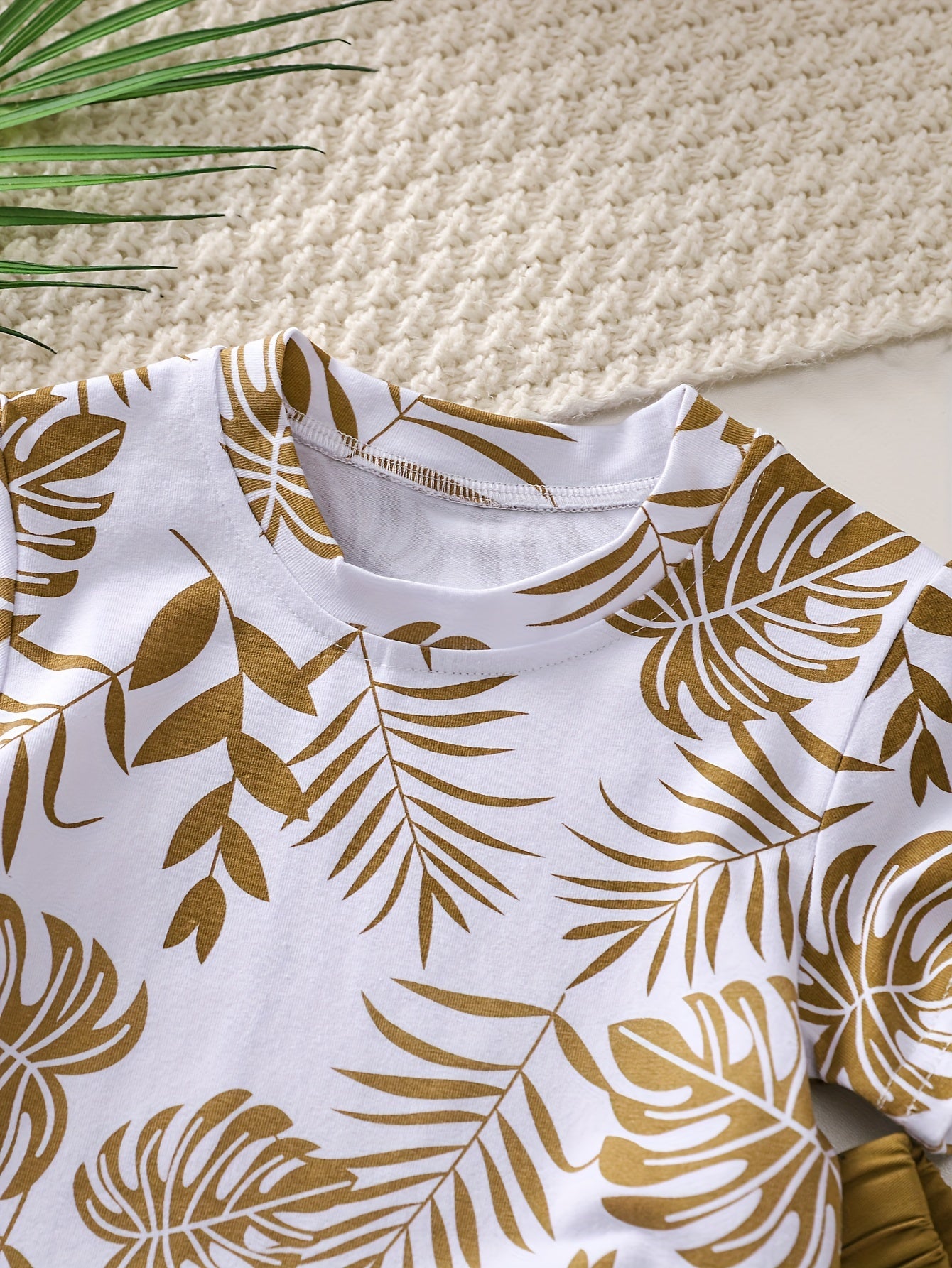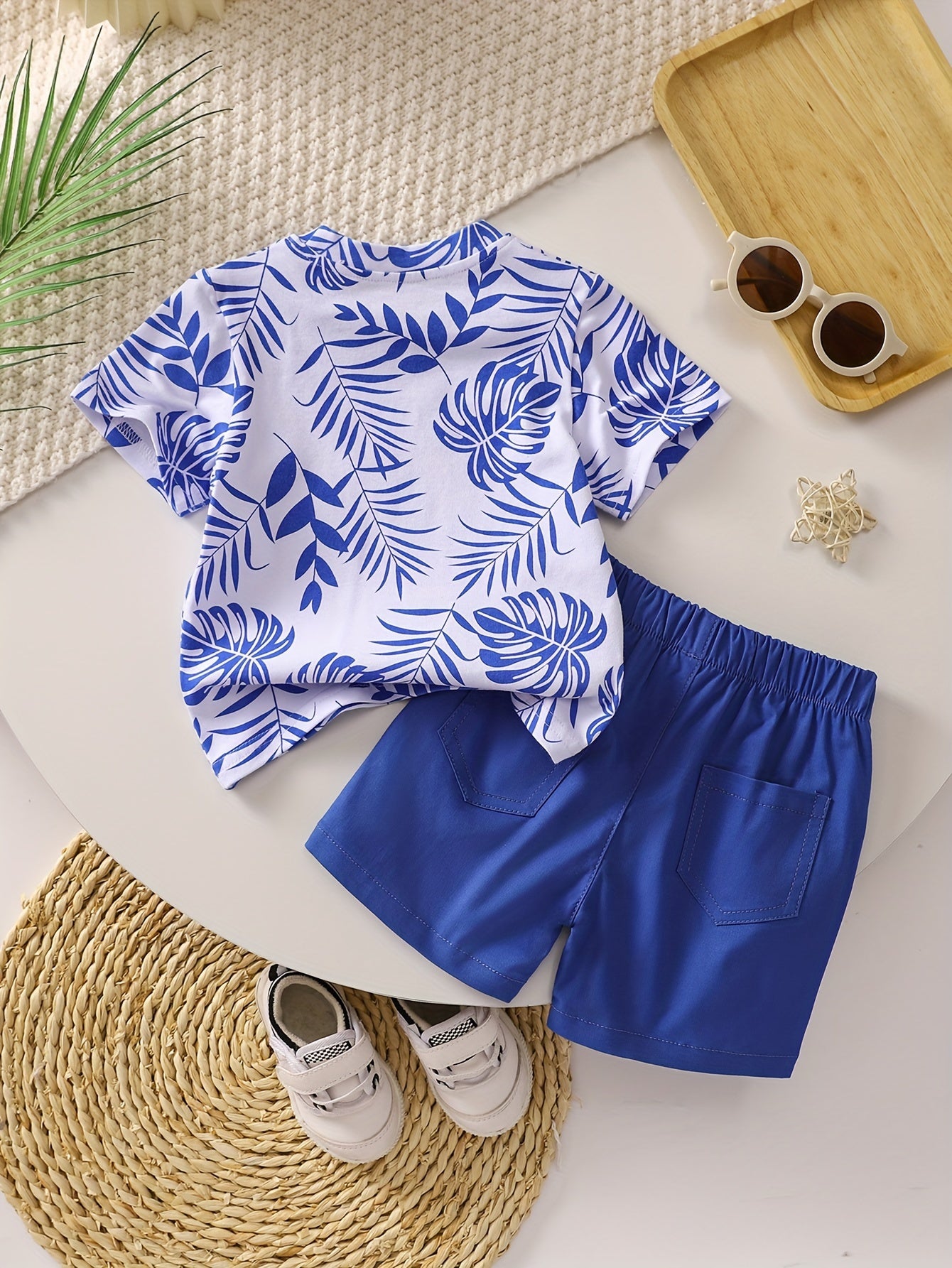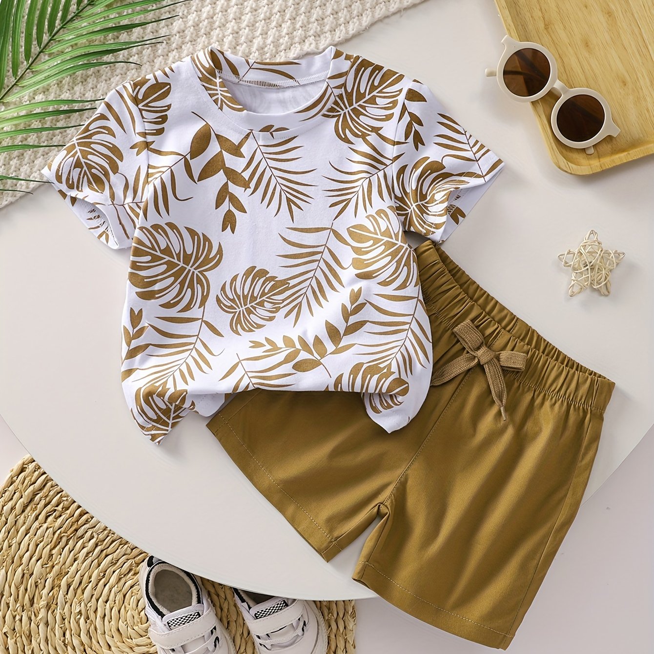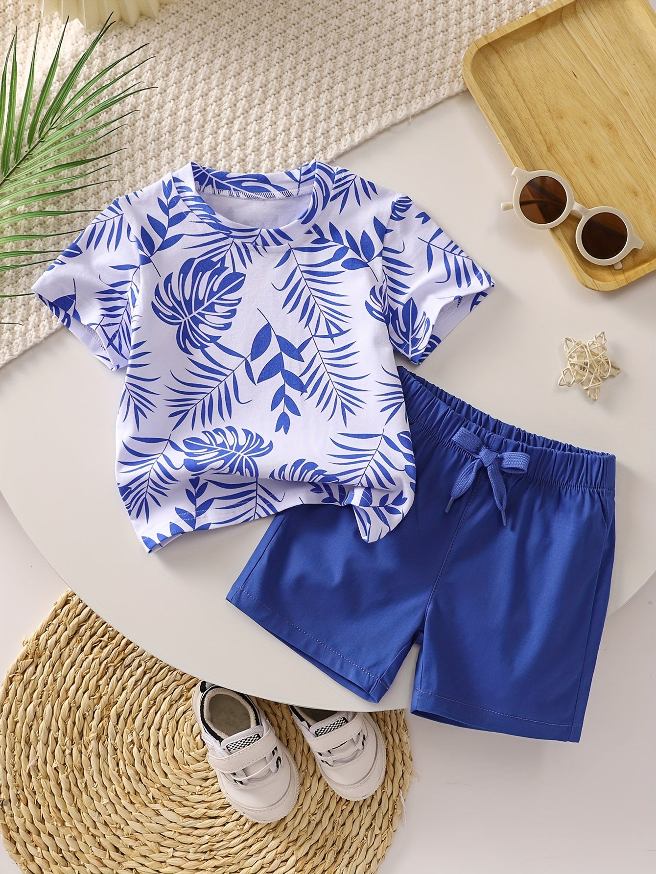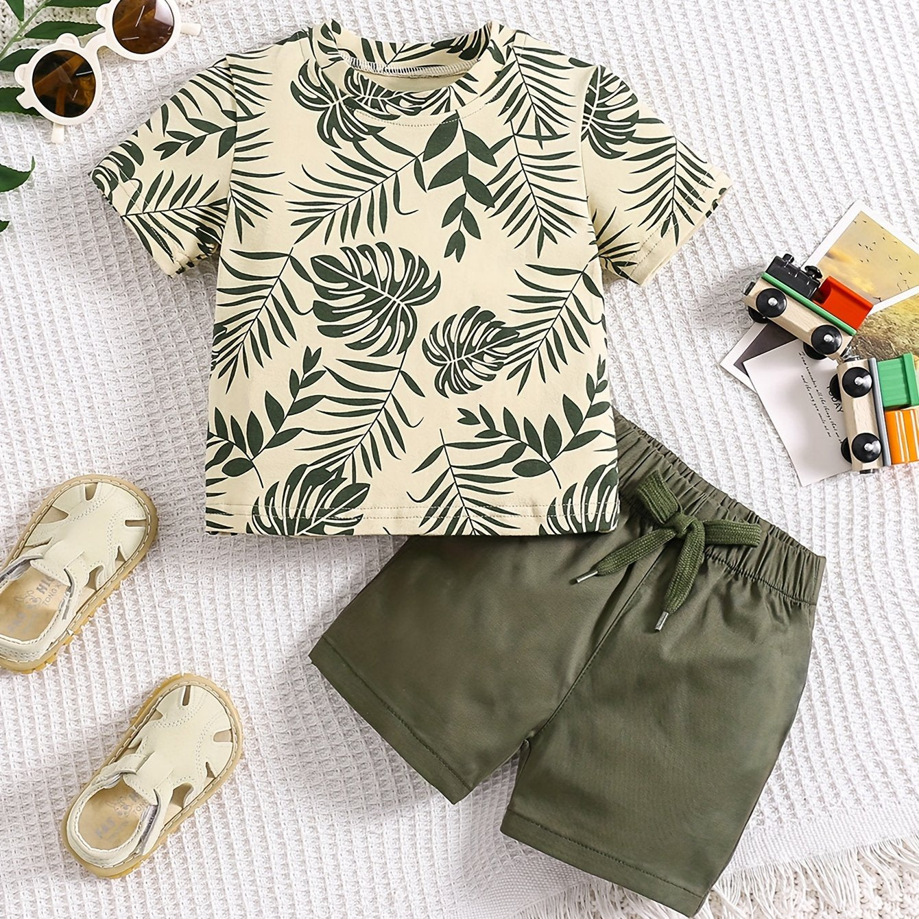 Boys' Tropical Leaf Print Cotton Blend Casual Outfit - Short Sleeve Tee & Drawstring Shorts Set, Machine Washable for Spring/Summer, Perfect for Outdoor