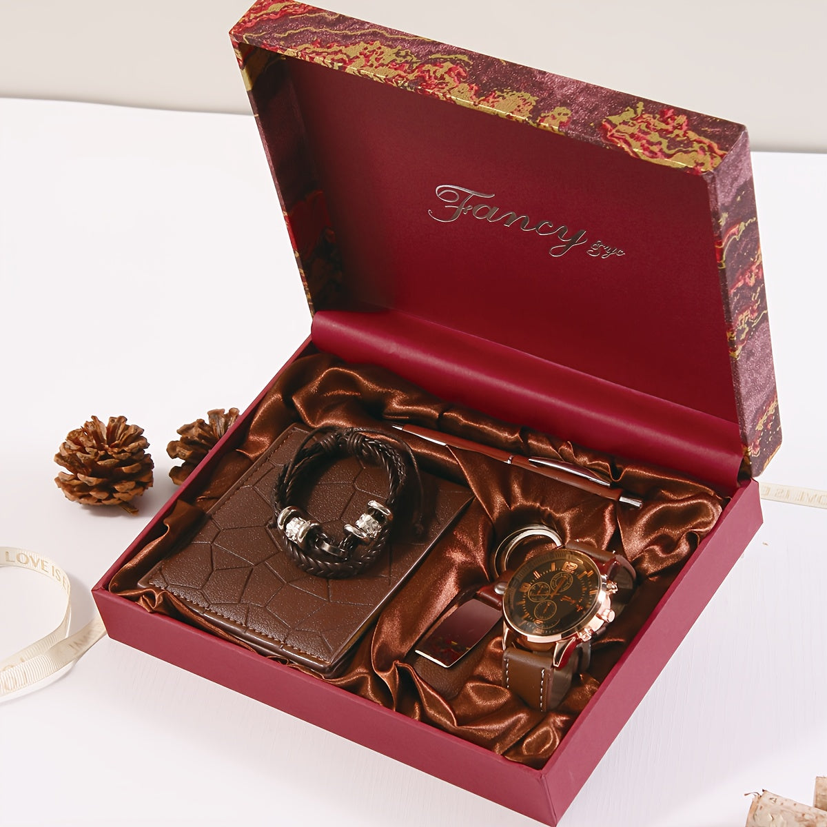 Christmas Gift Box Set of Six, Wallet + Watch + Bracelet + Keychain + Pen + Wooden Gift Box