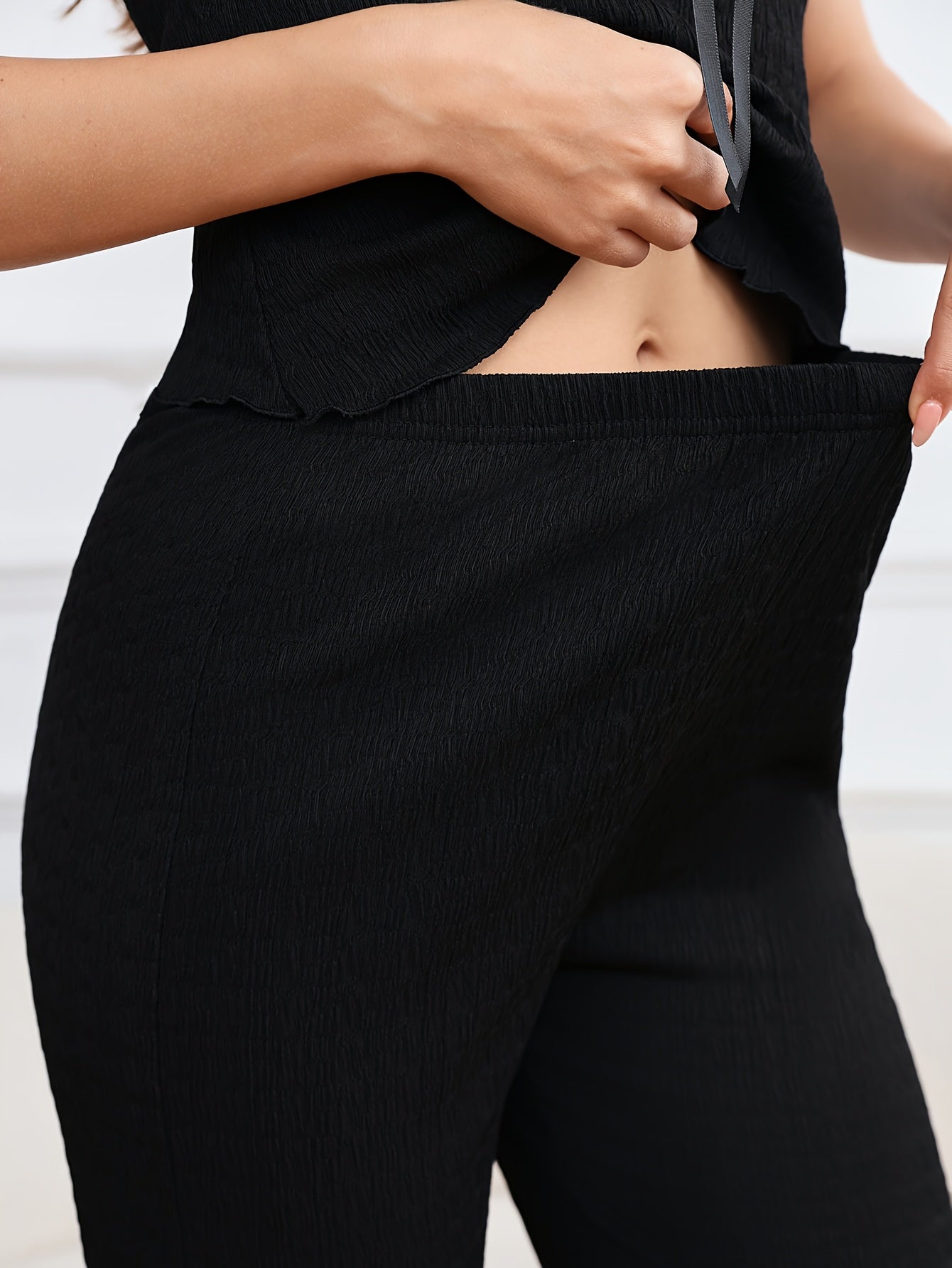 Elegant Brown Jacquard Pajama Set for Women - V-Neck Blouse with Lace Trim & Bow Detail, Wide-Leg Pants, Perfect for Summer Comfort, Cozy Home Wear|Vneck Blouse|Jacquard Fabric