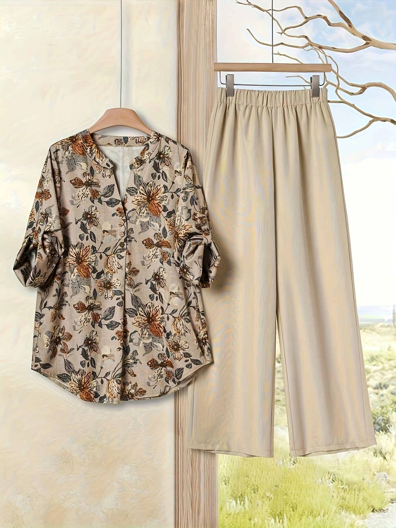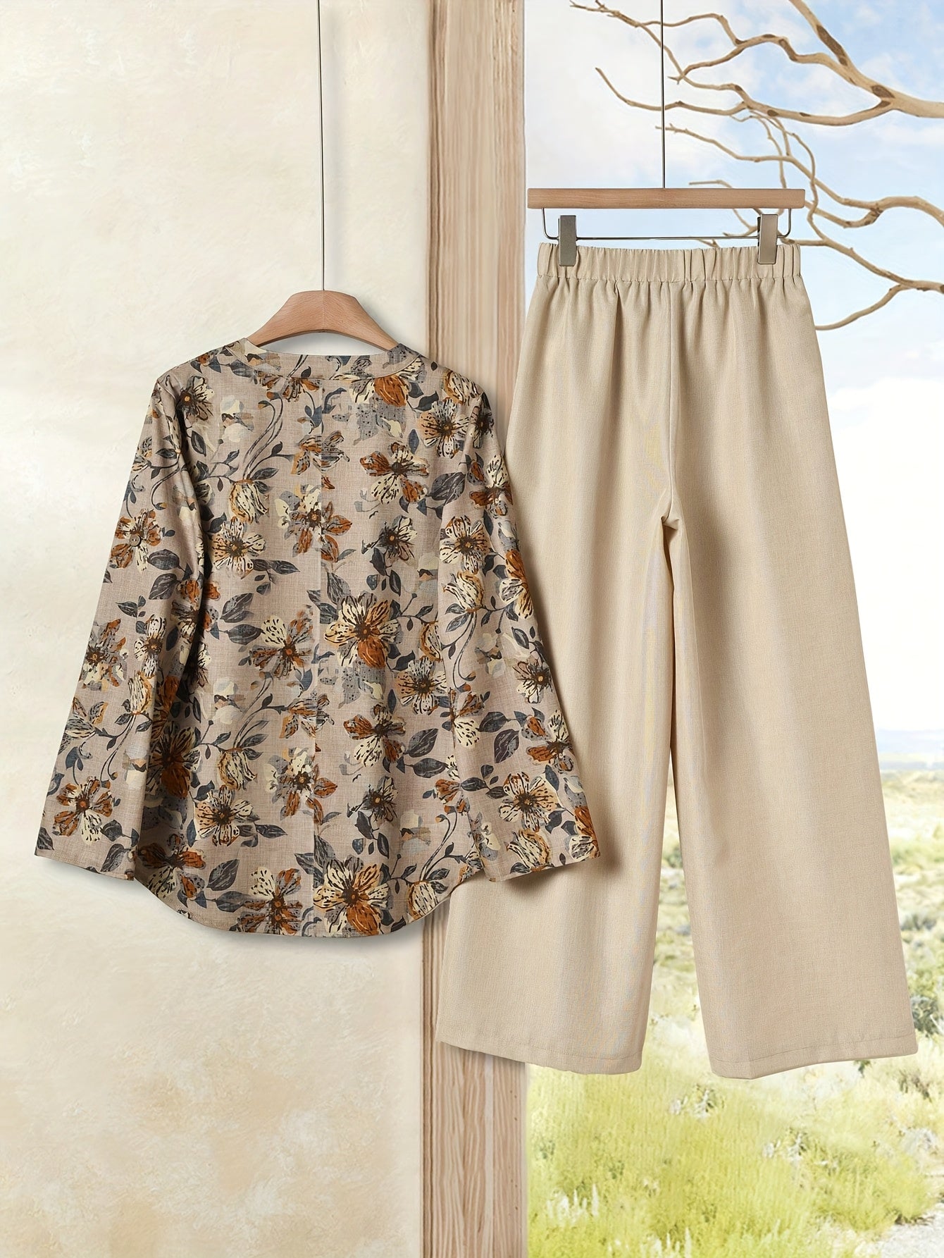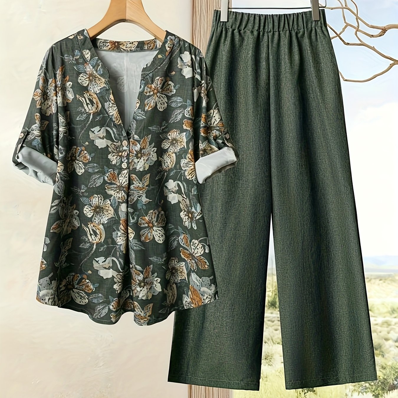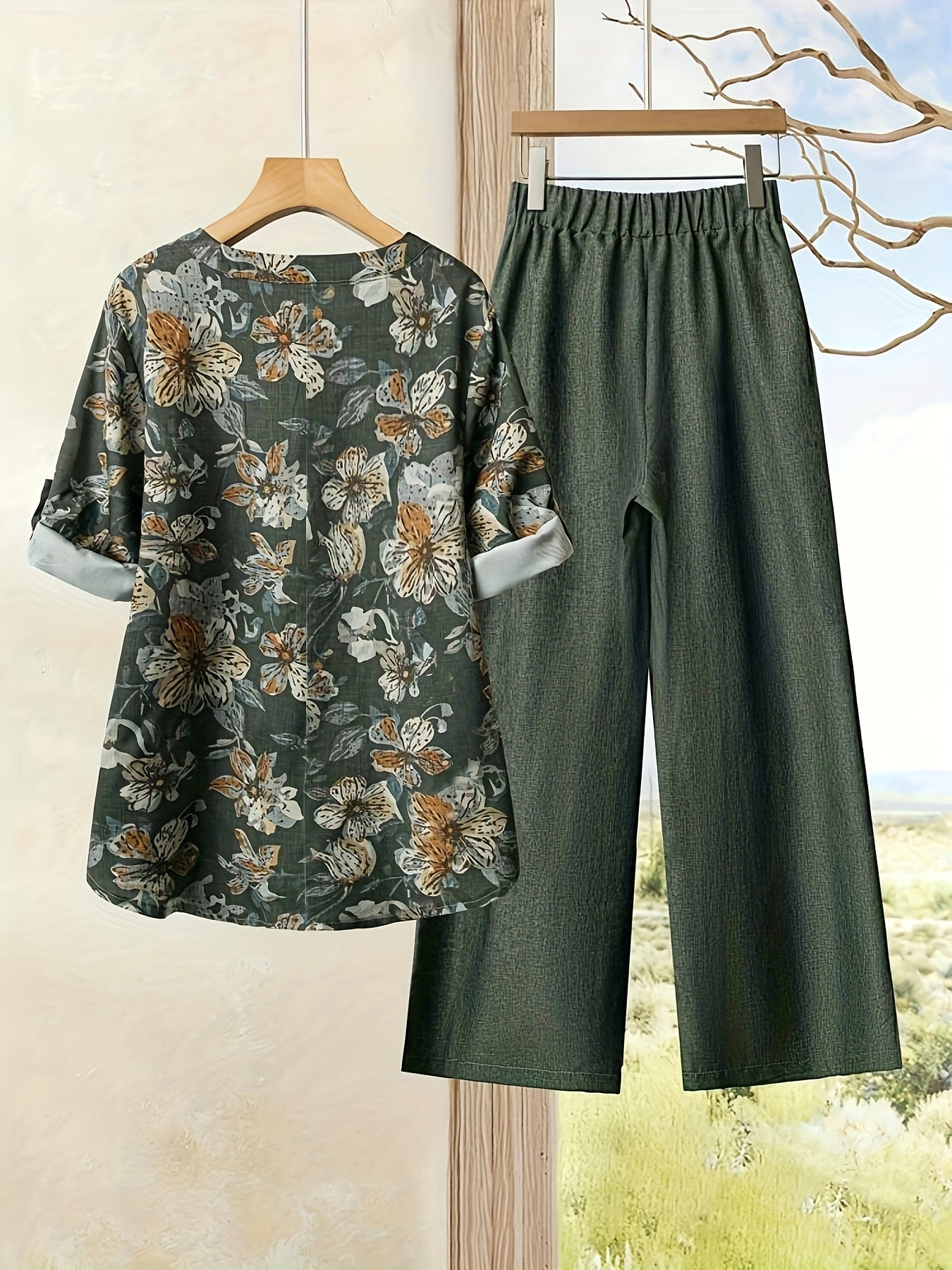 Elegant Floral Print Blouse & High-Waisted Pants Set - Chic Green & White Floral Top with Ruffled Sleeves, Button-Front Design, and Wide-Leg Pants for Spring/Summer, Spring Summer Outfit | Floral Print Blouse | Buttonfront Bl