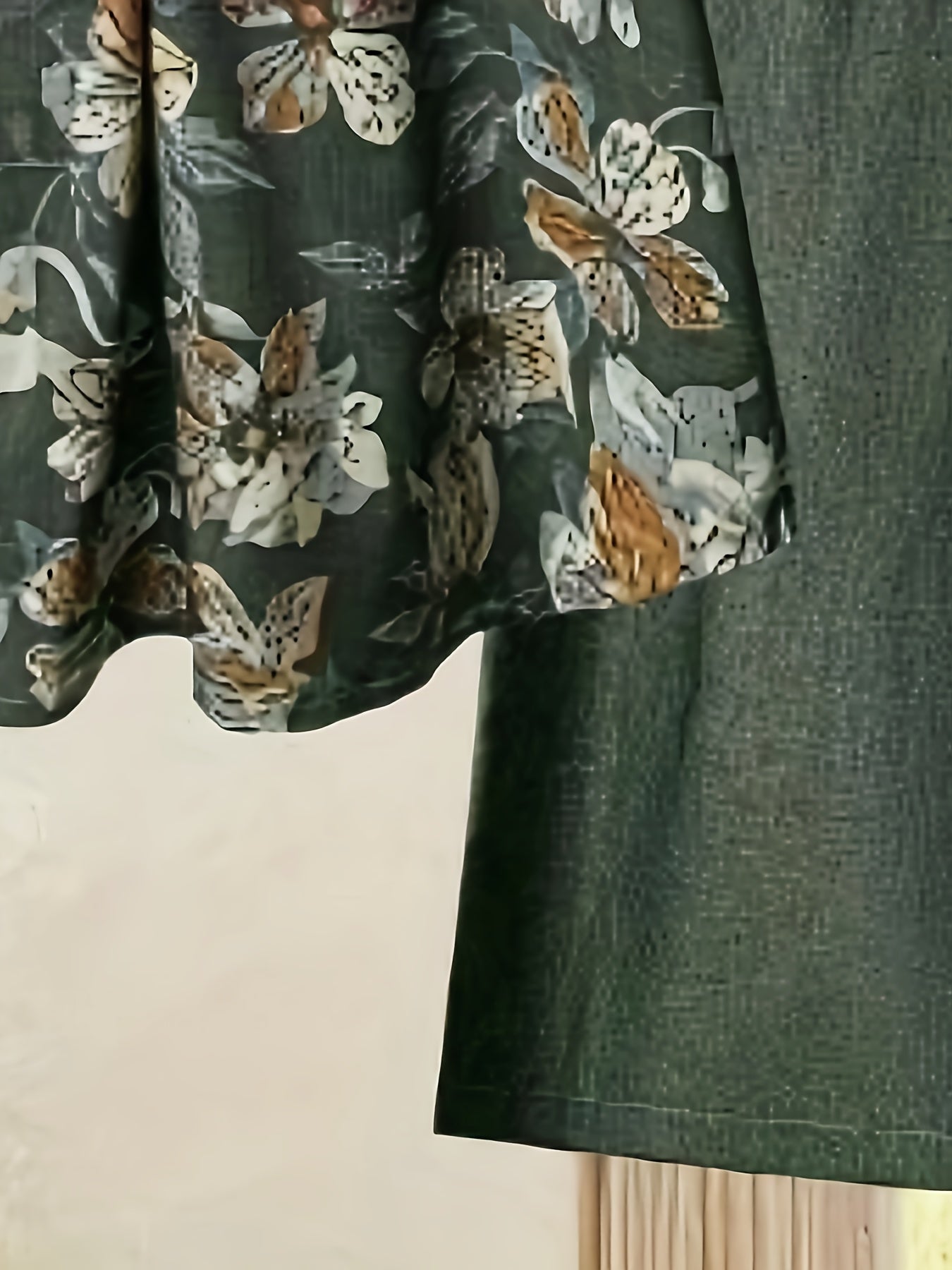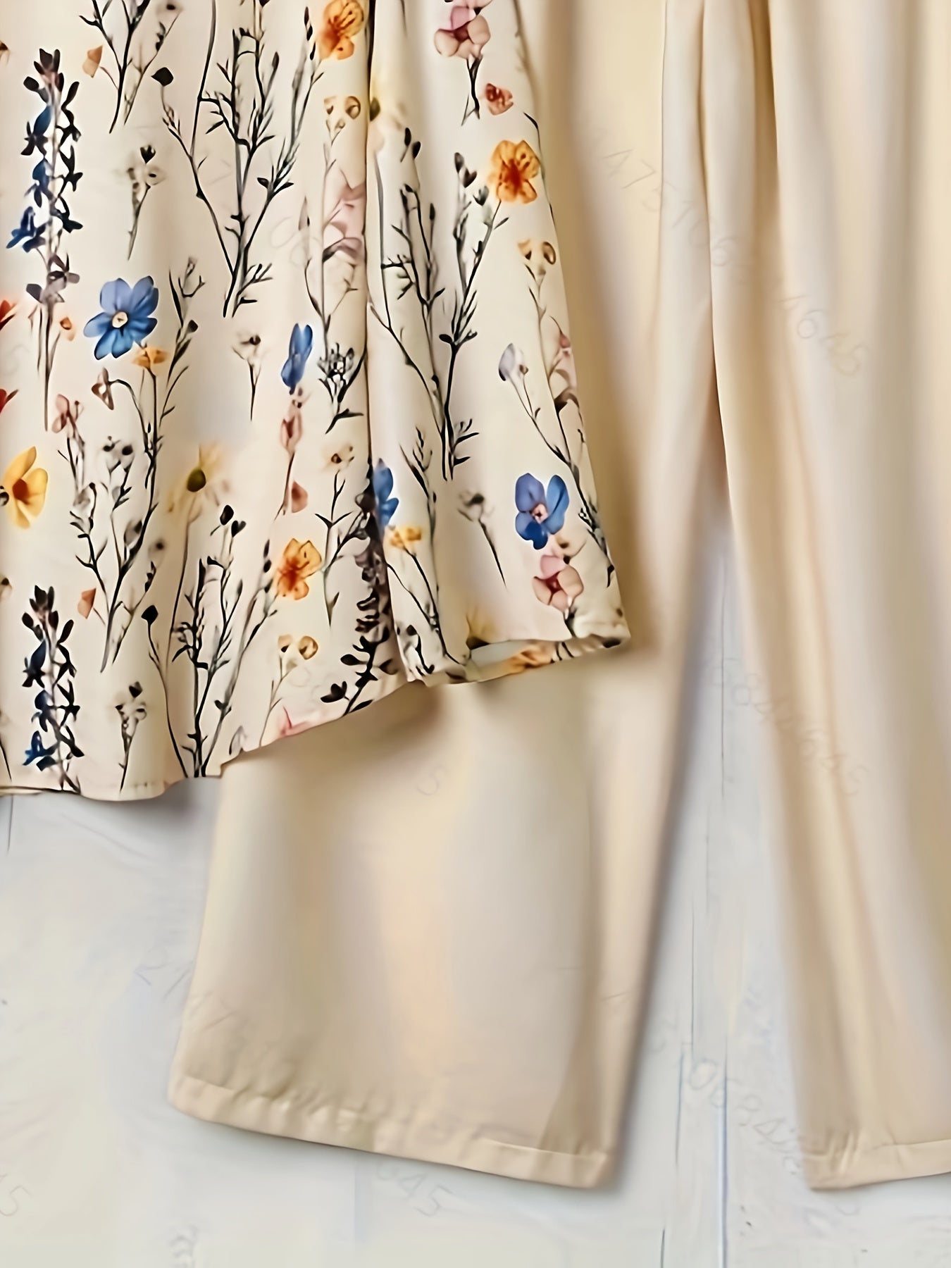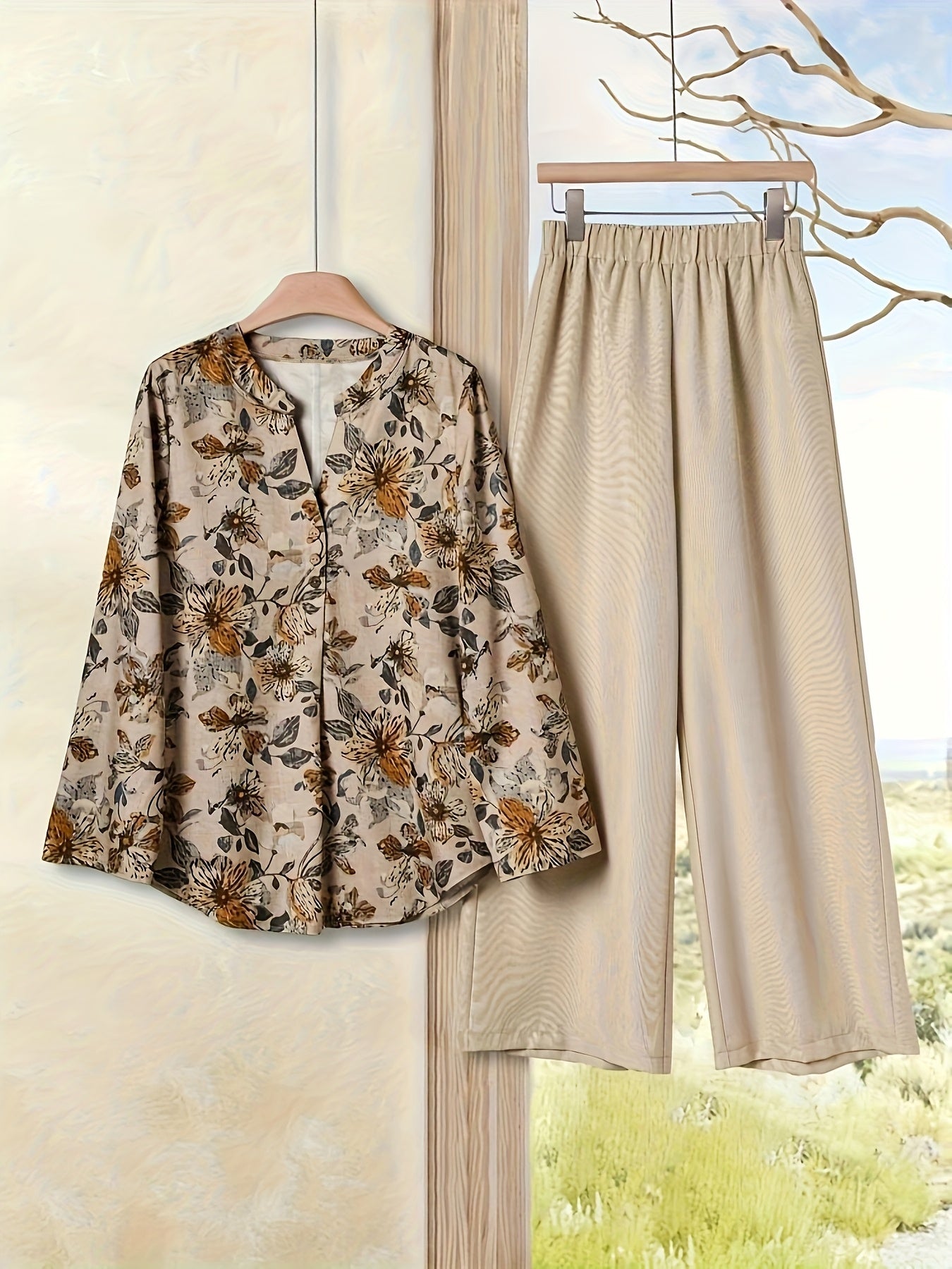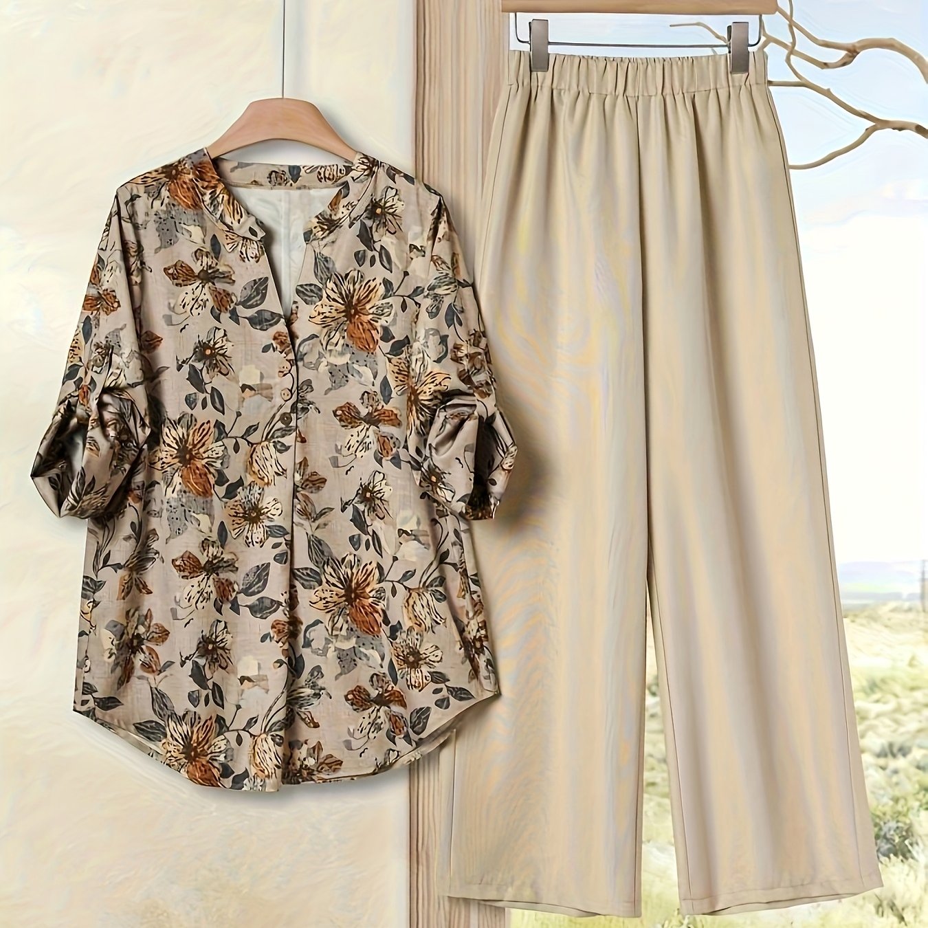 Elegant Floral Print Blouse & High-Waisted Pants Set - Chic Green & White Floral Top with Ruffled Sleeves, Button-Front Design, and Wide-Leg Pants for Spring/Summer, Spring Summer Outfit | Floral Print Blouse | Buttonfront Bl