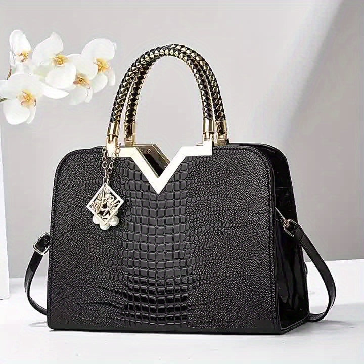 Elegant Tote Bag for Women, Large Capacity Crocodile Pattern Shoulder Bag, Lightweight with Zipper Closure, Polyester Lined, Versatile Fashion Accessory