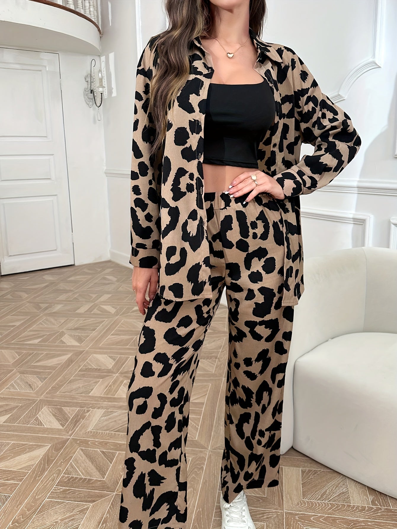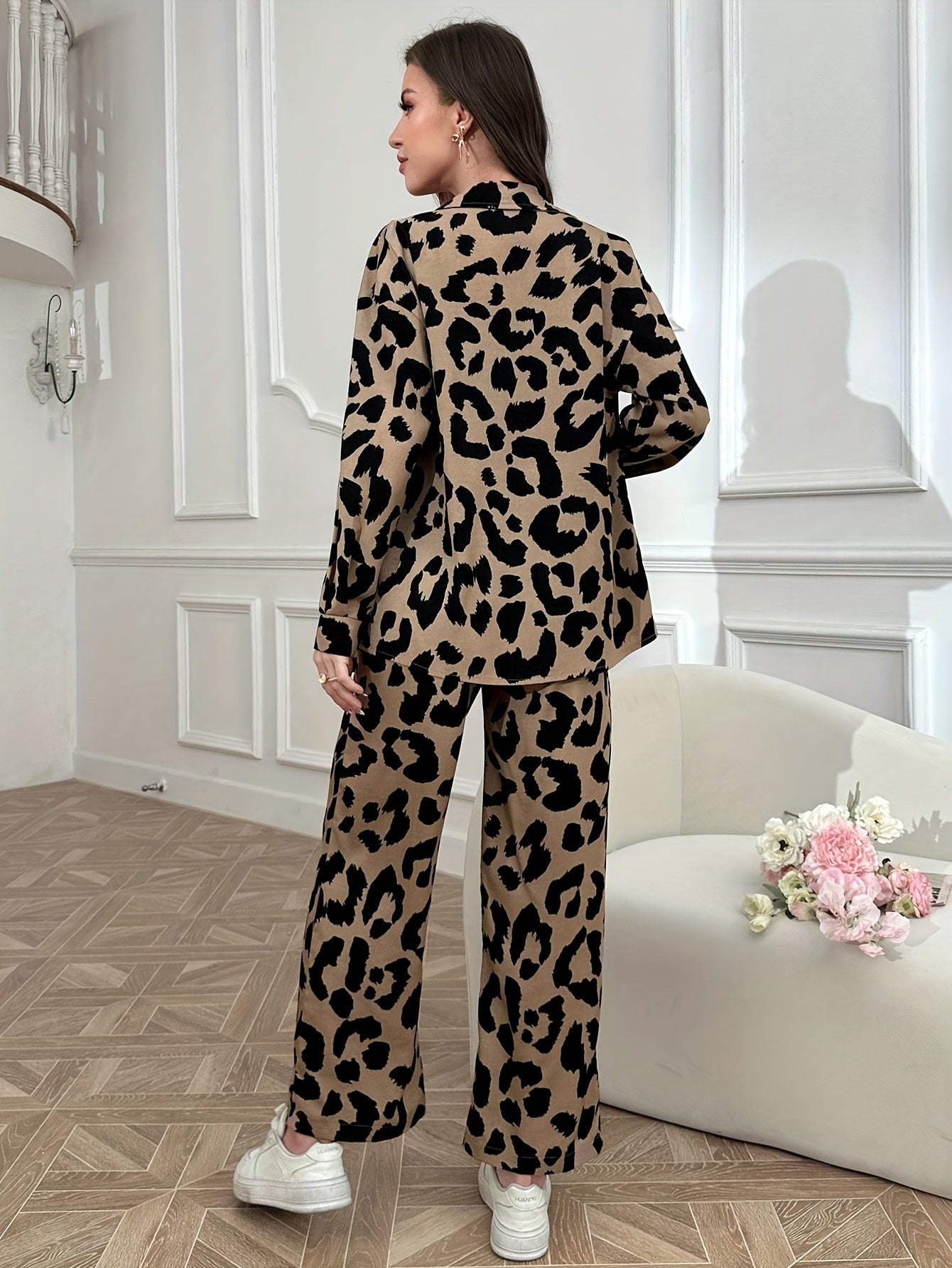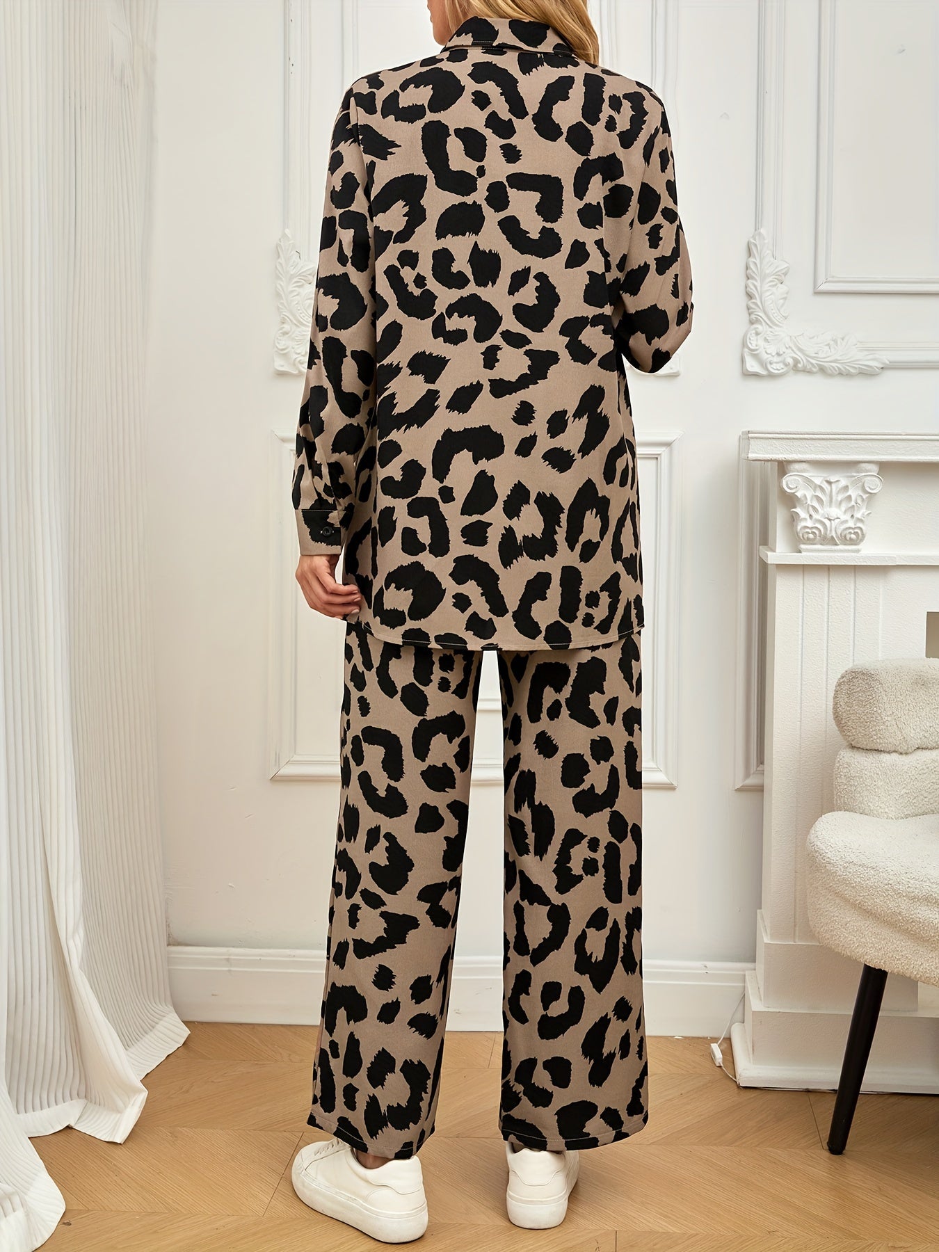 Elegant Women's Leopard Print Pants Set - Polyester Woven Suit with Notched Collar, All-Season Fashion Statement