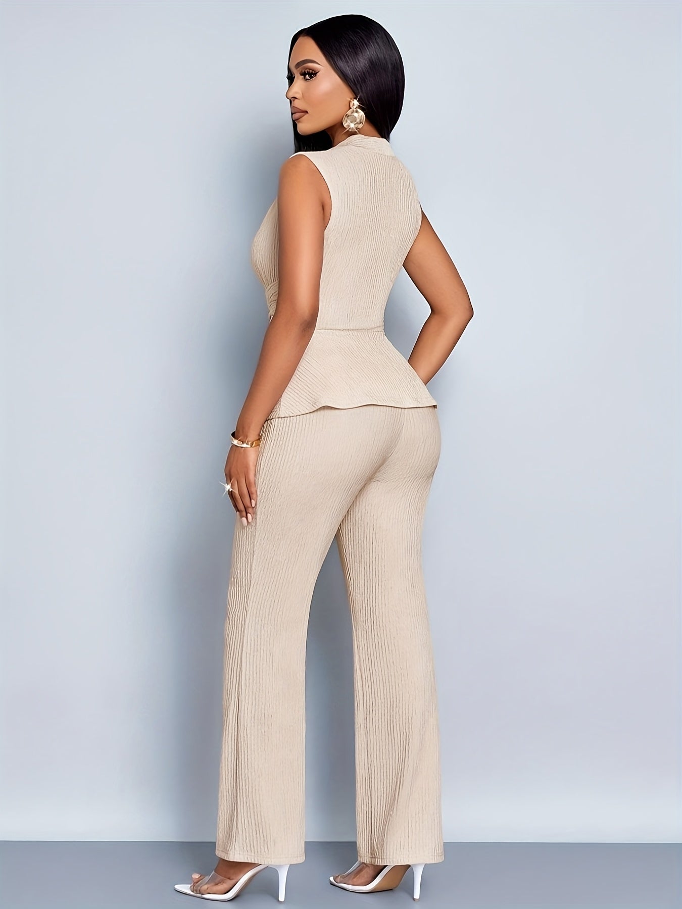 Elegant Women'S Two-Piece Set, Sleeveless V-Neck Top & Wide-Leg Pants, Solid Color, Asymmetrical Design, All-Season Casual Wear, Casual Attire | Asymmetrical Top | Wideleg Pants