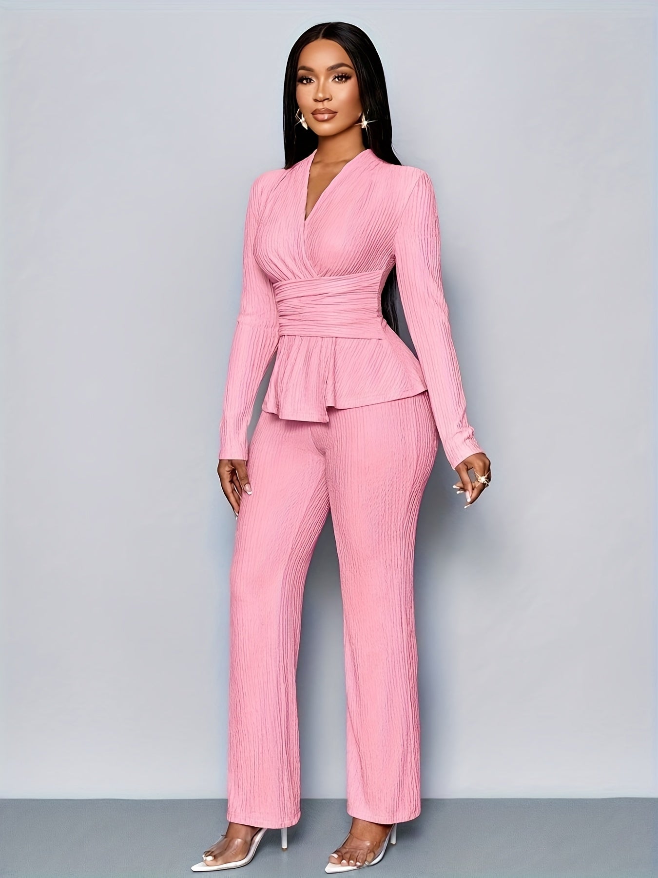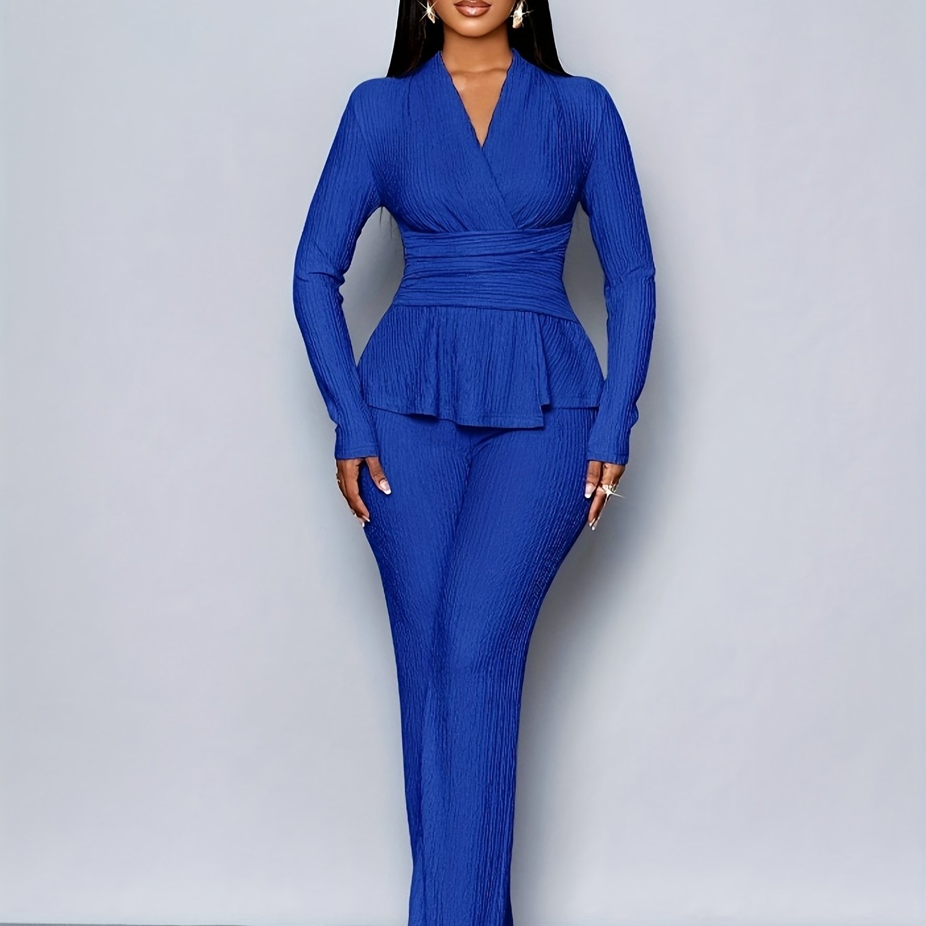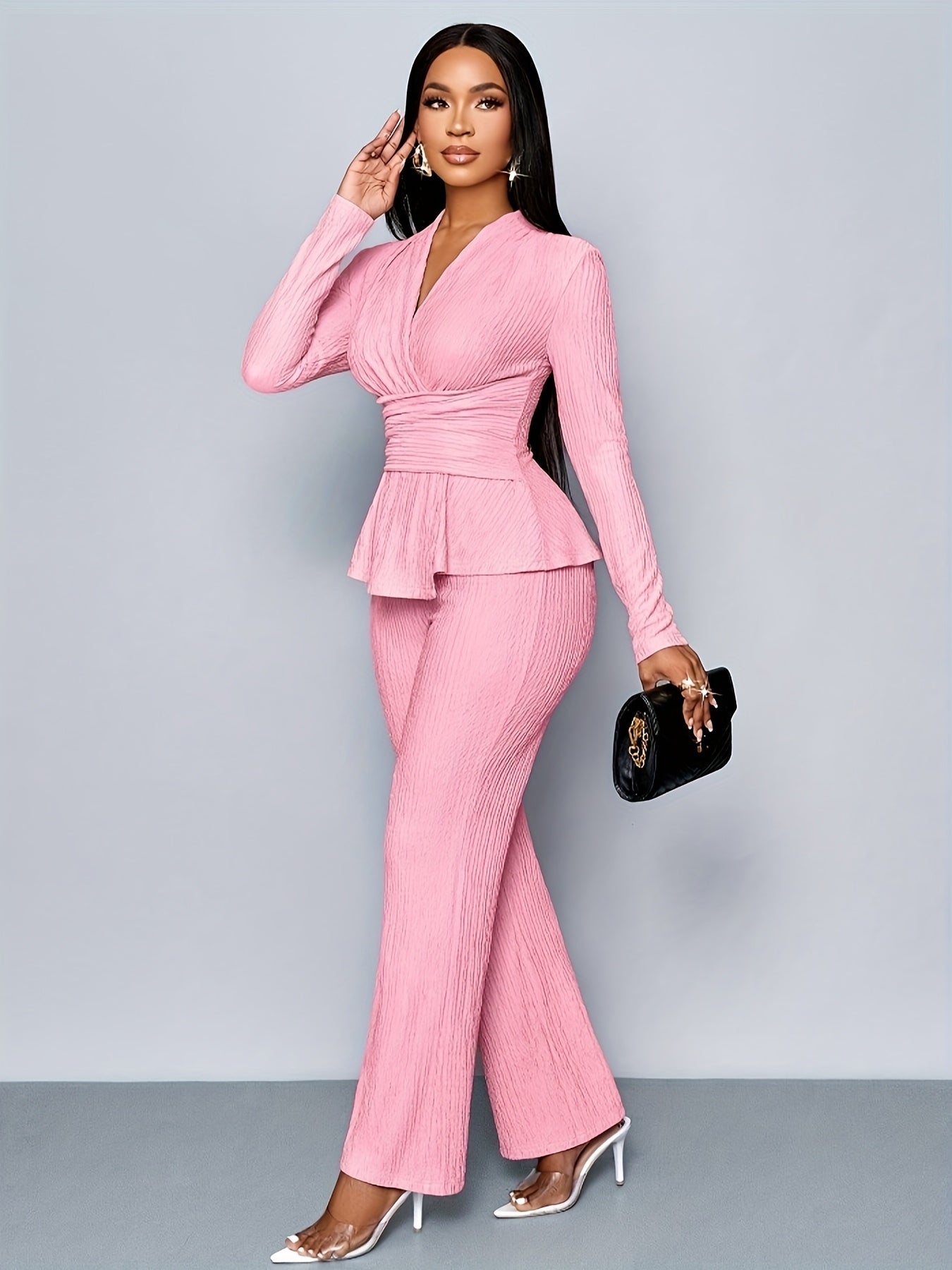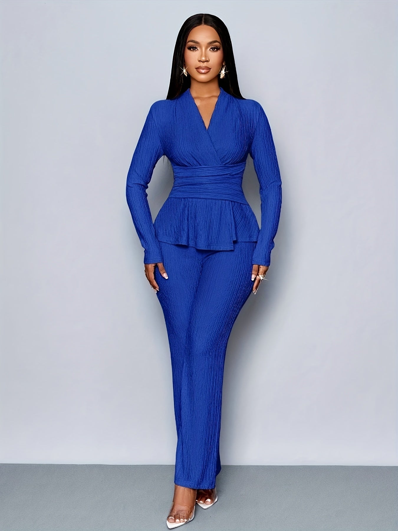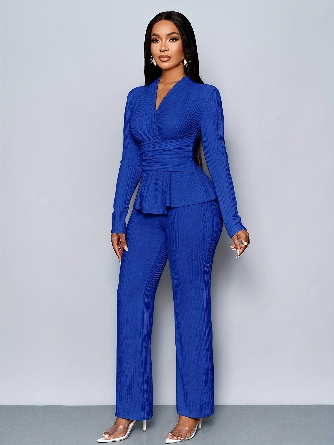Elegant Women'S V-Neck Long Sleeve Top and Wide Leg Pants Two-Piece Set, Asymmetrical Hem Two-Piece Outfit for Casual Daily Wear, Winter Women'S Clothing